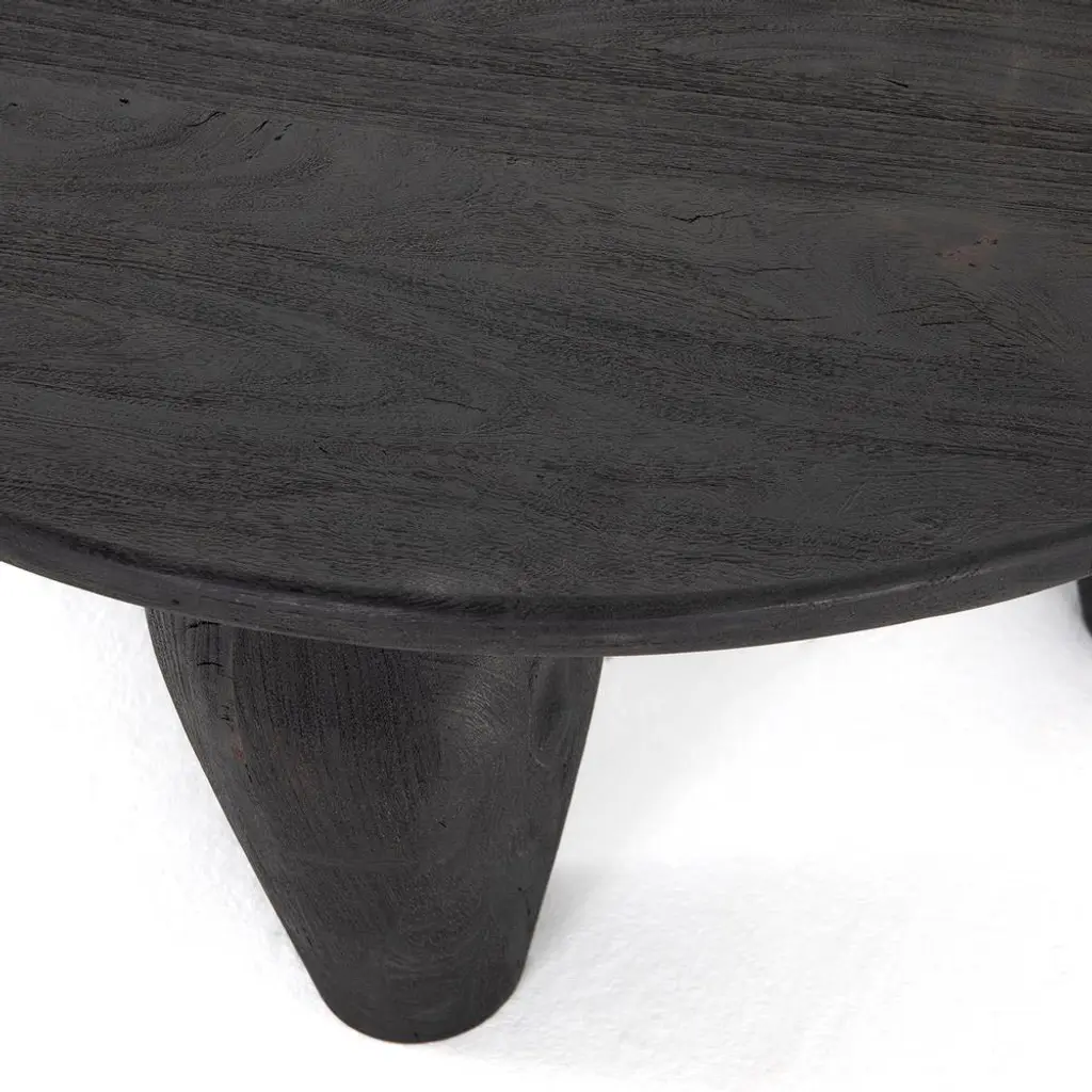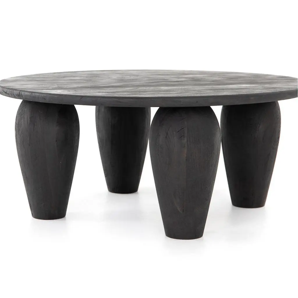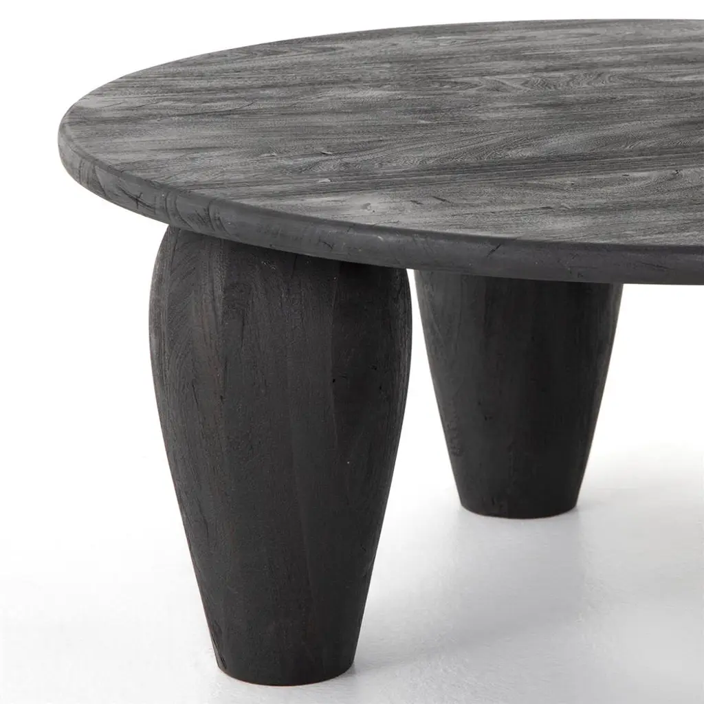 Discover the epitome of rustic elegance with the Amina Rustic Lodge coffee table, meticulously crafted from reclaimed wood in a sophisticated black finish. This round centerpiece exudes a world-traveled charm, making it a captivating addition to any contemporary or traditional living space.