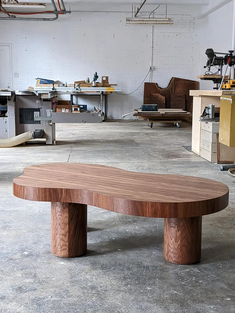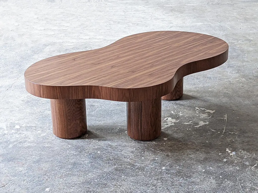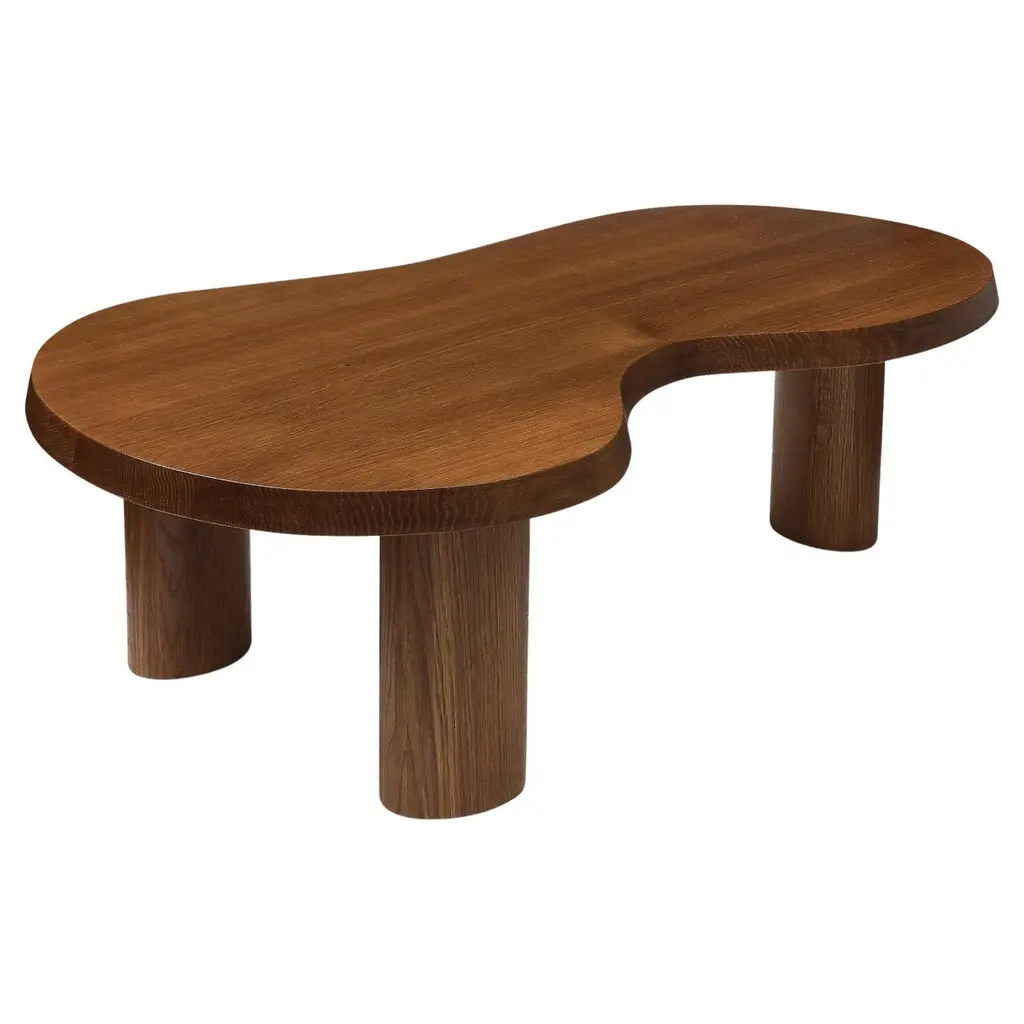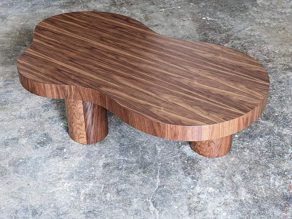 Walnut coffee table based on the style of historical pieces. This coffee table features an irregularly curved tabletop with vertical grain thick-veneered perimeter. Three turned Walnut legs turned from solid wood support the thick tabletop, and a small step at the foot creates a subtle shadow line. This piece can also be ordered to custom specifications in most dimensions and common wood species. Please inquire if you are interested in a custom piece and we will provide a quote or private offer.We do have one piece on hand, which is available at minimal lead time. It is constructed in Oiled Walnut (as pictured) which measures 49.5" L x 27" W x 16" H.