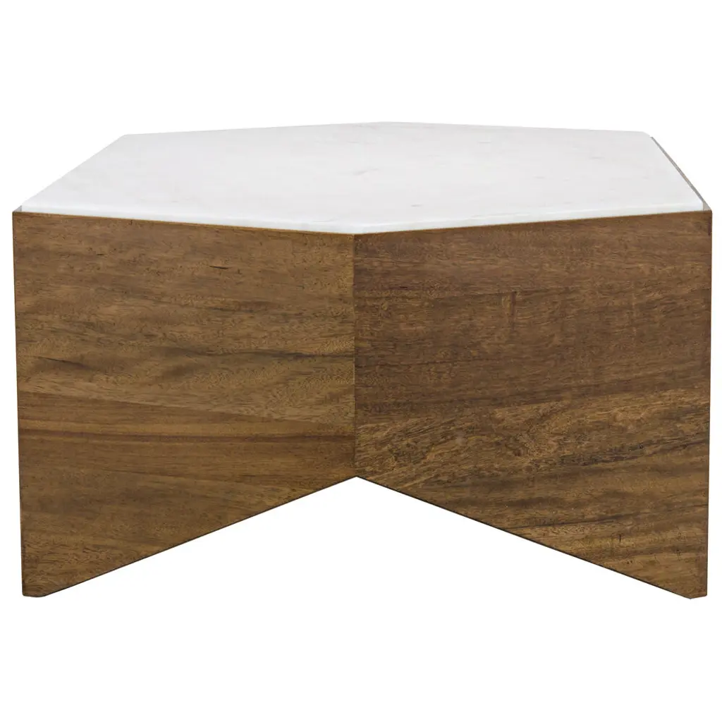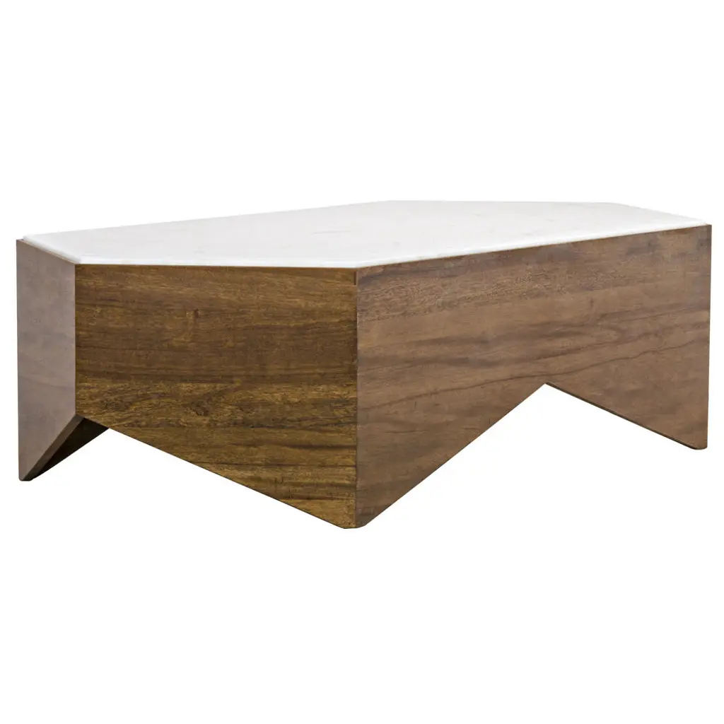 Topped with a hexagon of marble, the base of this curious coffee table has been hand-carved of walnut. The wood is cut into multiple angles with a hand-applied dark finish to enhance its natural grain. No two pieces of stone, and therefore no two tables will be identical.