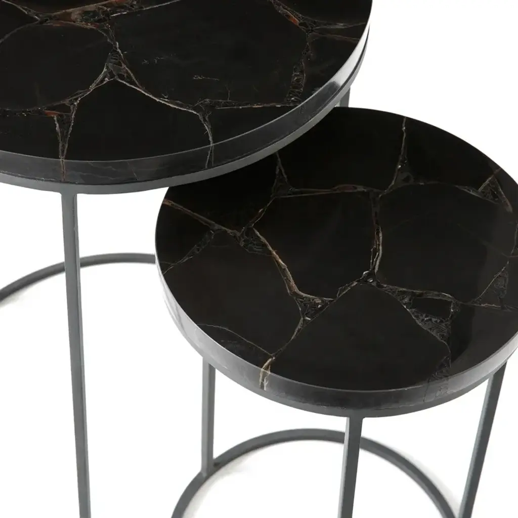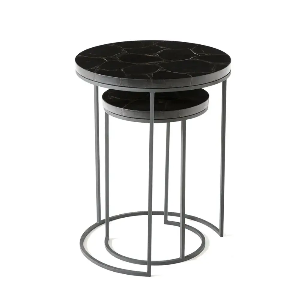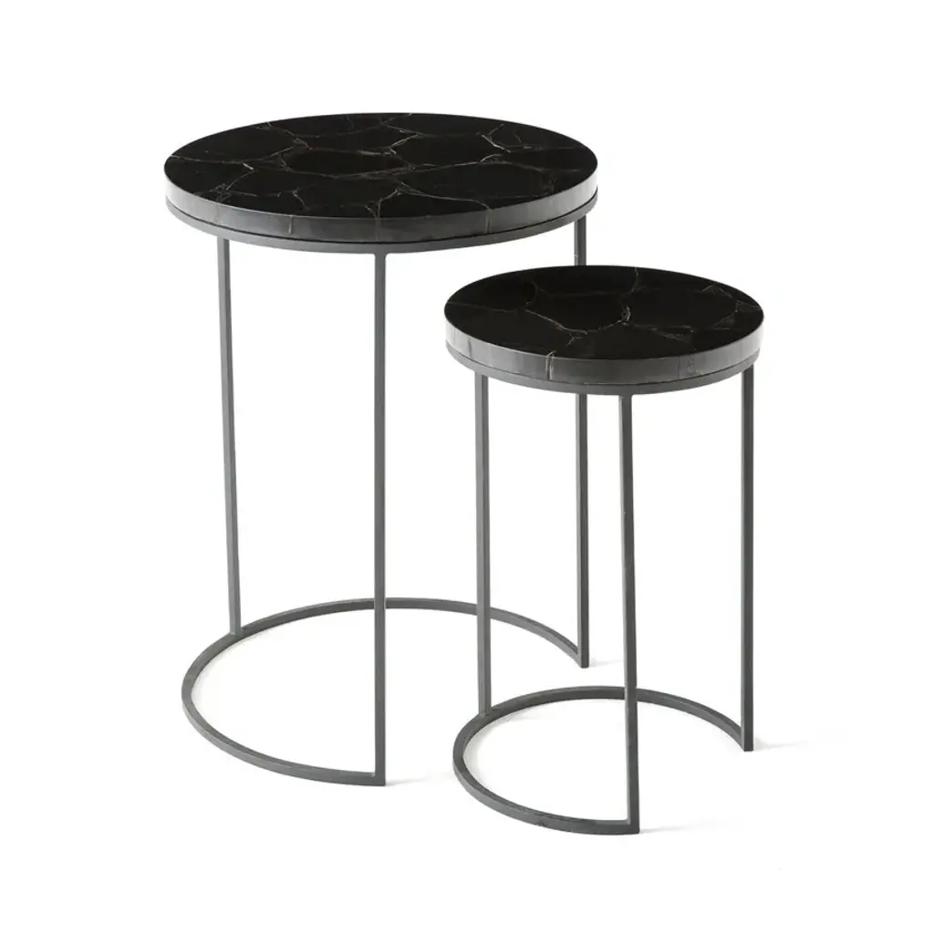With this set of 2 Anaximène tables, mineral invades the interior and offers unique motifs, giving free rein to the imagination. Simple lines and the luxury of natural black agate, these stackable tables are unique and precious.Natural agate top covered with resin.Each piece is unique.Metal frame in matt epoxy finish.