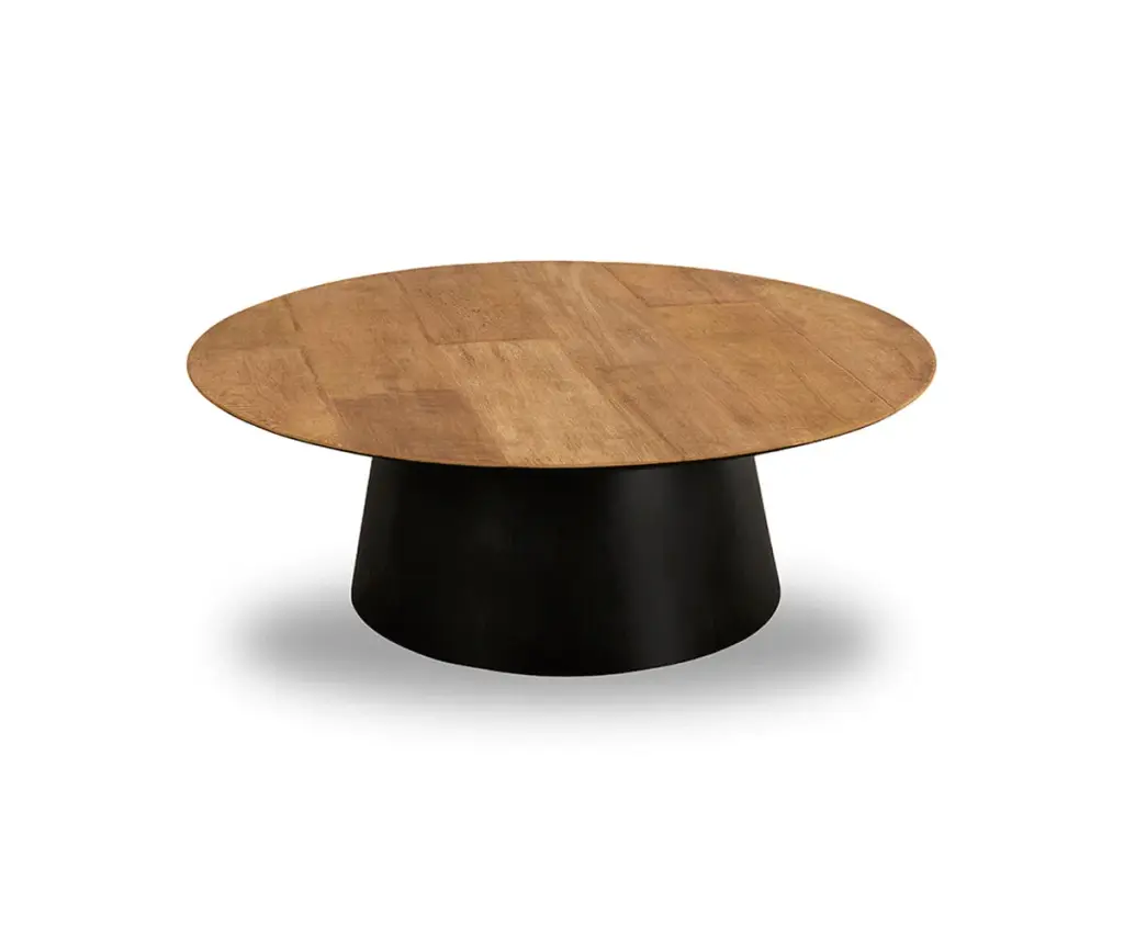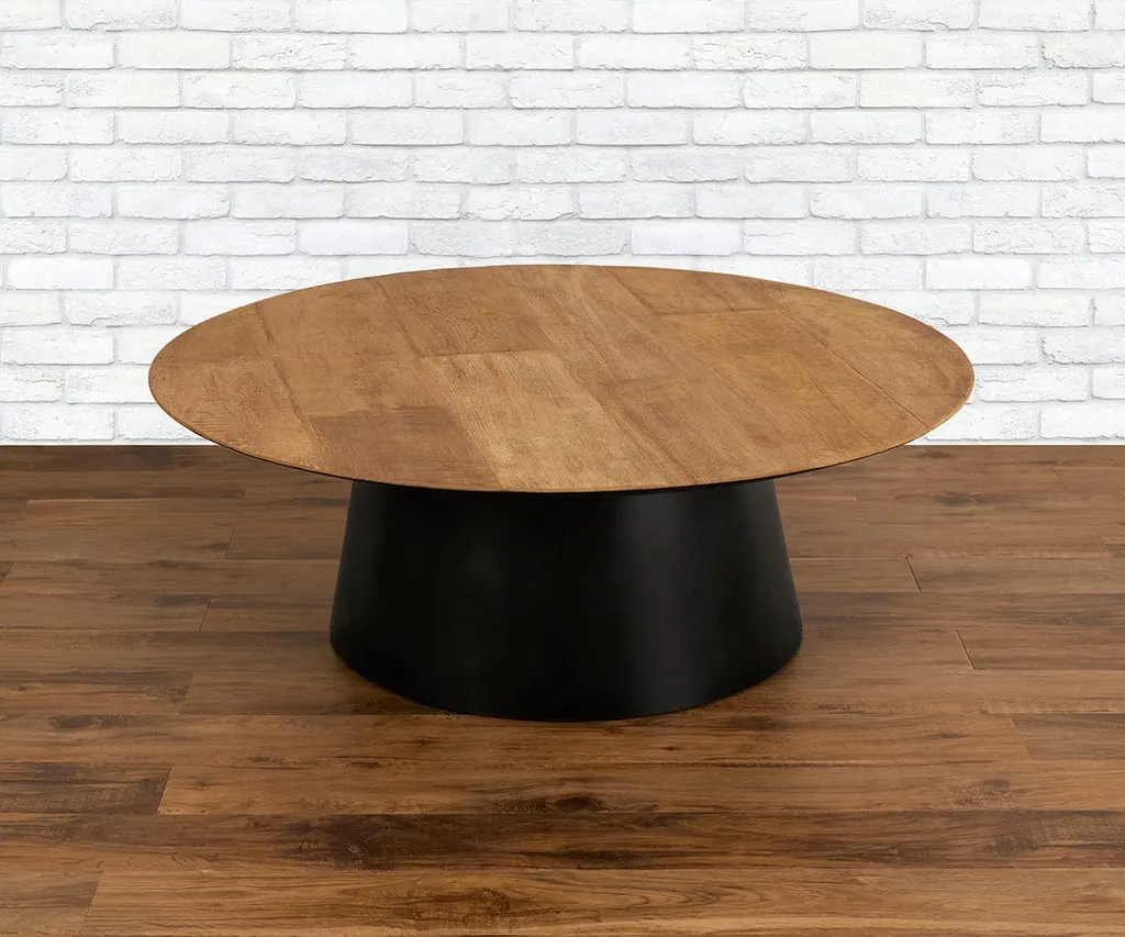 With a bold pedestal shape and mixed-material design, the mid-century Andor Round Coffee Table is intended to be a statement piece in any setting. The modern black metal base is warmed by a reclaimed teak top with rustic-inspired wear marks and a matte finish, so it will instantly elevate your space, no matter your aes