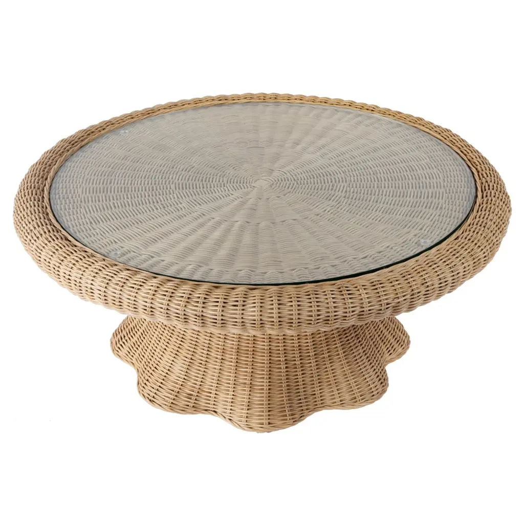 Ansel Coastal Beach Natural Rattan Scalloped Round Coffee Table