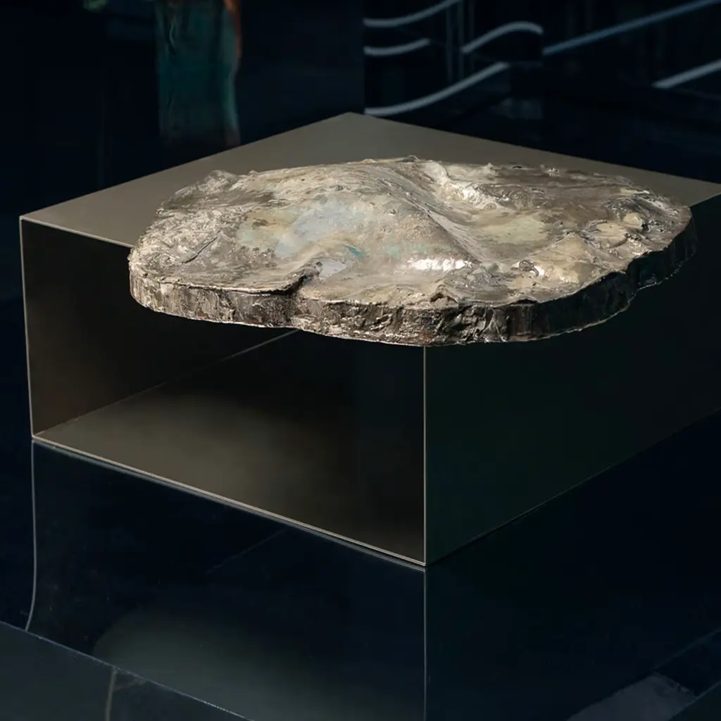 Part of the collection Antarticos, this table is inspired by the water present in Antarctica, made up of melting ice, freshwater, and rocks, of mosses and lichens. It recalls that harsh but evocative land destination of explorers and scientists. Made of cedar solid wood with an iron foot, the product is handmade with epoxy resins and acrylic colors, stucco, and sand; the colors are not deliberately uniform to create shades. Any movements of the wood are part of the uniqueness of the piece. The raw materials used in the manufacturing process differ every time, consequently, there may be natural variations that are not to be considered product flaws.