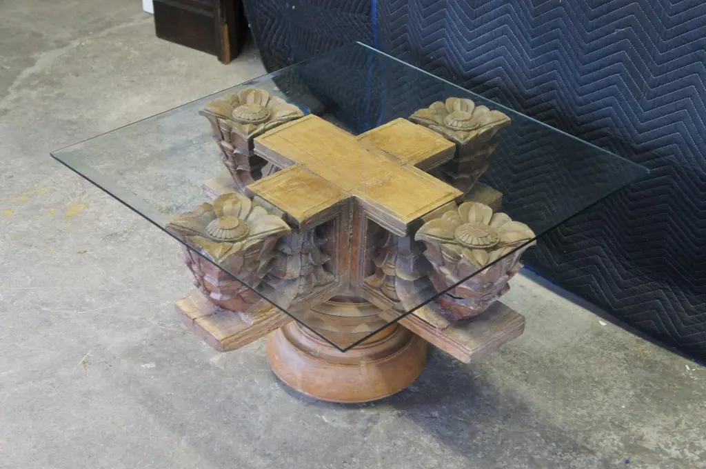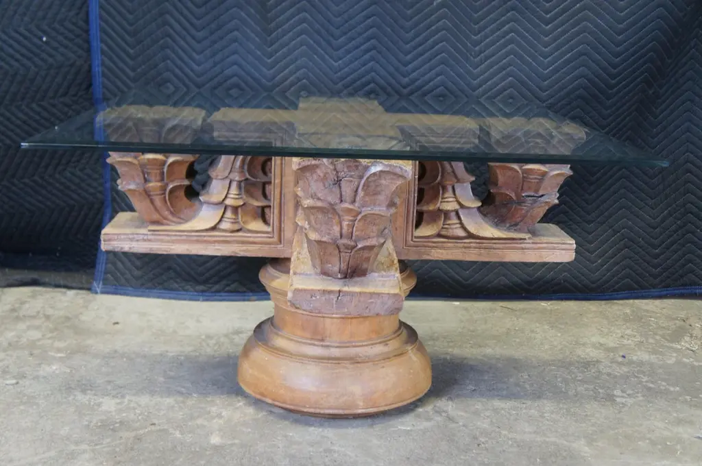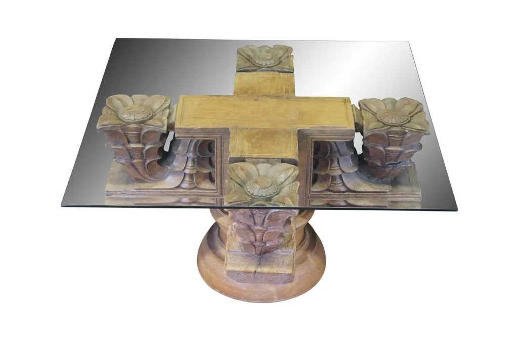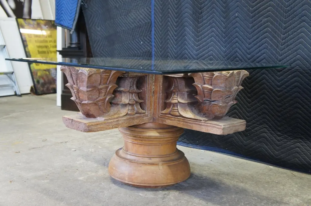 Antique architectural salvage / reclaimed ornamental Temple ceiling mounts. Made of teak featuring a carved floral design with pedestal base and beveled glass top.Dimensions:34" x 34" x 29"