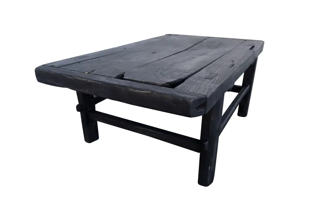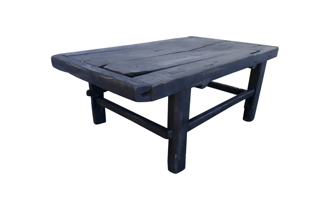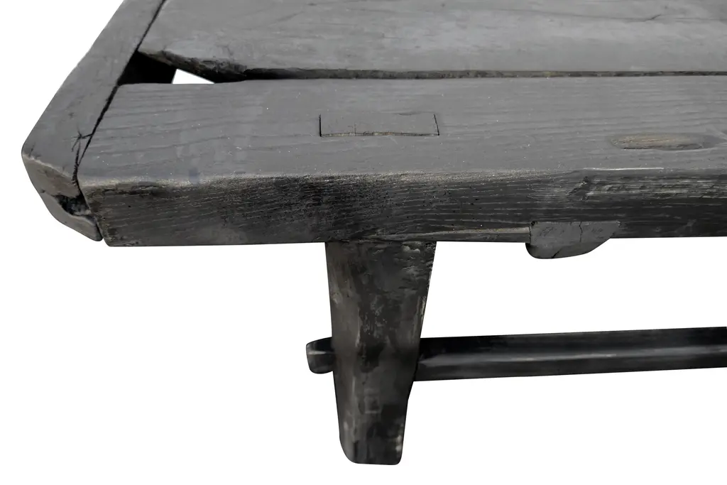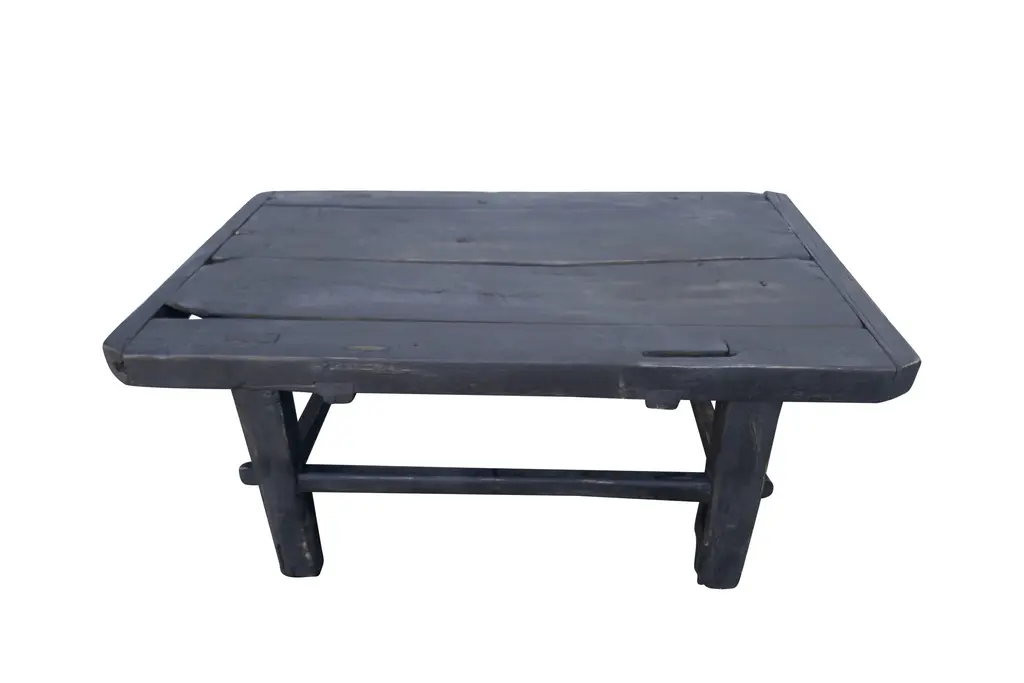 "One-of-a-kind". Authentic antique Asian plank-top table. Hand-made of solid heavy elmwood, primitively constructed with mortise & tenon joinery. This 1 of 1 authentic piece features much desirable age character. Styled with horizontal stretcher bars and end-caps. Matte black finish.