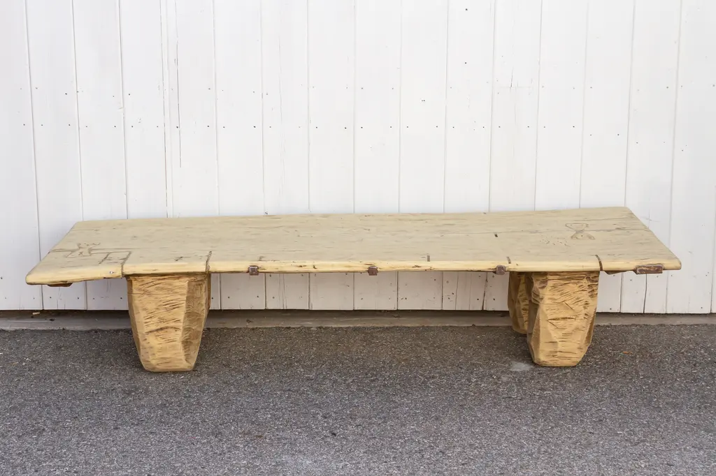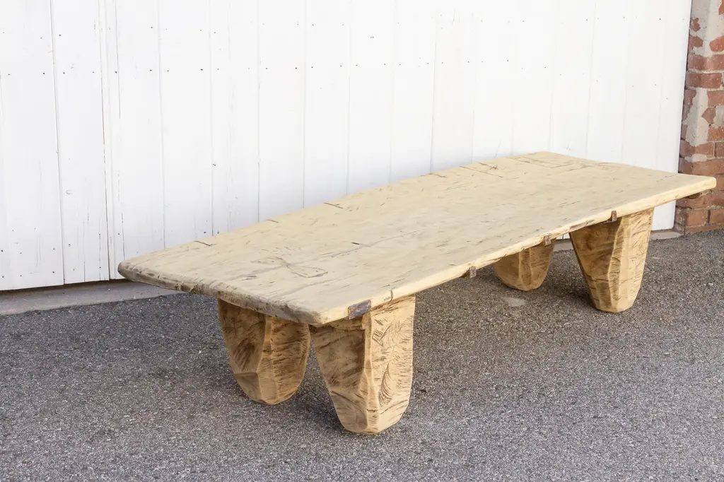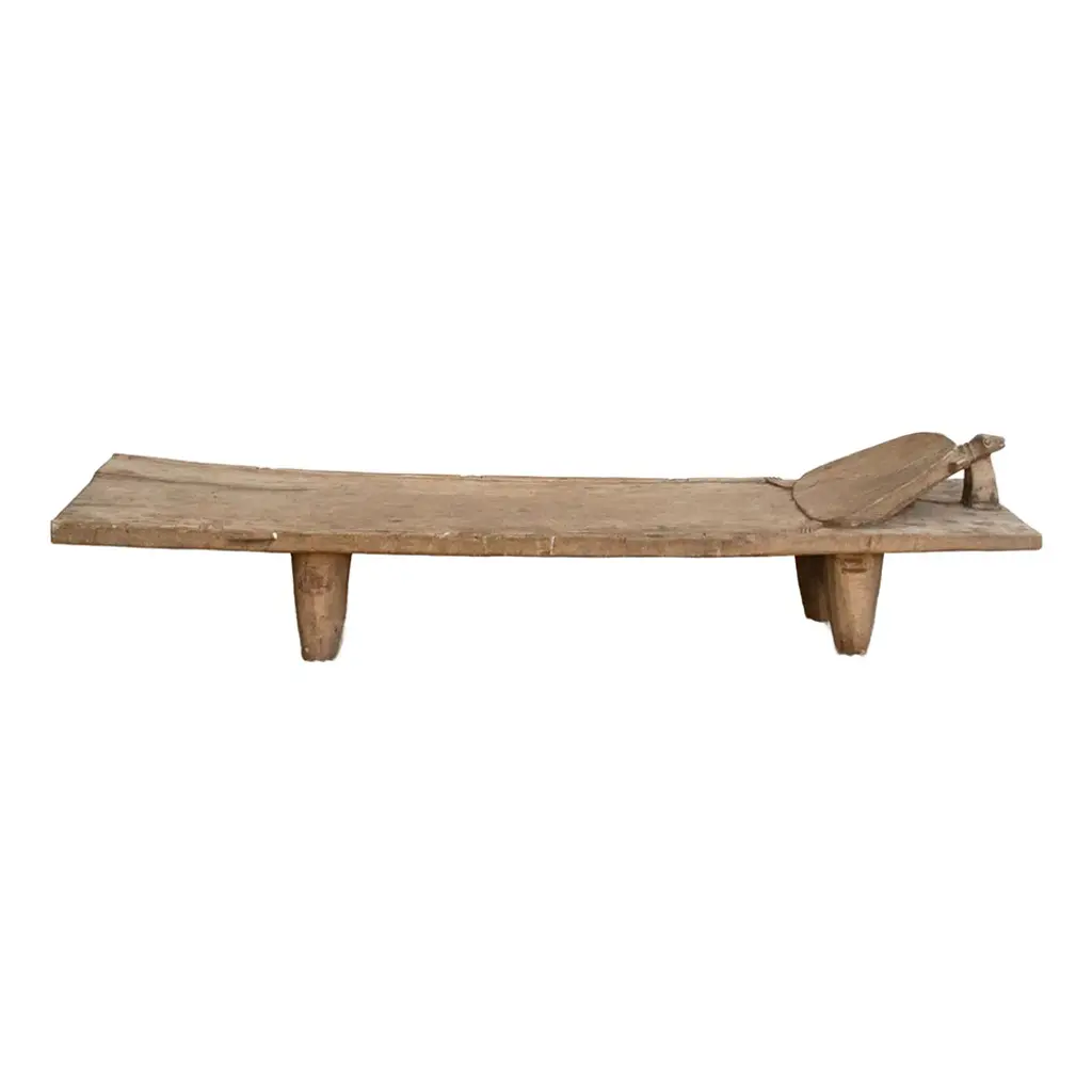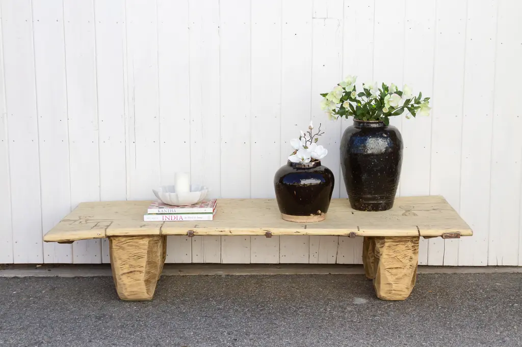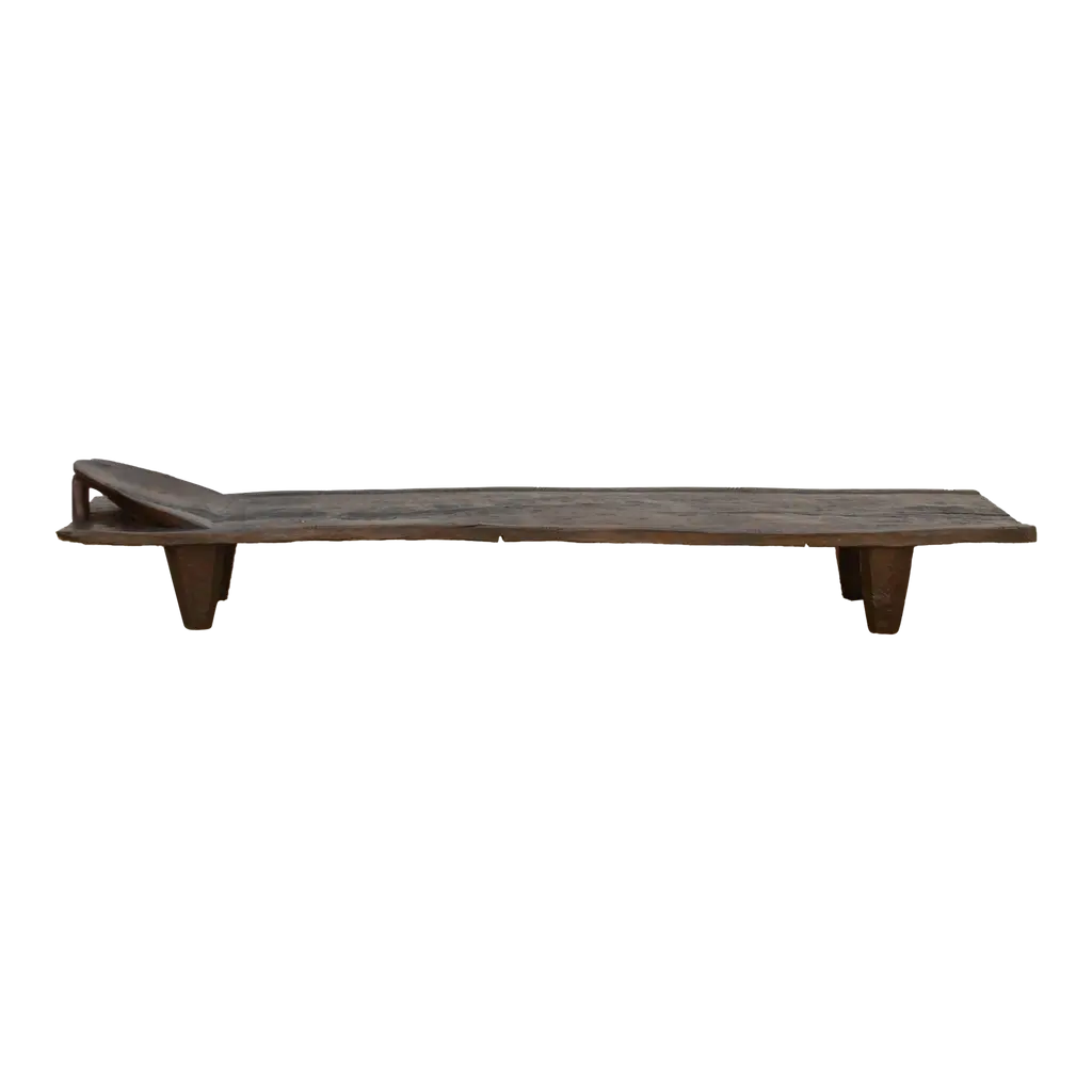 Full of character, this rustic Naga bed is carved from a single tree log which gives it a slightly irregular but full of textured surface. This antique Naga table features four chunky legs and a sun-bleached finish. The top of this antique Naga coffee table is slightly irregular and it has been reinforced with a metal strap underneath.