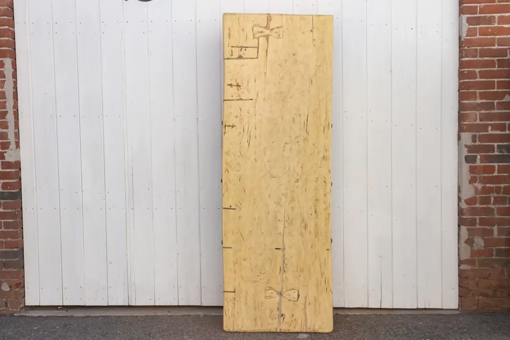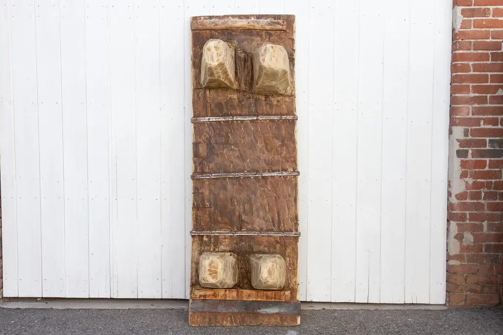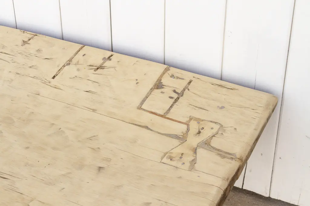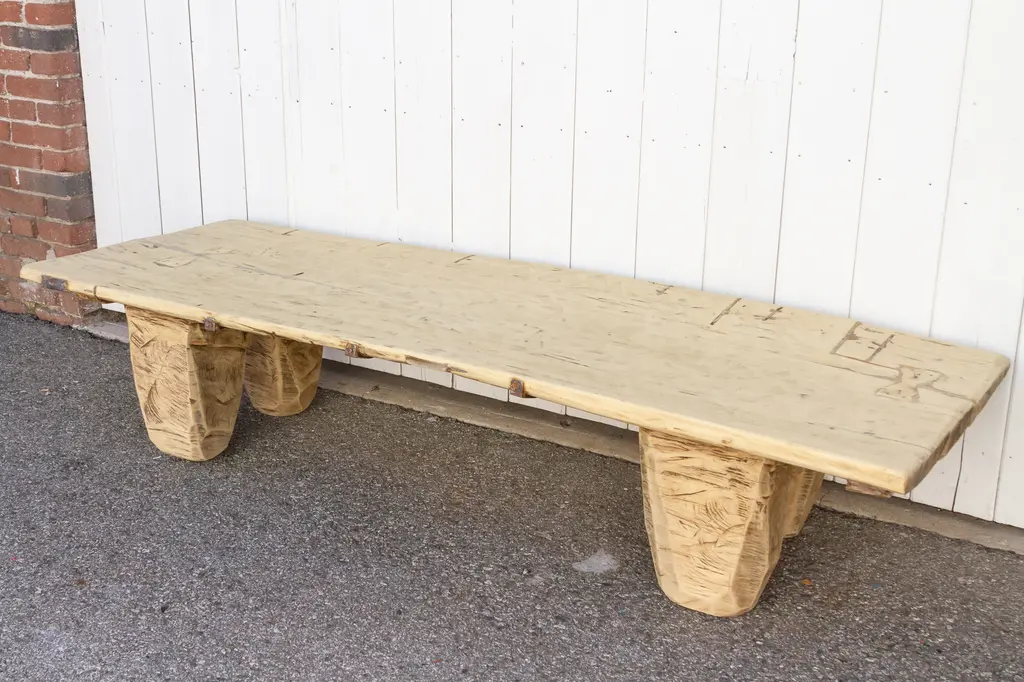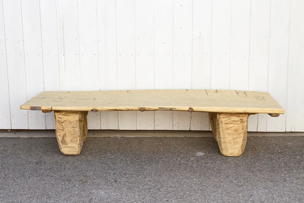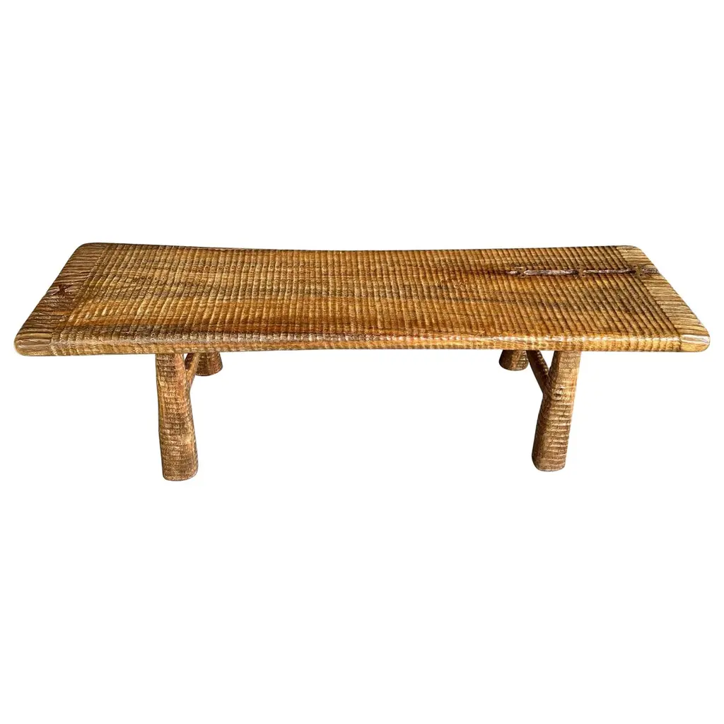 Full of character, this rustic Naga bed is carved from a single tree log which gives it a slightly irregular but full of textured surface. This antique Naga table features four chunky legs and a sun-bleached finish. The top of this antique Naga coffee table is slightly irregular and it has been reinforced with a metal strap underneath.