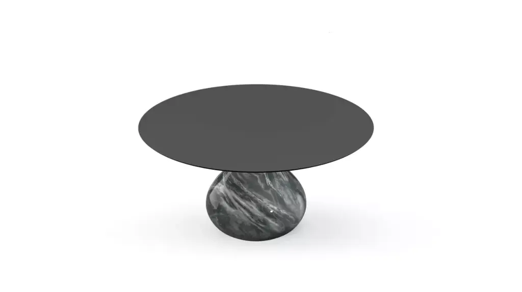 The deceptively simple shape of the Aqua table conceals the incredible craftsmanship that is used to achieve the impressive challenge of designer Fabrice Berrux - making a marble base shaped like a drop of liquid. With the white Carrara or black Marquina marble bases, Aqua can either be monochrome with a color coordinated Fenix-coated top, or contrasting with a black or white top. The Bardiglio gray version is monochromatic but plays on the beautiful warm grey tones of this unique marble. Here, a cocktail table. The collection also includes a dining table and small pedestal tables reminiscent of roly-poly toys.