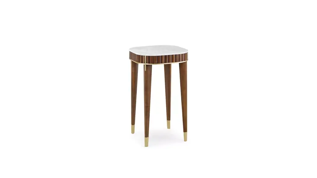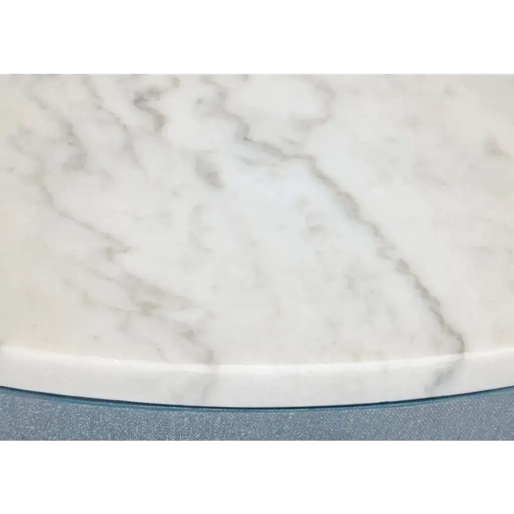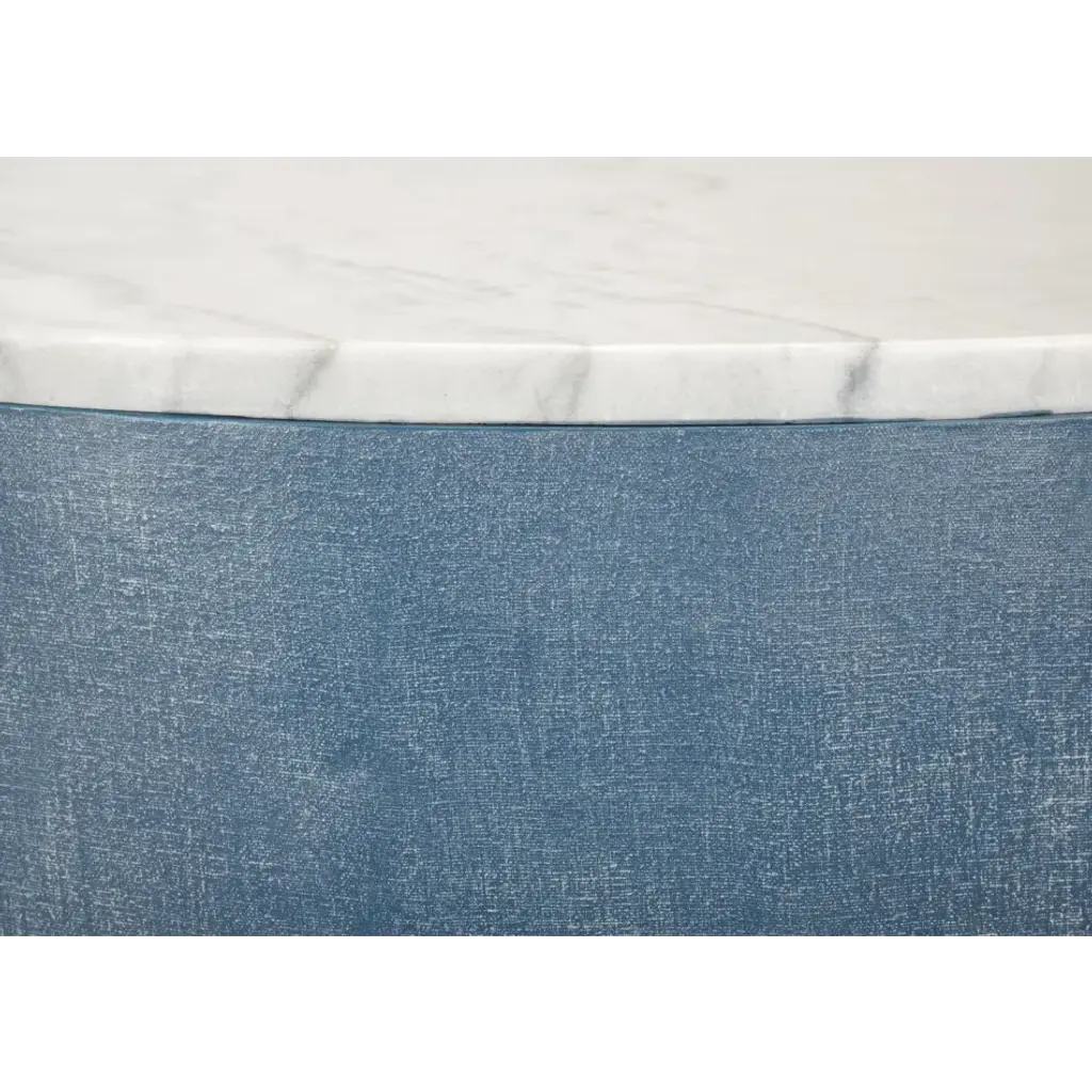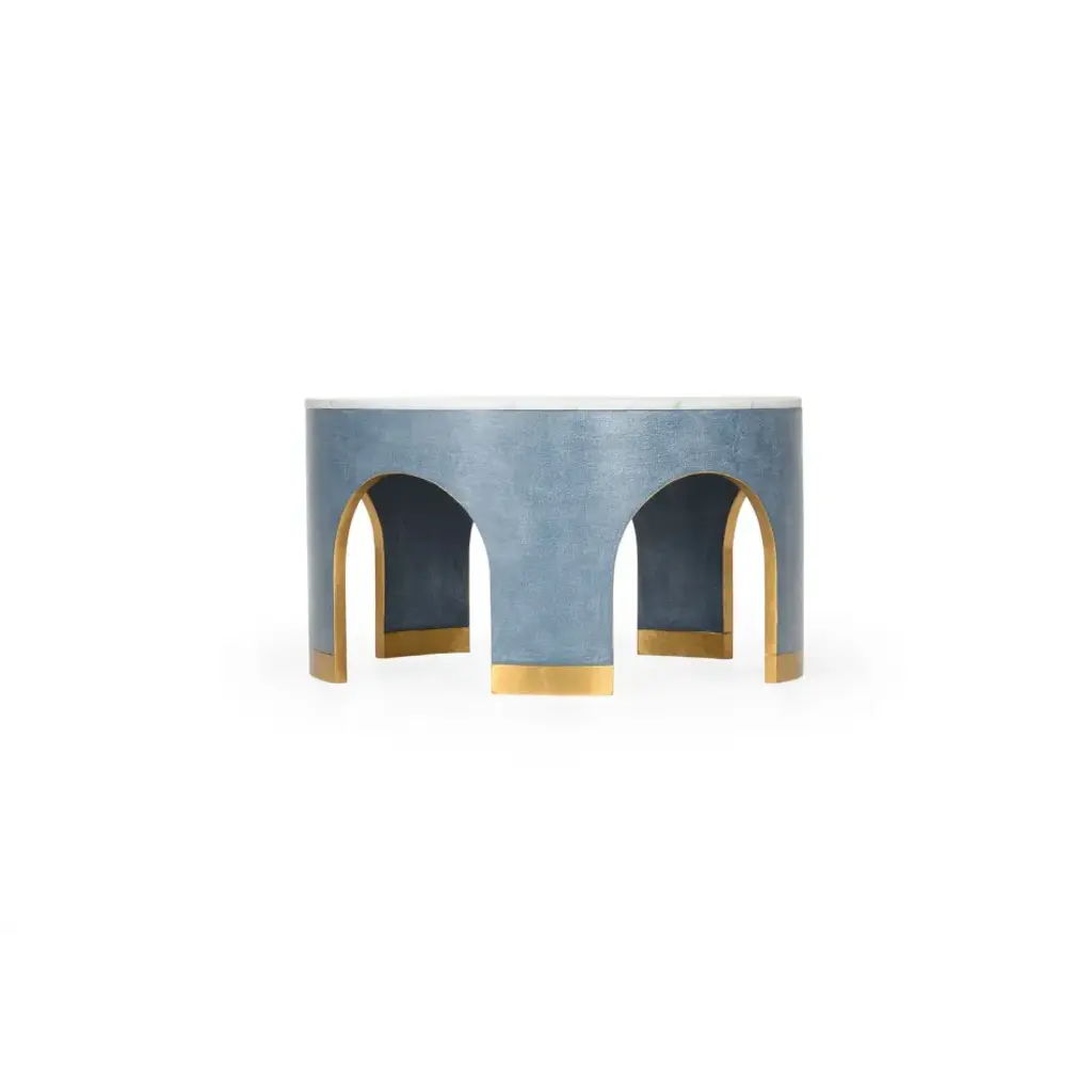 BEAUTIFUL, UNIQUE AND FUNCTIONAL, THE AQUEDUCT COCKTAIL TABLE SPORTS BLUE GRASSCLOTH WITH MARBLE TOP AND ANTIQUE GOLD LEAFED ACCENTS. DESIGNED BY ELIZABETH WICKER.