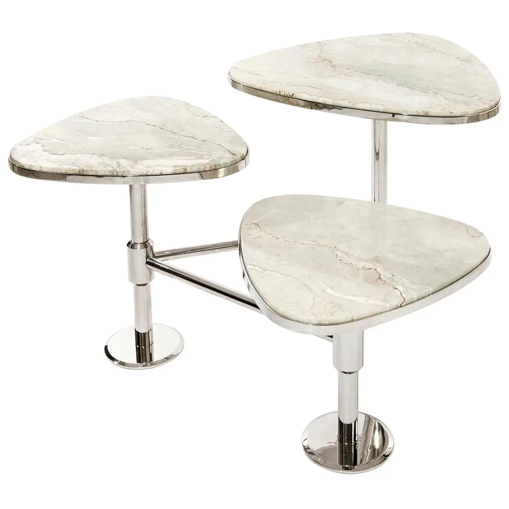 In the design of this coffee table, corners and edges got round and beveled for receiving the light’s sapient game, for inspiring calm and serenity, and for stimulating social relations and conviviality. The shape is also essence: the usage of smooth lines, colors, and materials benefits our mind gifting us with personal spaces which can grant wellness to us and to the people we care about. Metal structure, marble top in smooth Arabescato Corchia.