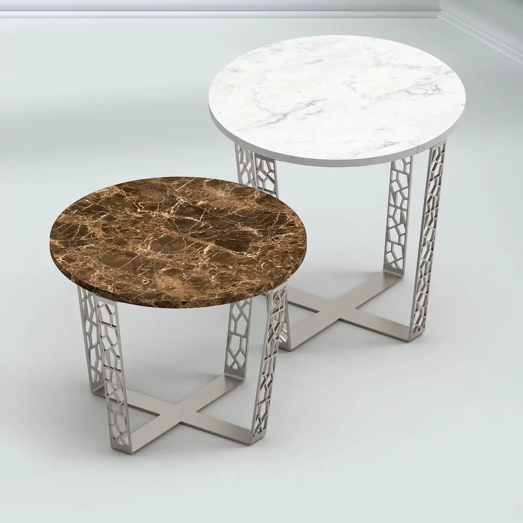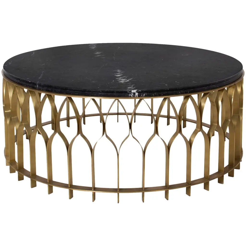 Sophisticated coffee table in arabesque style with aluminum structure, ffeaturing a precious champagne finish. The elegant dark emperador marble top is available in two different heights, the base has bronze finish. The possibility of customization represents an added feature. The table is the perfect addition to modern and refined environments.