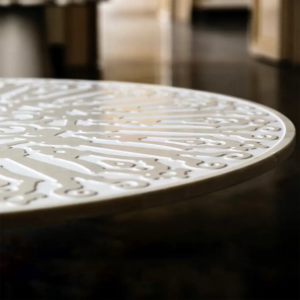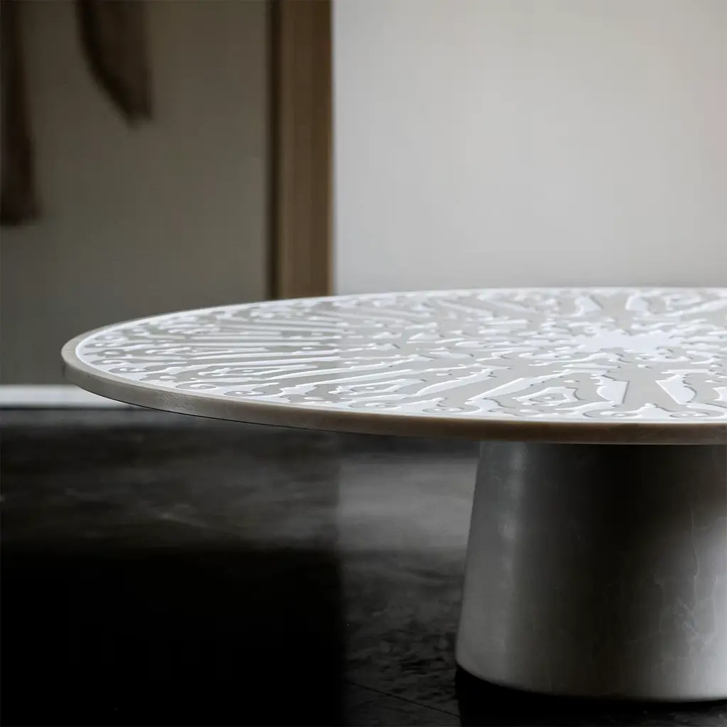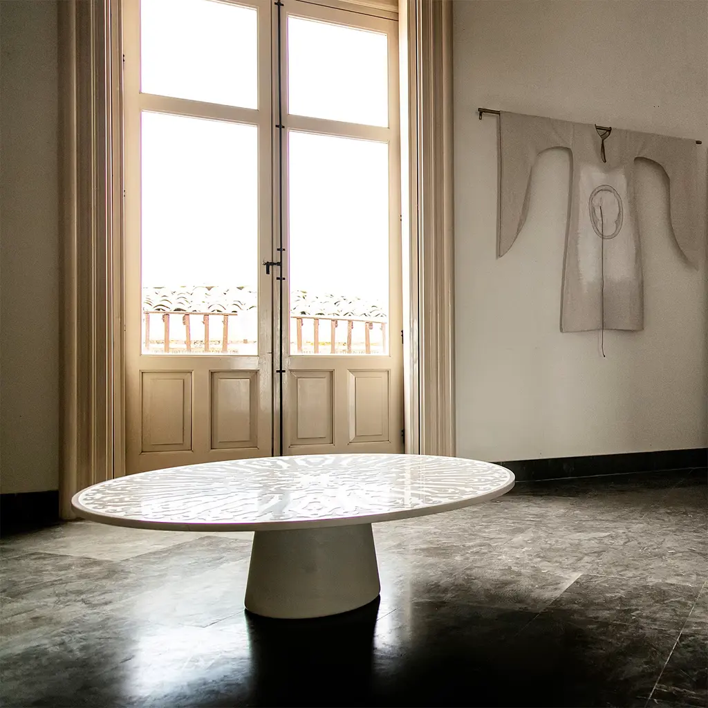 This extraordinary 2021 design by Roberto Semprini will make an elegant statement in a modern interior as well as in a traditional decor style. The table is inspired by the decorations of the court of the wonderful Convitto Cutelli in Catania, Sicily. The table is entirely handcrafted of marble, it features a sinuously lined top and a conical base in pure marble.