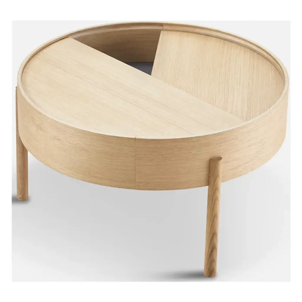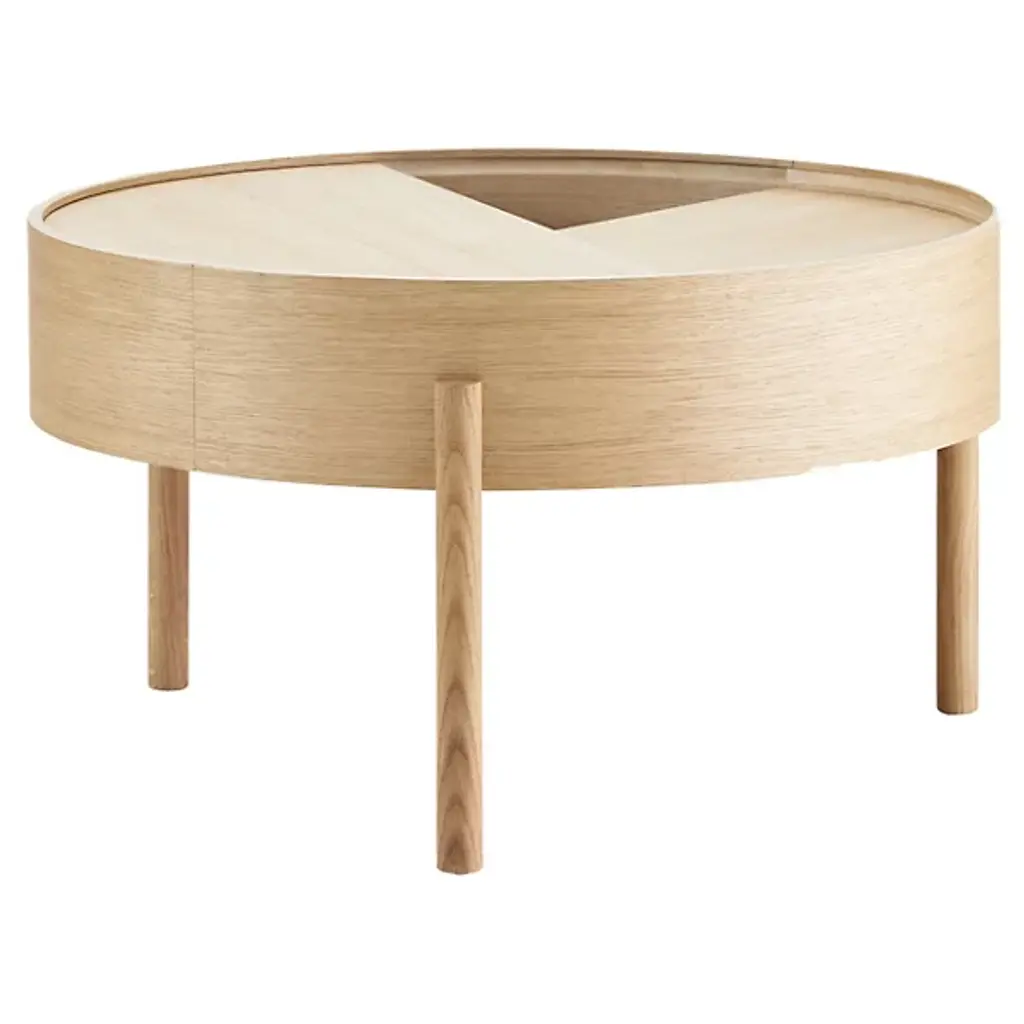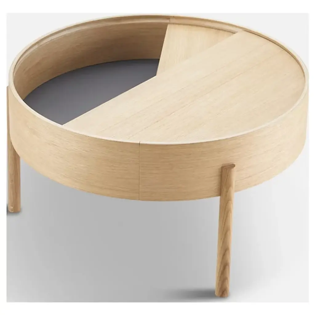 Presented by Woud and designed by Danish talents Ditte Vad and Julie Begtrup, the Arc Coffee Table is a rustic modern and contemporary composition. Made in Latvia, it features a round, wooden bodice and deep storage capability within the center. A sliding top allows for infinitely versatile arrangement possibilities. You can completely close the Arc to conceal what’s inside or strategically keep a portion of it open to reveal pieces of choice.