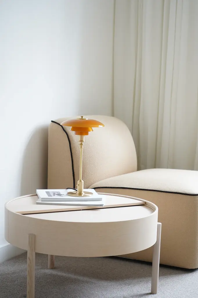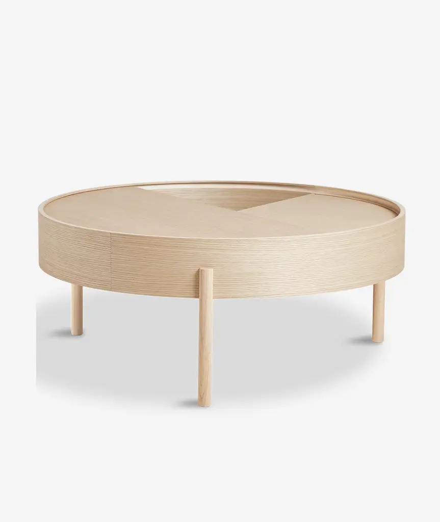The Arc table invites its user to make use of the simple functionalities, use one finger to turn the upper tabletop. Let it be open with your favorite objects on display or close the lid to hide your mess. The surface on the inside storage space is covered with a smooth nanolaminate to complement the wood while the three-legged construction adds a playful and light touch to the geometric shaped design.