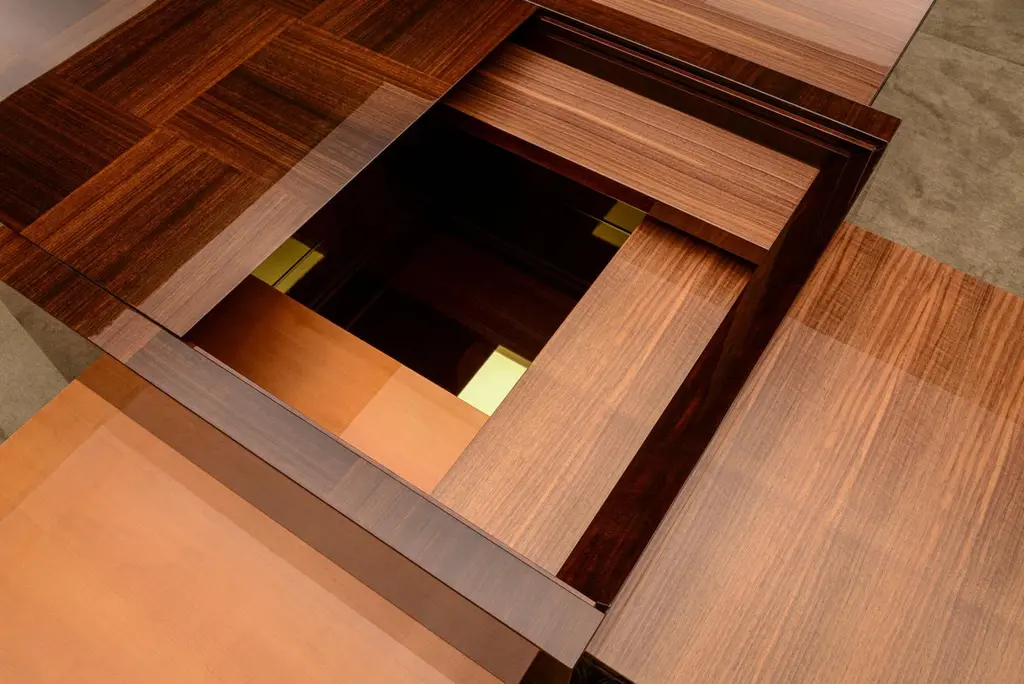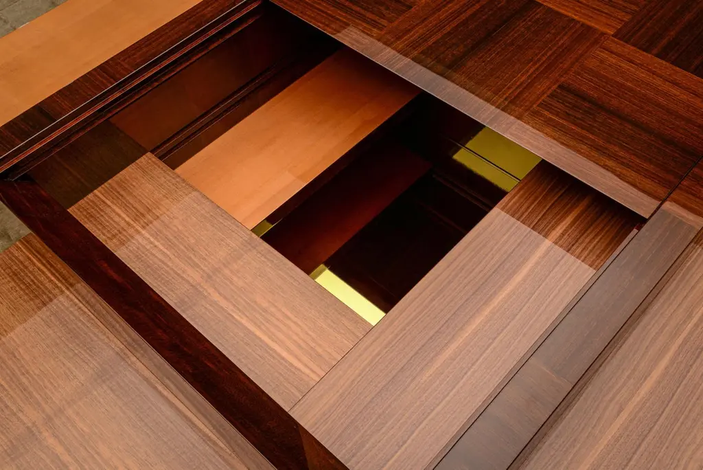 Arcano is a coffee table that hides an unexpected detail within itself: an elegant central chest with opening shelves and hidden compartments, entirely made of high-gloss polyester lacquer eucalyptus veneered wood.The overall effect, when the structure is closed, is that of a compact, sophisticated monomaterical cube, which only reveals its true nature as soon as it opens. Inside, the brass-colored mirror glass creates an intriguing visual and material effect, emphasizing the duality between aesthetics and functionality.The carefully carved shelves and the refined surfaces add a vintage touch that blends naturally into contemporary settings.The Arcano coffee table combines formal refinement with a playful spirit, turning into a unique piece of furniture, capable of surprising and introducing a touch of mystery and originality into the space.