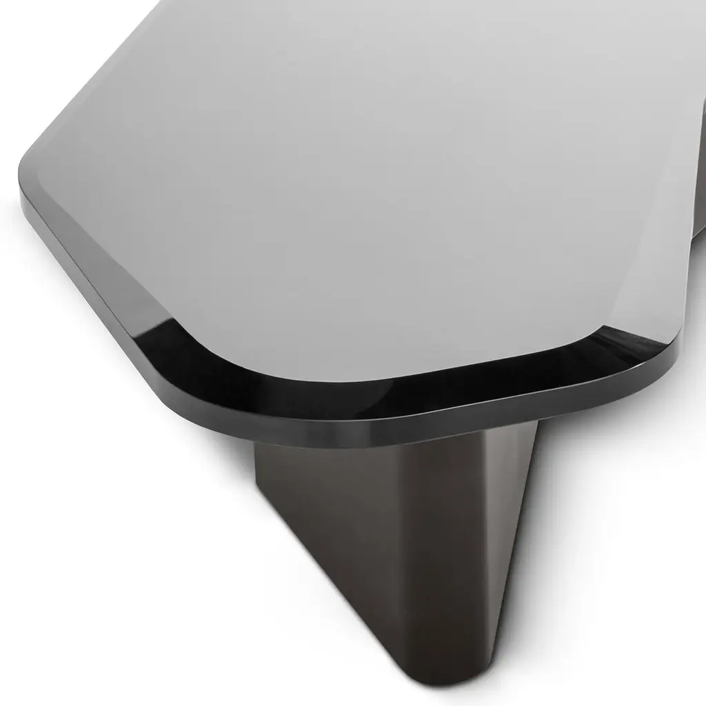 Daytona collection dares say to be able to represent people souls through art, by designing your spaces and permeating them with our experience. A coffee table with steel sheet structure and finished in opaque smoke-lacquered, with a 20 mm black asymmetric grinded glass top. With an original and attractive design, it will make your home unique.