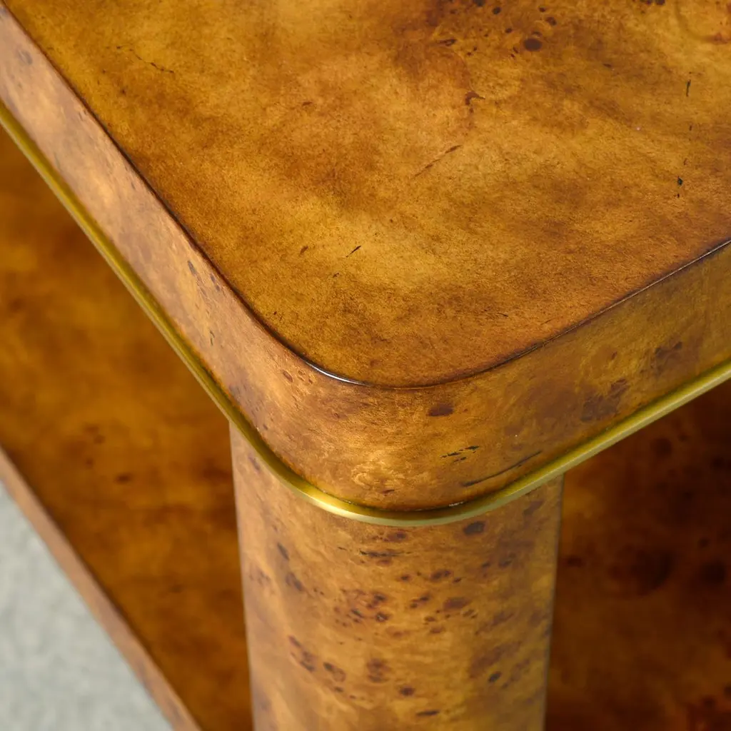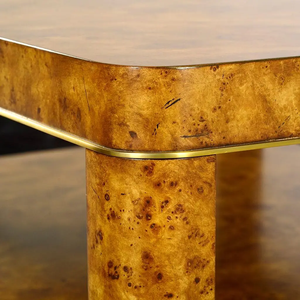 Featuring a sleek rectangular design, this table is crafted with luxurious golden mappa burl wood veneer, showcasing the intricate grain patterns that exude sophistication. A spacious lower shelf adds practicality, offering room to display books, decor, or store essentials while maintaining an uncluttered look.With its clean lines and minimalist form, this coffee table blends seamlessly with both classic and contemporary interiors. It’s a statement piece that enhances your space with understated luxury and enduring style.Dimensions: 48" W x 36" D x 19.5" H