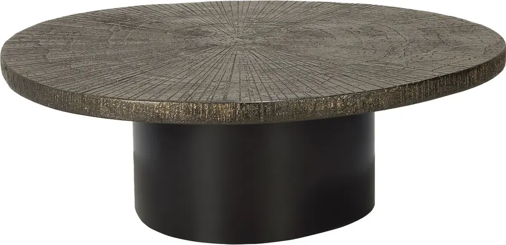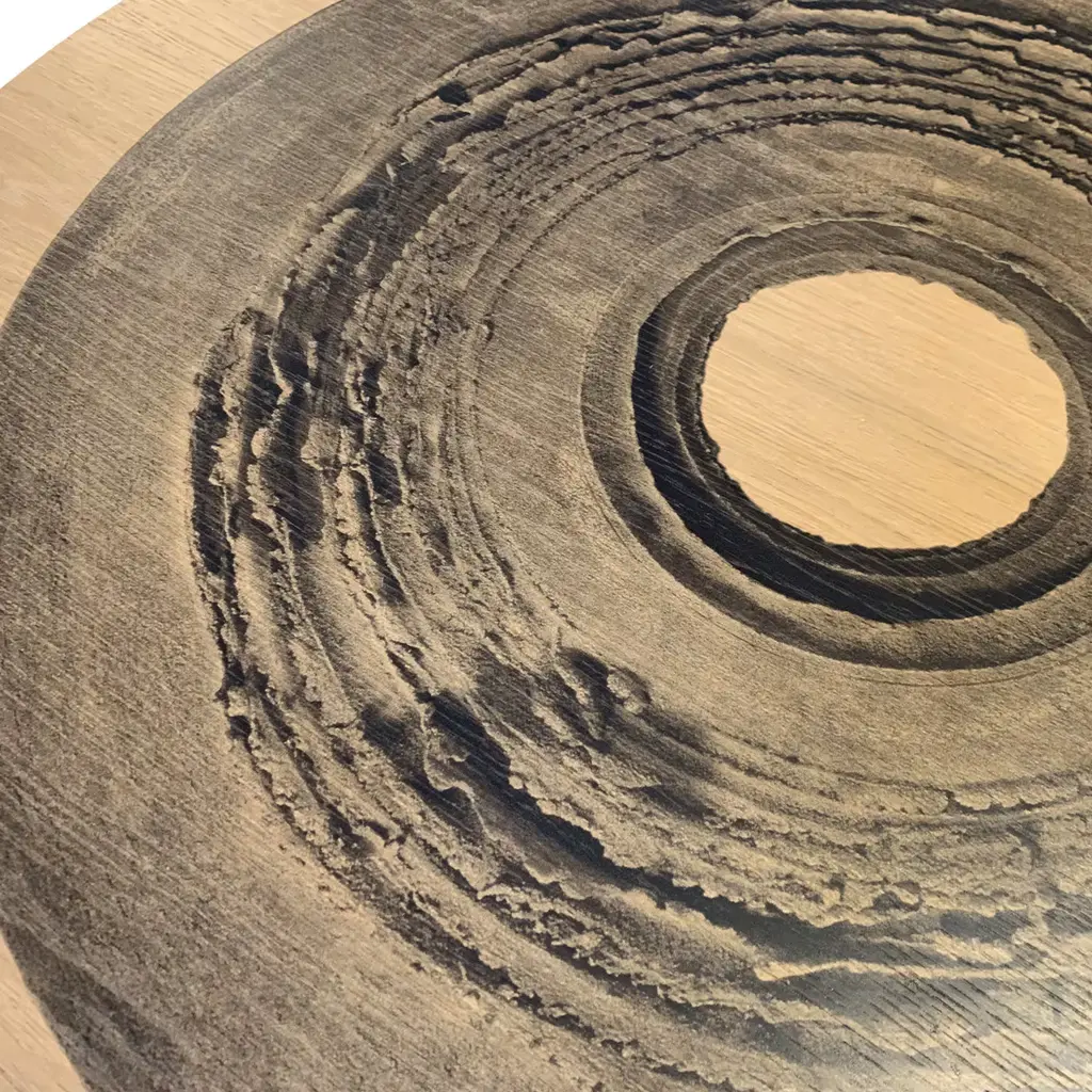 A stunning celebration of wood in all its forms and shades, this exceptional coffee table was uniquely created for an Italian Design contest in an exclusive two-piece series. Showcasing a captivating charm combining clean geometric lines, it rests on matte brown-lacquered legs sustaining a round top covered with a striking digital print reproducing the natural hues of a tree's trunk. Perfect for both a contemporary or classic interior, it draws inspiration from Art Deco style.