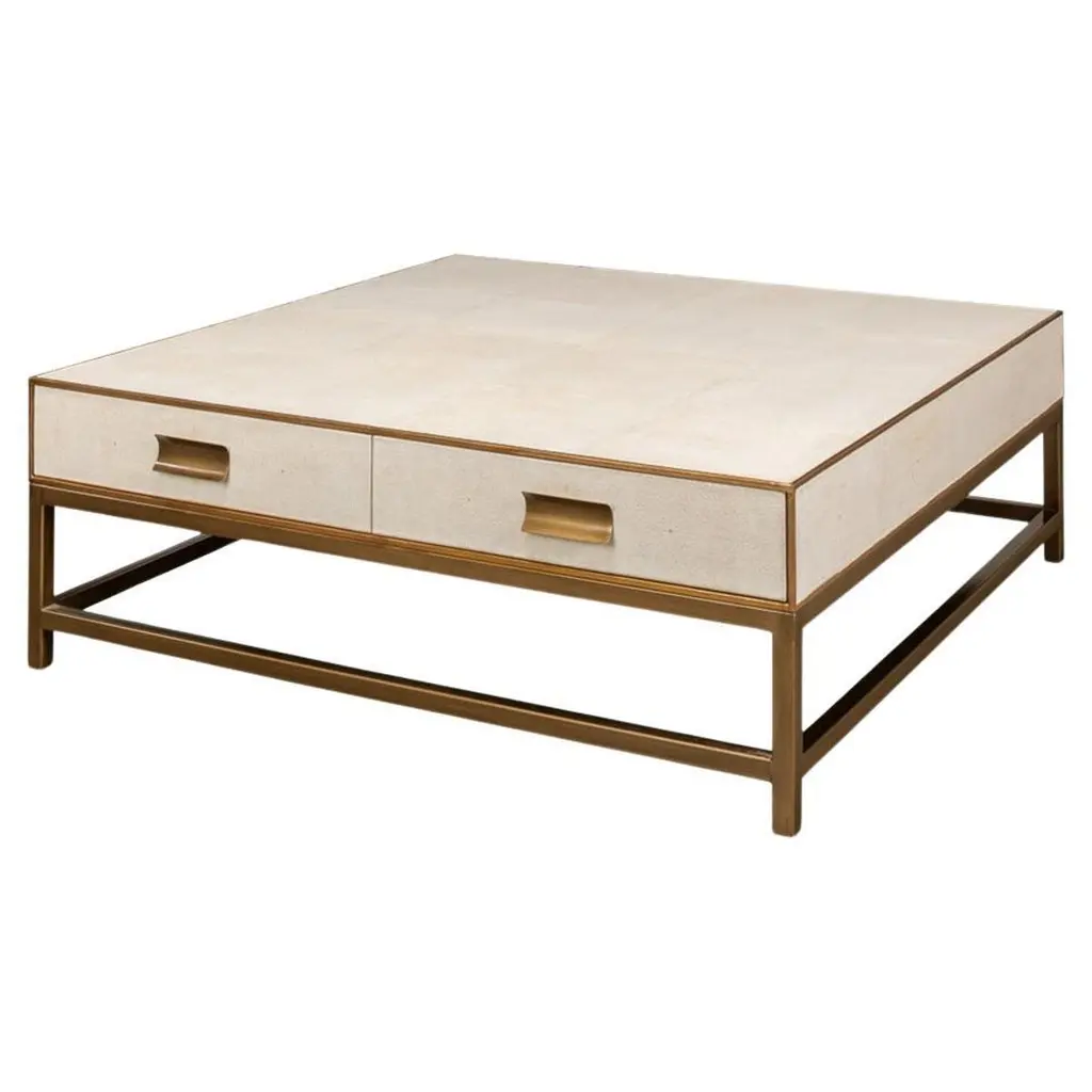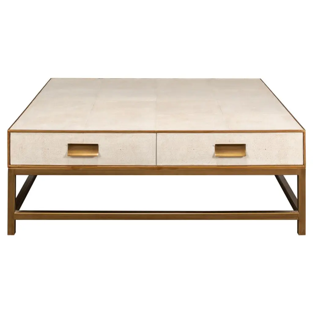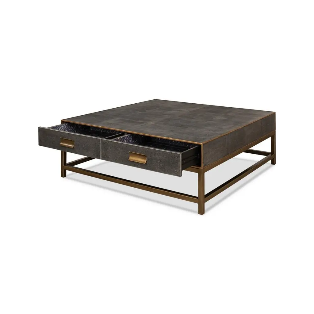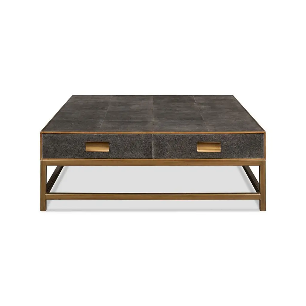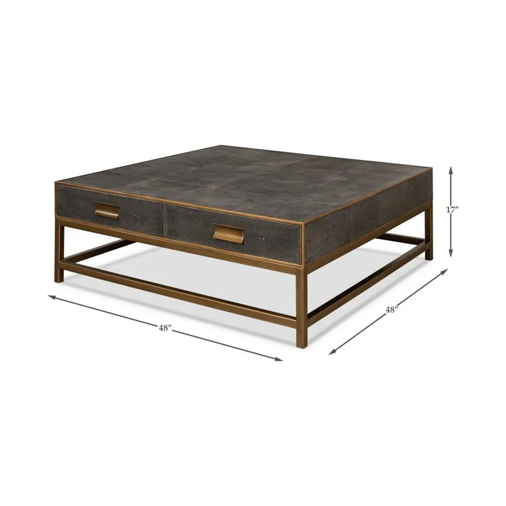 Crafted from wood with a shagreen embossed leather wrapped top, this square coffee table is finished with gold trim and hardware. With two drawers and raised on cube-form base with stretchers. The low-profile design makes it ideal for a functional space and the table's striking green hue is complemented by brass-like accents, resulting in a piece that is as much a conversation starter as it is a piece of furniture.Dimensions: 48" W x 48" D x 17" H