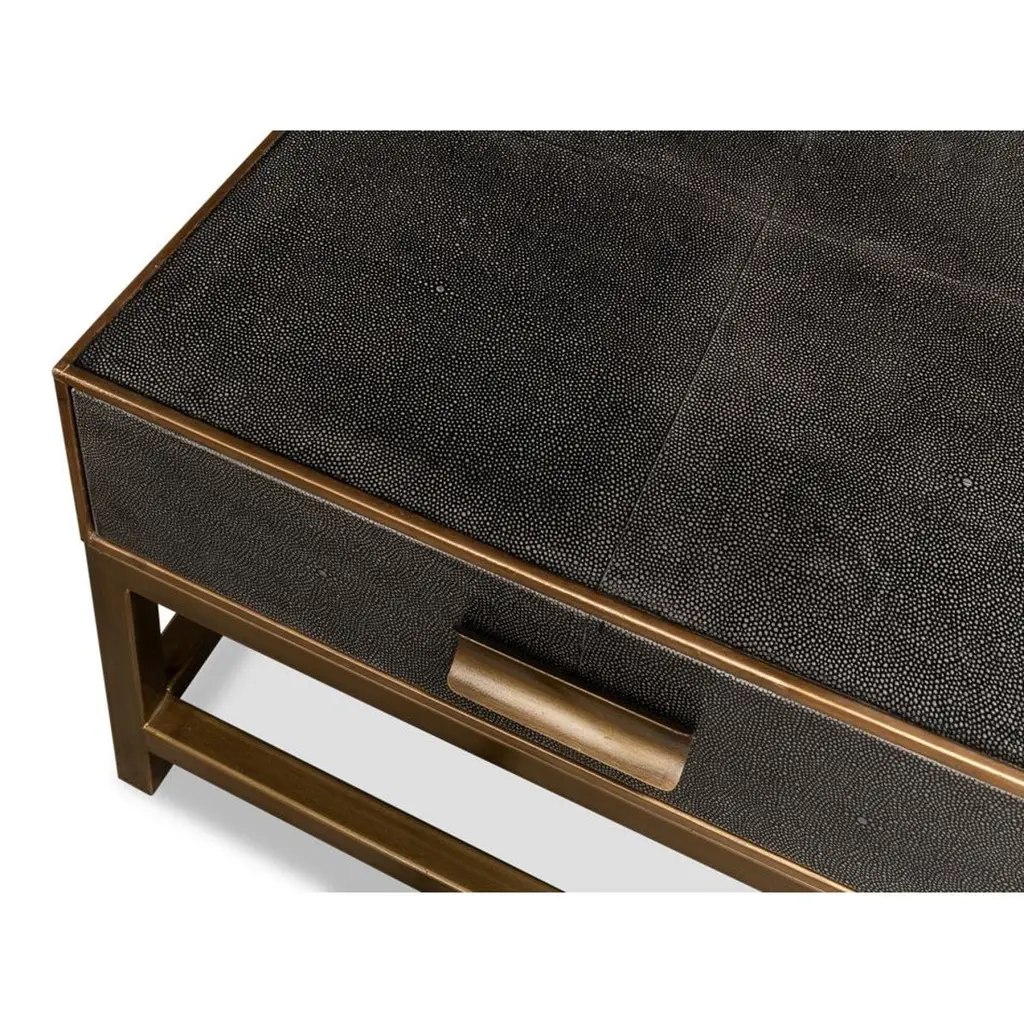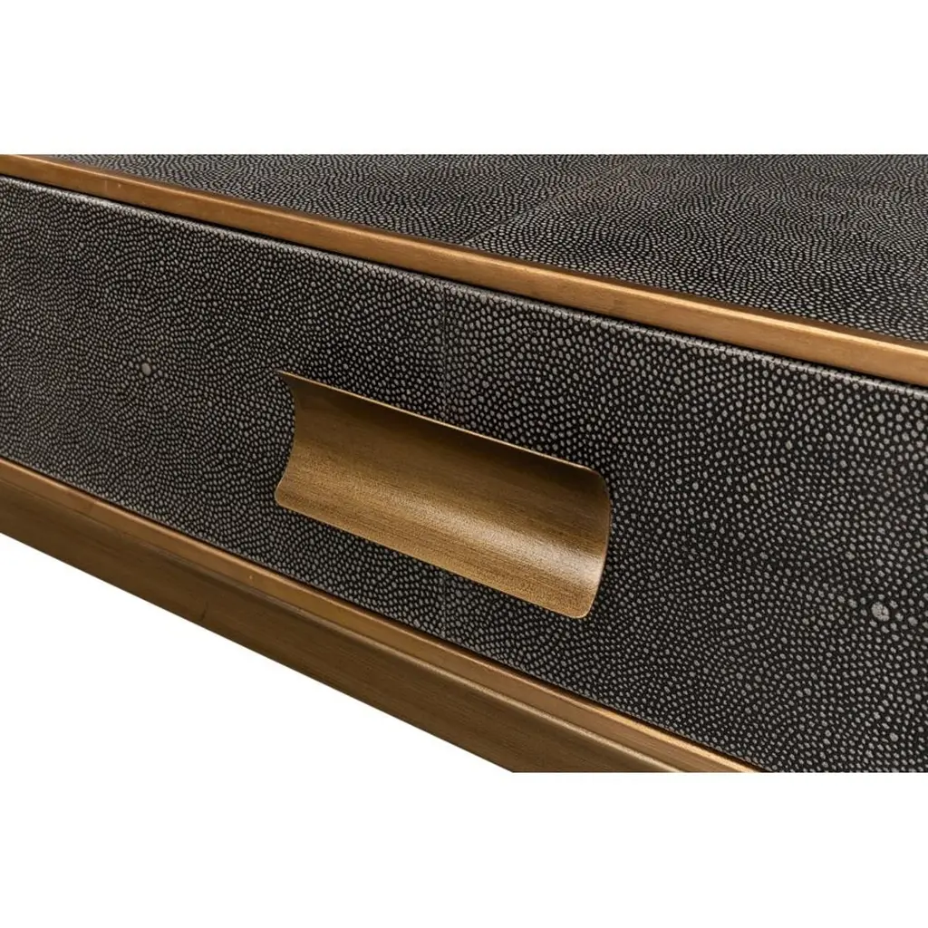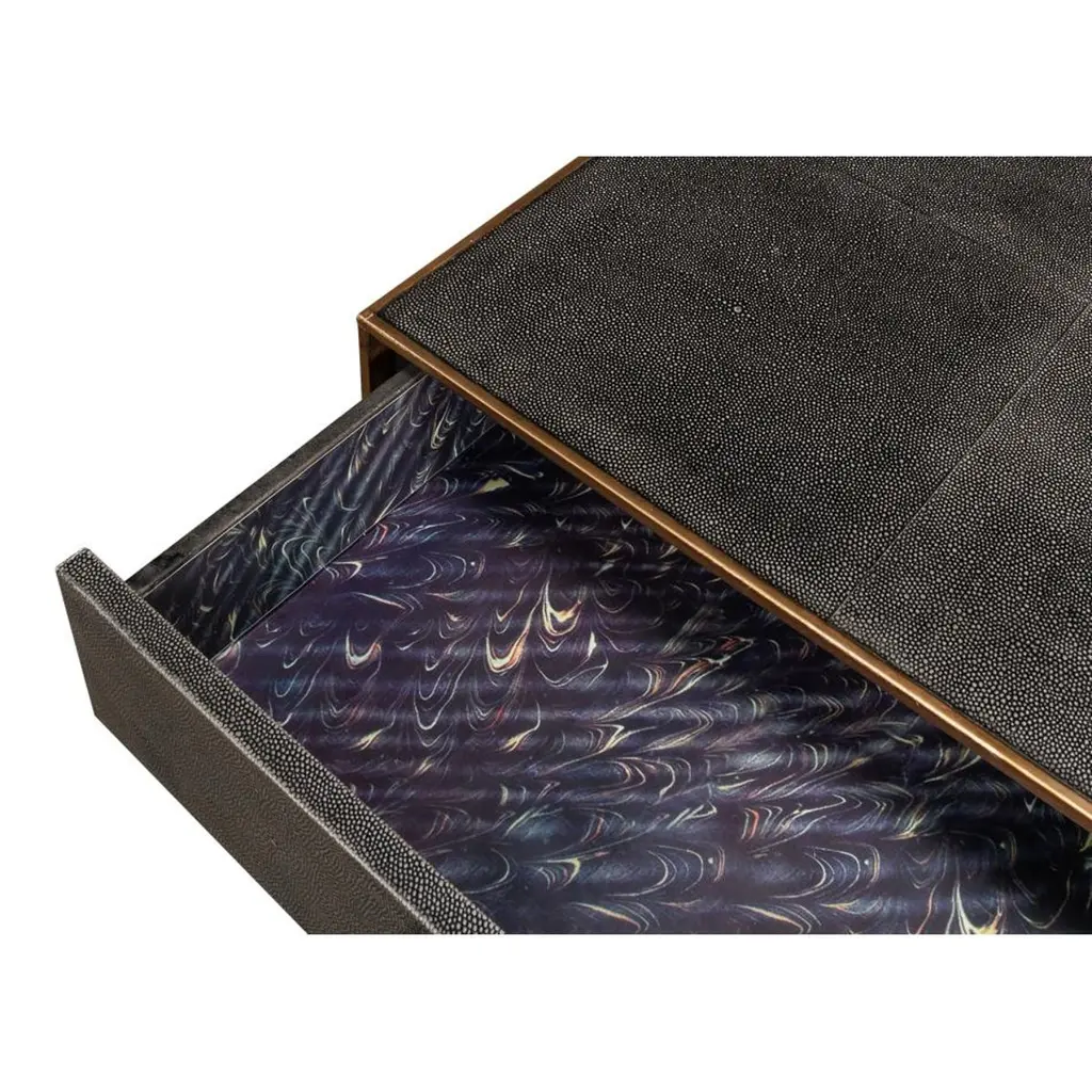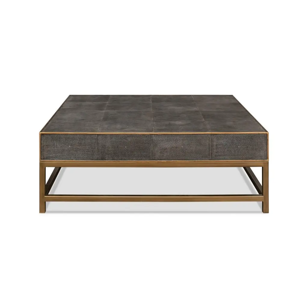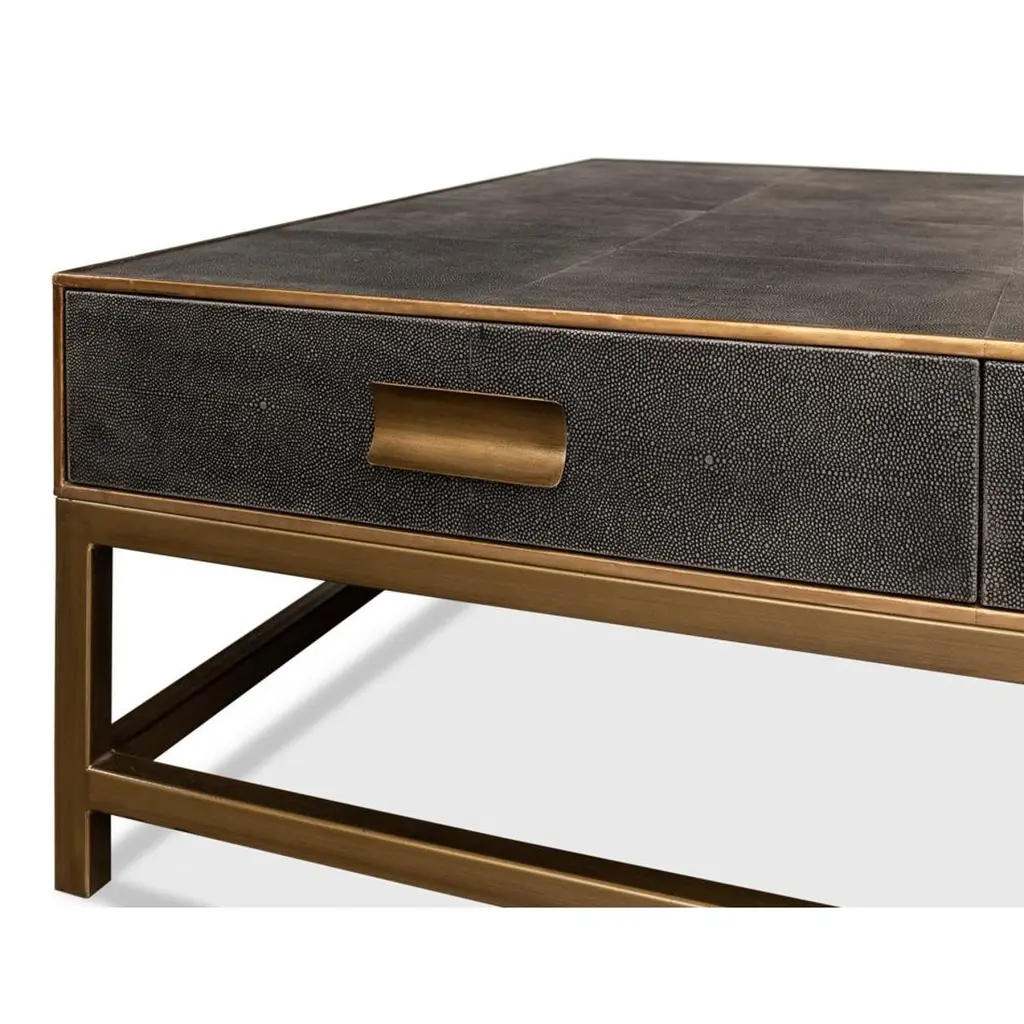 Crafted from wood with a shagreen embossed leather wrapped top, this square coffee table is finished with gold trim and hardware. With two drawers and raised on cube-form base with stretchers. The low-profile design makes it ideal for a functional space and the table's striking green hue is complemented by brass-like accents, resulting in a piece that is as much a conversation starter as it is a piece of furniture.Dimensions: 48" W x 48" D x 17" H