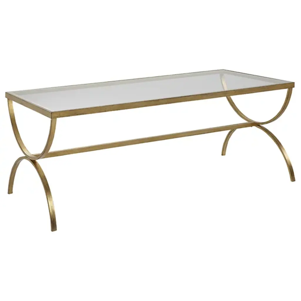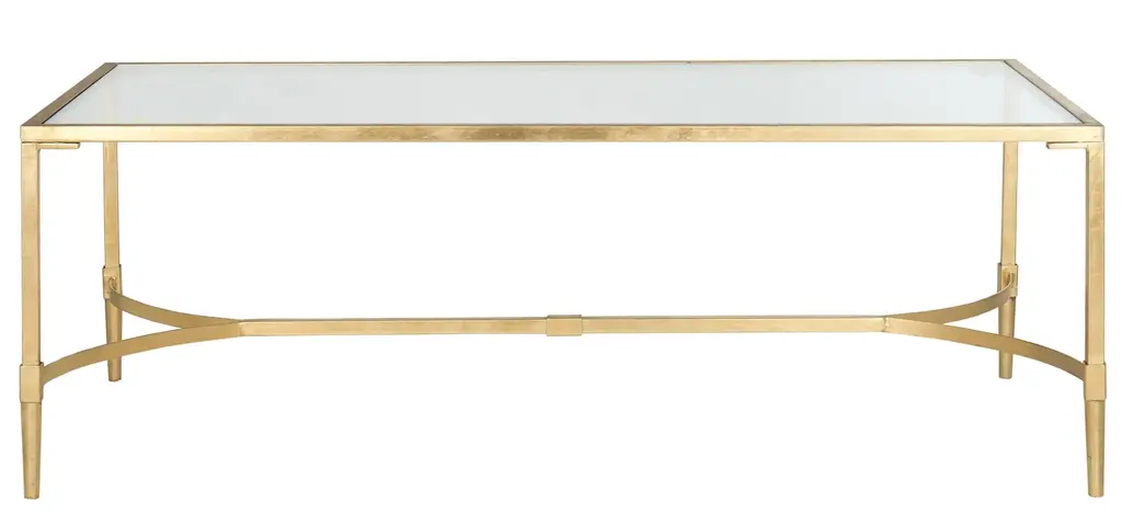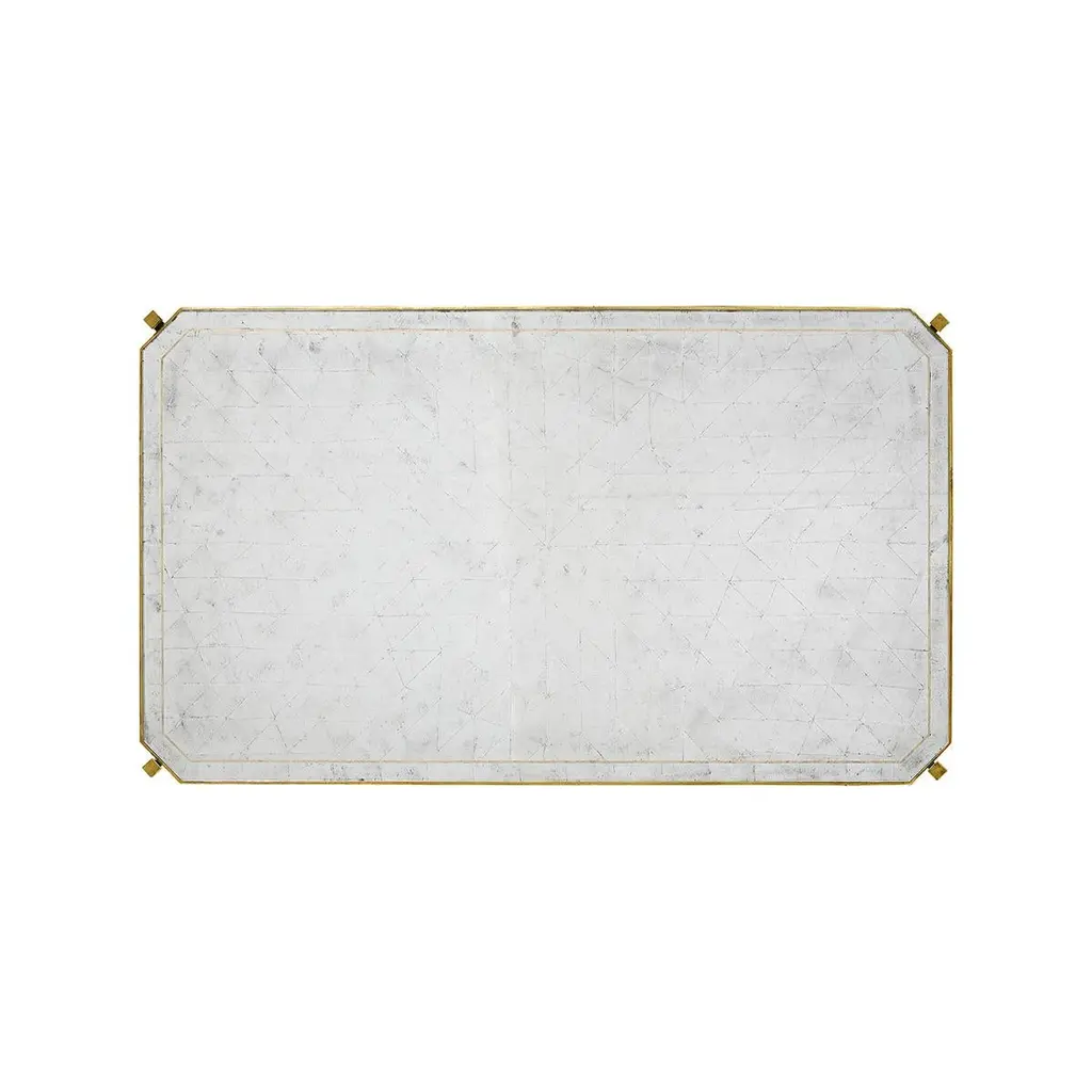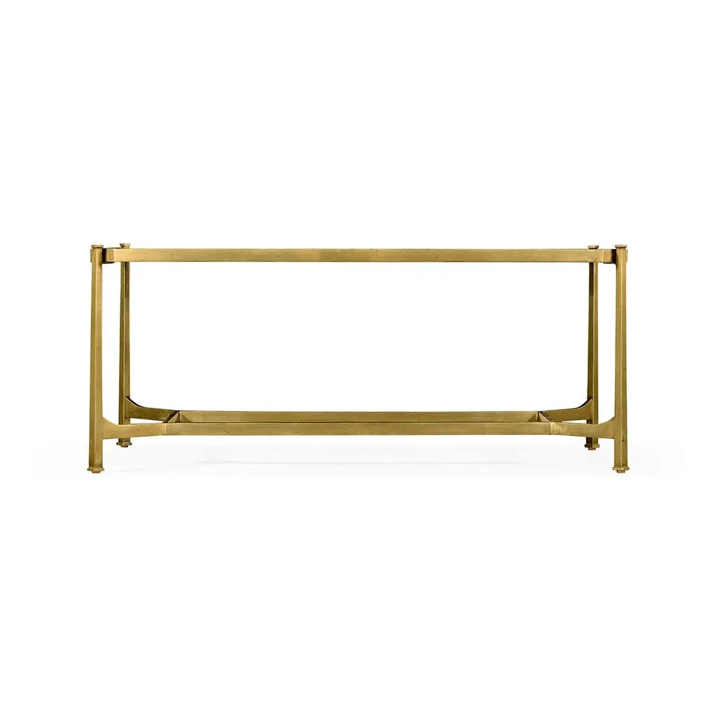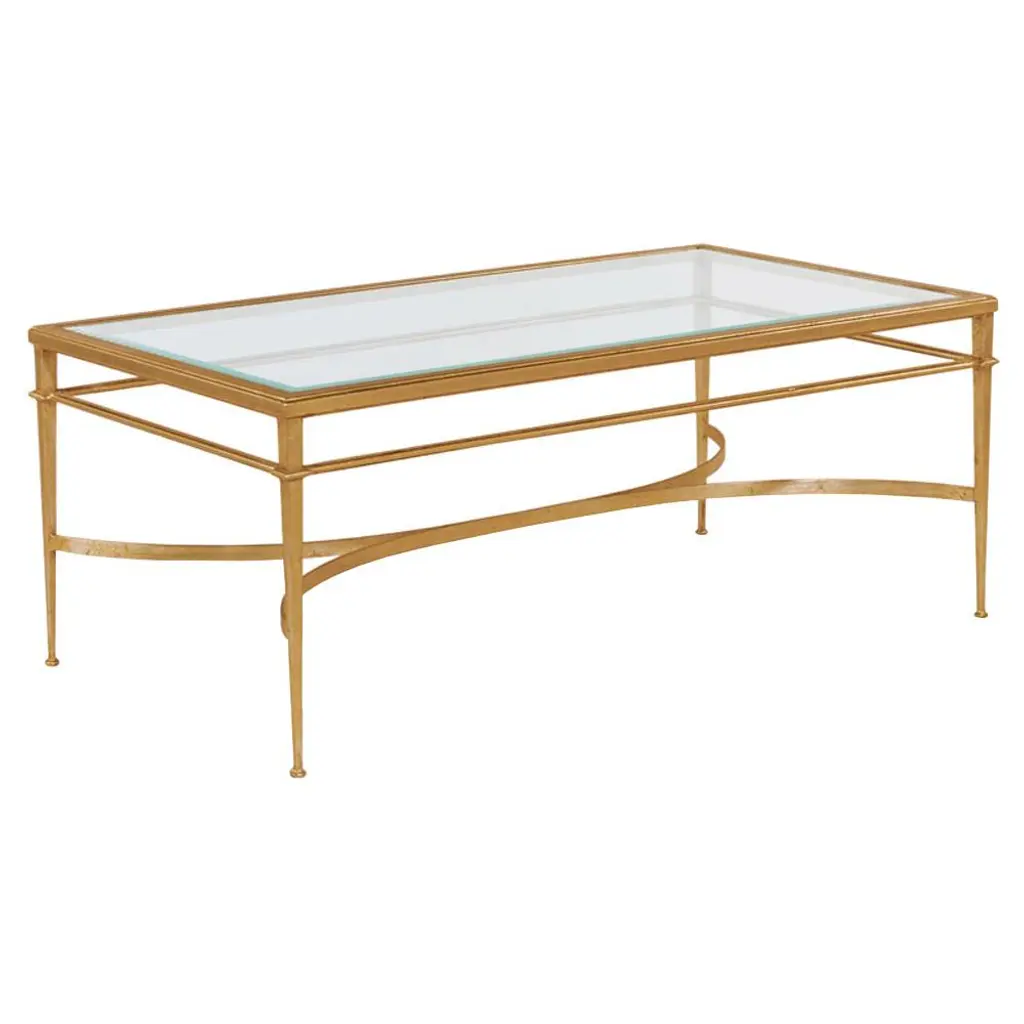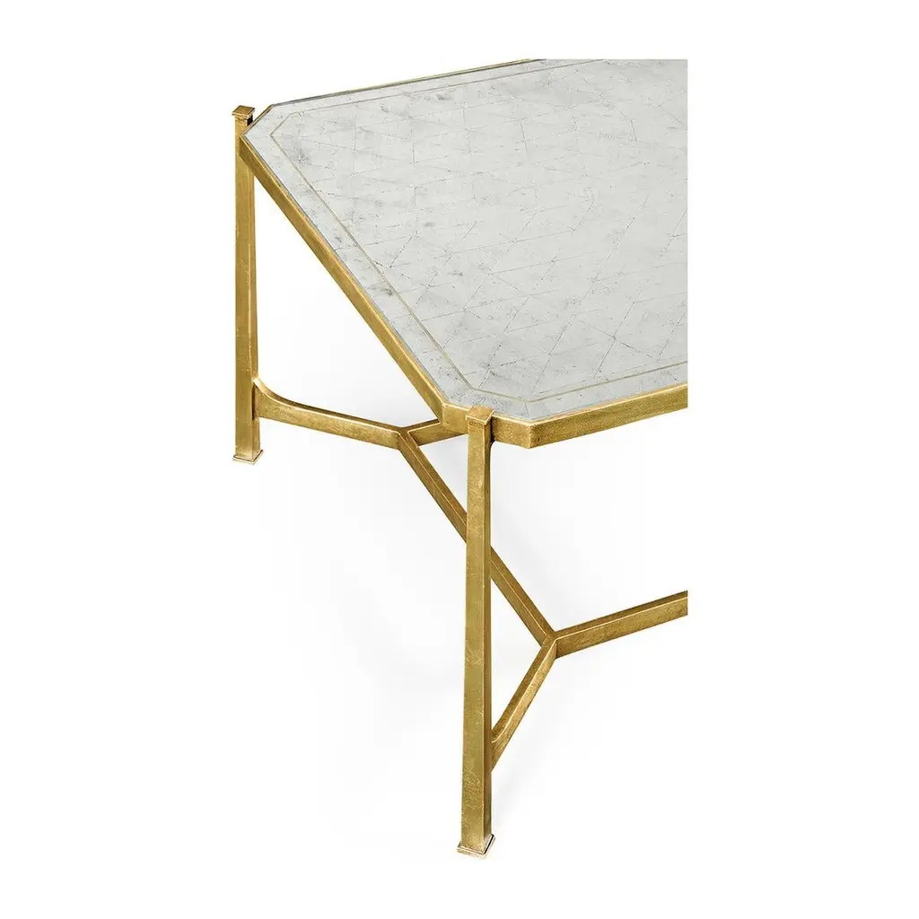 Art Deco Style Gilt cocktail table, wrought iron frame with an antique gilded finish and églomisé rectangular top set on an openwork stretcher base. Dimensions: 48" W x 28" D x 20.25" H.
