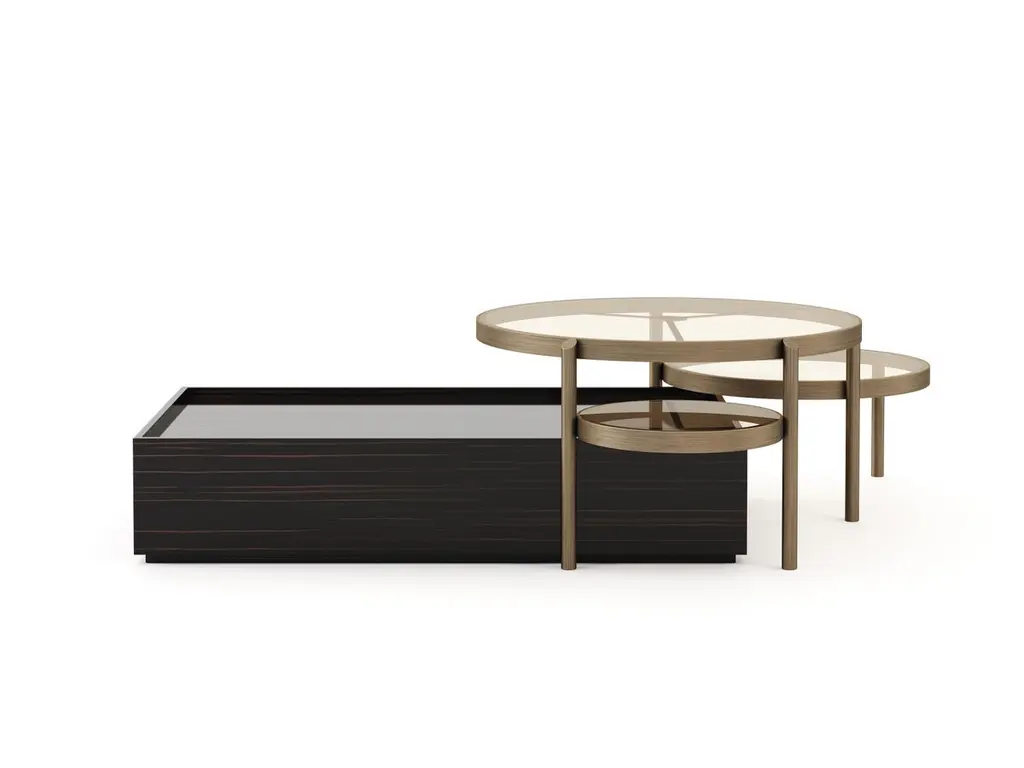 His & Her are complementary collections whose aim is to affirm the brand's aesthetic. These two collections are inspired by artistic movements from the beginning of the 20th century, namely in the aesthetic plurality that spread throughout Europe of Art Nouveau, and later in Art Deco, as well as in international style that has developed around the world.The Her line, inspired by Art Nouveau movements, stands out for its elegance and design. Composed by two tables with different measures, the Her coffee table presents structures that complement each other well, due to the tones and quality of the materials. The perfect piece to add a sophisticated touch to your living room. The configuration of this coffee table sparks a distinctive interest. The Her coffee table adapts easily to any environment by the way of separation between the lower and the higher tables. Functionality and charm is all that this piece delivers. The high quality of the materials is summed up in this coffee table. The makasar ebony, the brushed bronze frame and the high glass table combine and result in a superb piece of design.As the product can be personalised, the image of the presentation is merely illustrative.Notes: Possibility of marble and glass tops - Price on request Lacquered metal or other metals - Price on requestMeasurement UnitsHigh Table – D 101 x W 126 x H 45 cmLower Table – D 120 x W 70 x H 25 cm.