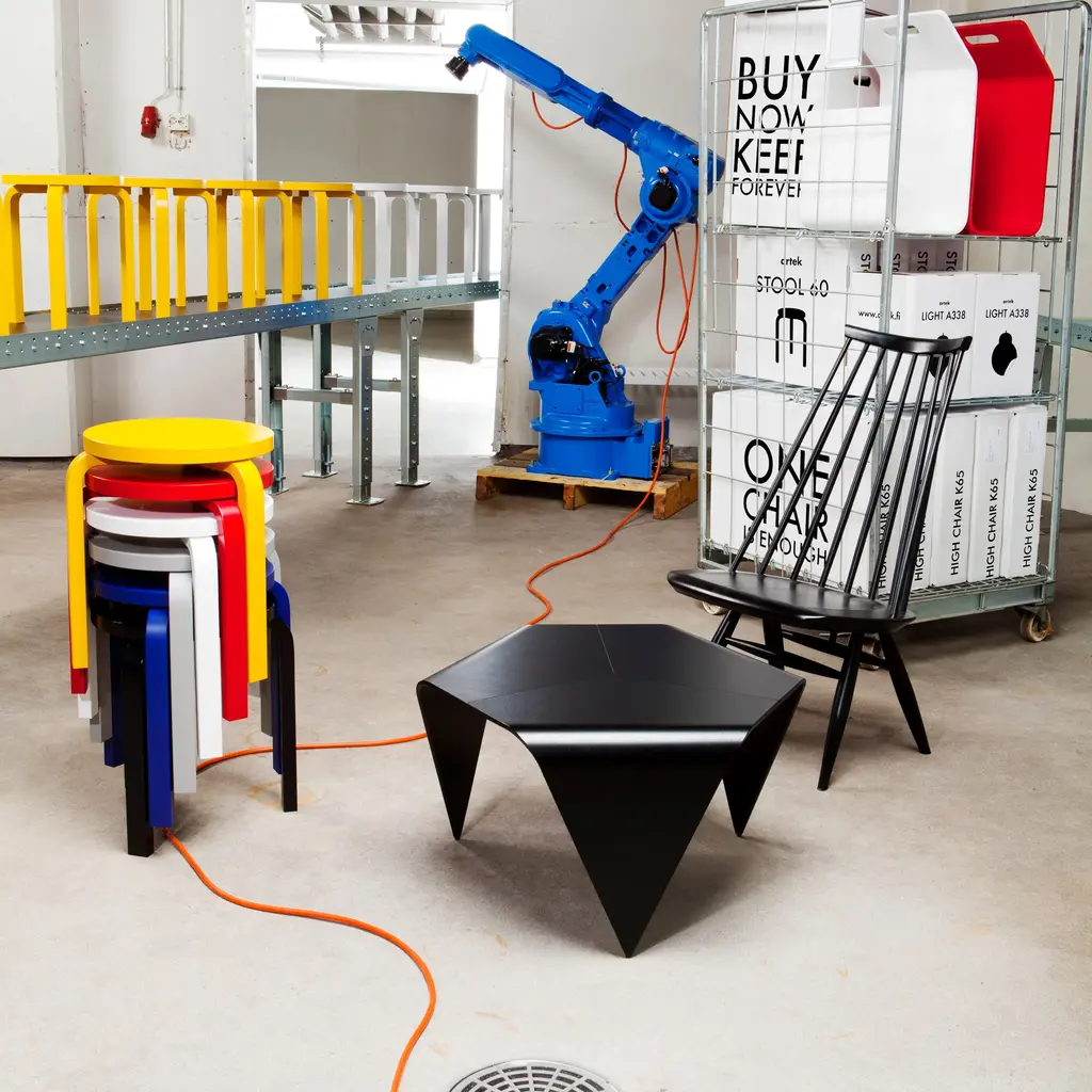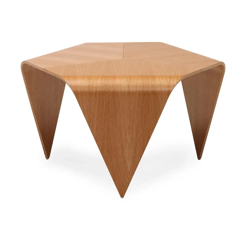At once a piece of sculpture and a coffee table, the conversation-sparking Trienna Table is made of form-pressed birch plywood and finishes include a stained black, lacquered white, oak veneer and walnut veneer. Composed of a hexagonal top and three striking triangular legs, this lightweight table can be easily transported around your home. A beautiful pattern appears on the table’s top, created by the seams of the three pieces of plywood. Designed in 1954 by Ilmari Tapiovaara and made in Finland, the Trienna Table has a top surface made from birch, oak and walnut veneer. It measures 15.25h x 27.5w x 24.5”d.