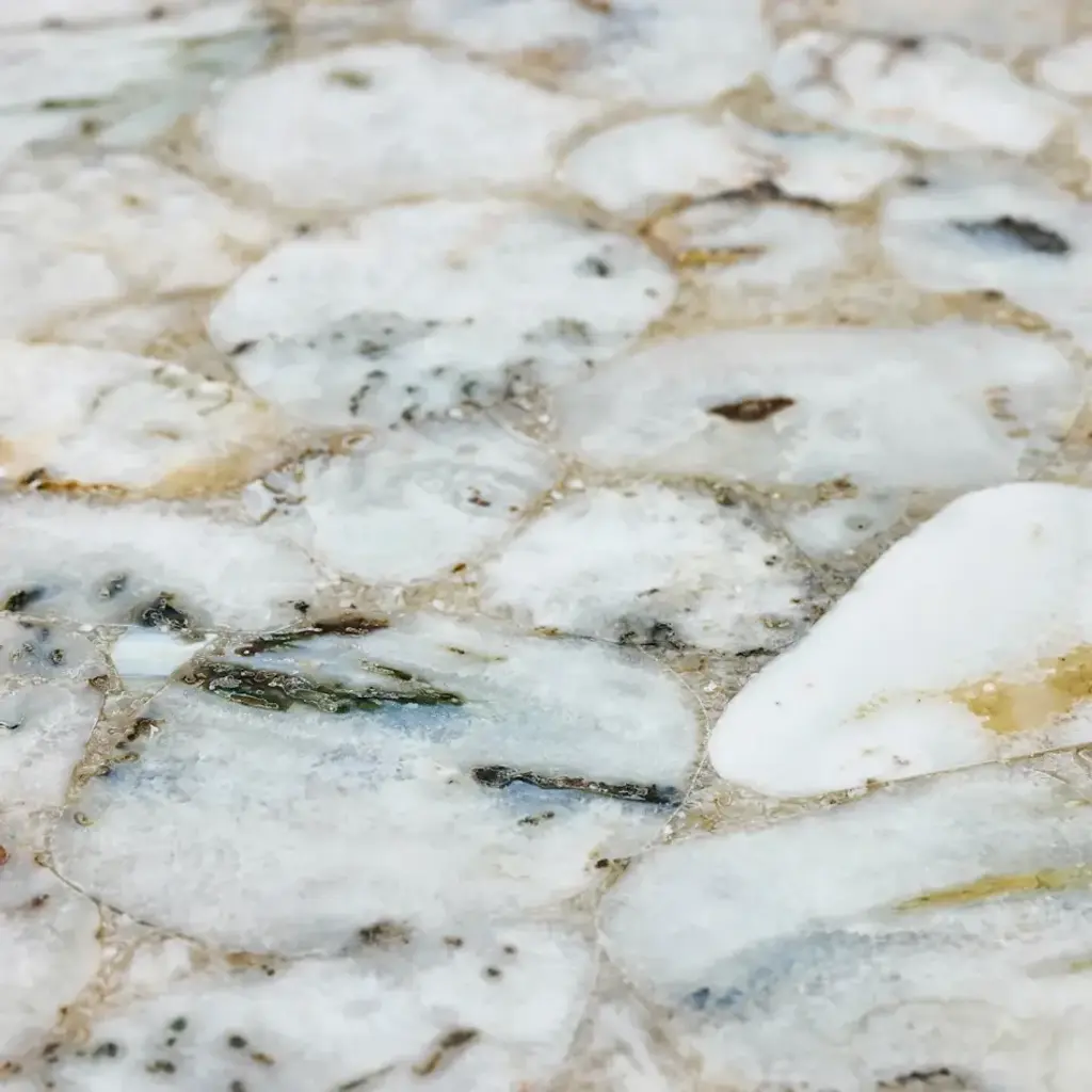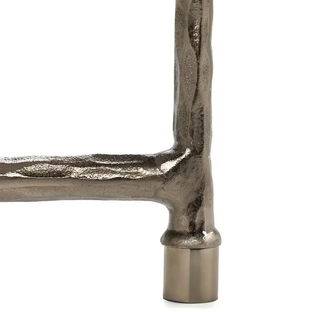 The Artigas Cocktail Table seamlessly blends natural materials and exotic tones. The slender frame is constructed with a combination of straight and curved aluminum rods in a Bronzed finish, creating an architectural look. The surface is a rectangular cut of natural white agate stone, pairing beautifully with the dark metallic hues to complete the look.