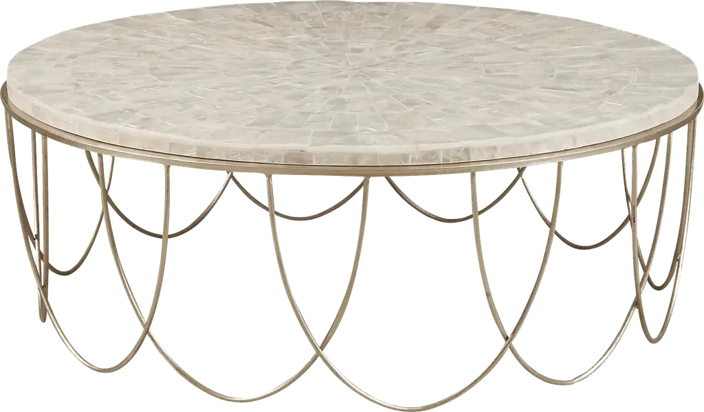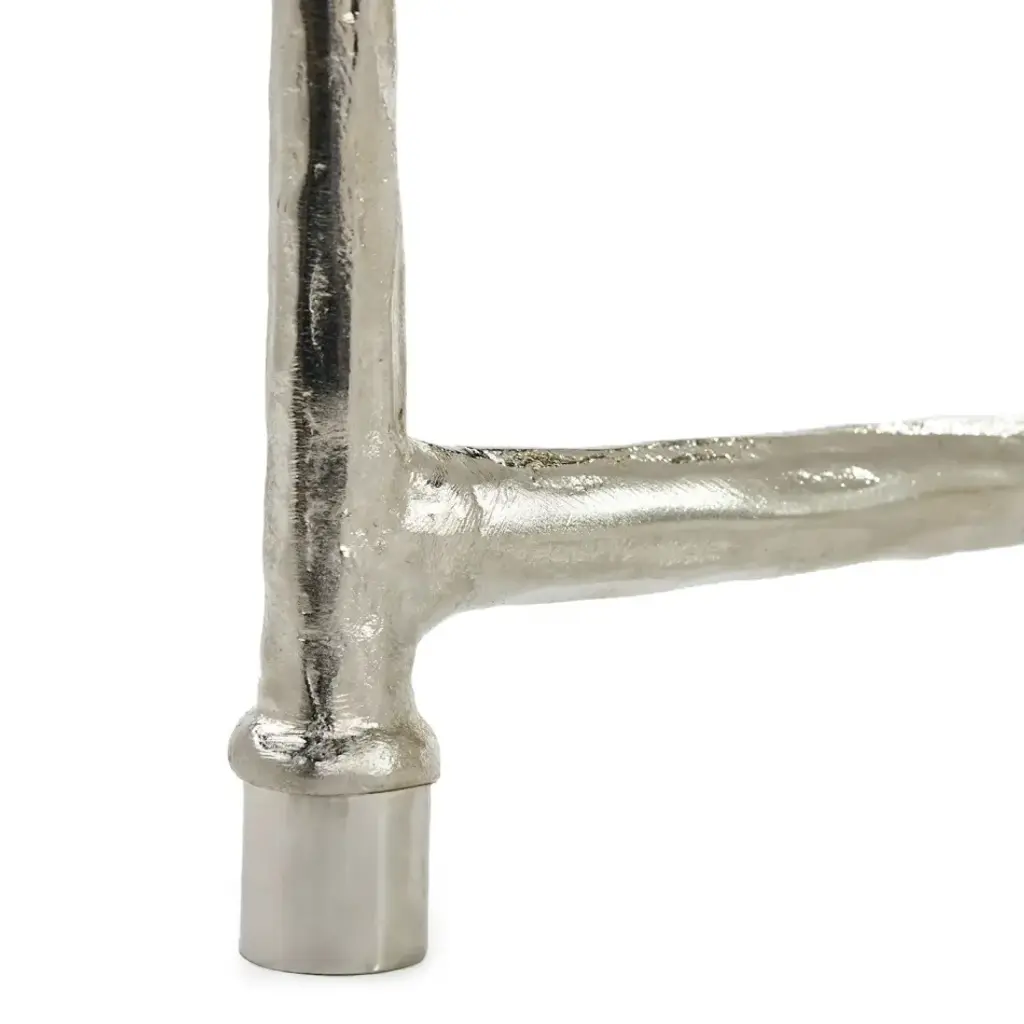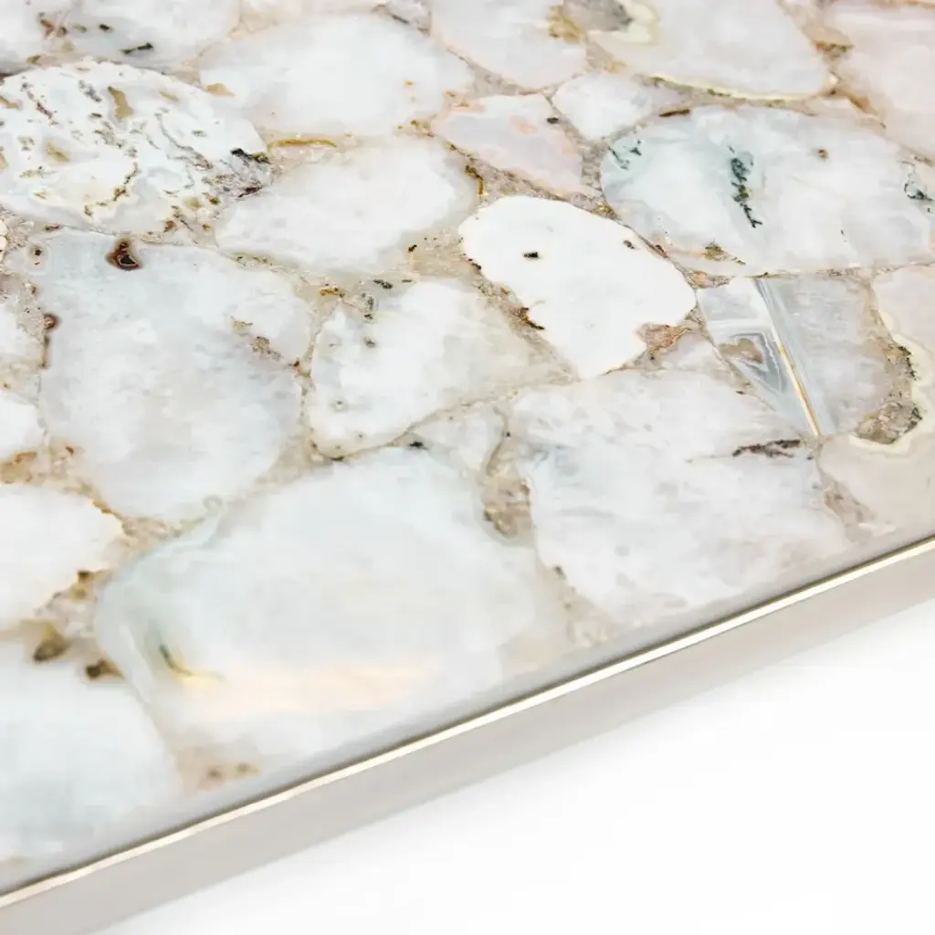 The Artigas Cocktail Table seamlessly blends natural materials and exotic tones. The slender frame is constructed with a combination of straight and curved aluminum rods in a Nickel finish, creating an architectural look. The surface is a rectangular cut of natural white agate stone, pairing beautifully with the shining metallic hues to complete the look.