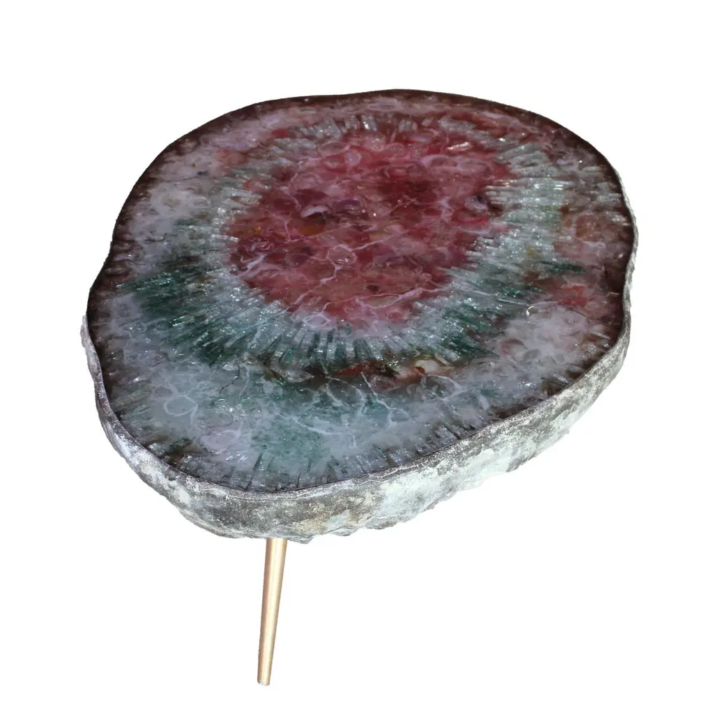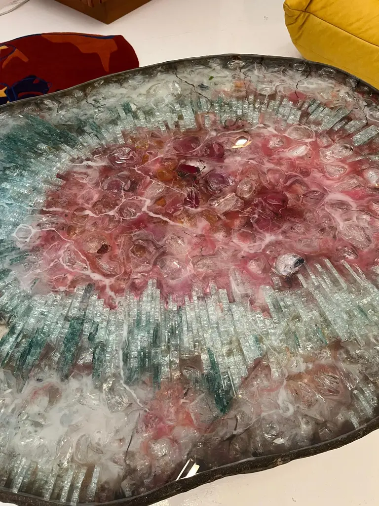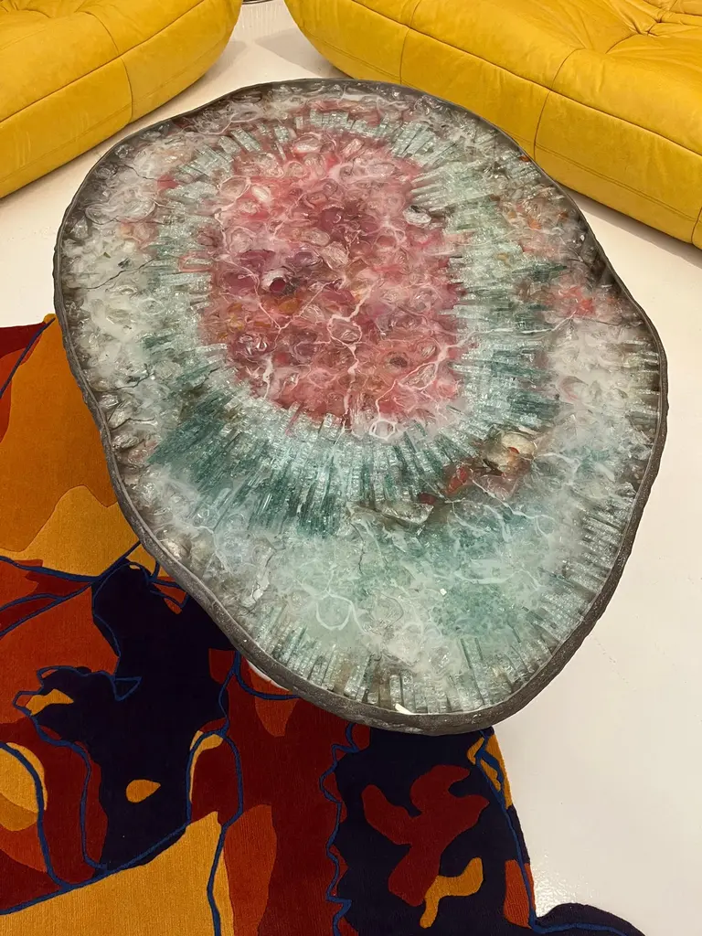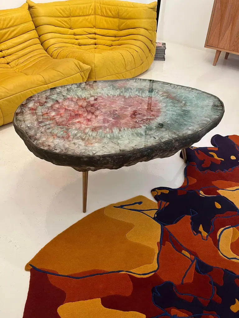 Coffee table mod Coral Rose designed by Von Pelt Atelier handmade as a unique piece in Berlin for L.A. Studio. The top is composed of epoxy resin, pigments, blown glass, marble powder, fiberglass with a 10 mm safety glass lid and base brass turned. Unique piece inspired by nature, Germany.Explore the stunning collection of "Meteorite" tables from Von Pelt Atelier, reminiscent of the grandeur of geodes in your interior space. Each table is a unique work of art, crafted with car moonroofs, marble dust, and high-quality resins, supported by conically-shaped brass legs.Von Pelt Atelier's "Meteorite" tables are more than just furniture; they are conversation pieces that draw stares and garner admiration from all who see them. With their innovative design and exquisite materials, these tables are the perfect complement to any modern and sophisticated décor.With an aesthetic that blends the natural with the contemporary, "Meteorite" tables add a touch of elegance and distinction to any environment. Whether in a living room, office, or commercial space, these tables become the focal point, adding an element of luxury and unparalleled style.Don't miss the opportunity to own a "Meteorite" table from Von Pelt Atelier. Discover the unique beauty of these furniture pieces and elevate your space with a touch of sophistication and originality. Make a bold statement in your home or office with a table that reflects the beauty and uniqueness of nature!Every item L.A. Studio offers is checked by our team of 10 craftsmen in our in-house workshop. Special restoration or reupholstery requests can be done. Lighting can be electrified to the required voltage. Every piece design of L.A. Studio or new production as they are made with natural materials or made by artisans they may vary in wood color, marble color or wood grain, etc.Take into account that the colors on the furniture may vary depending on the type of lighting and the type of screen from which you see the images.