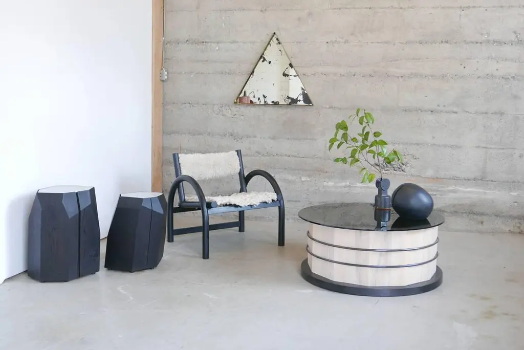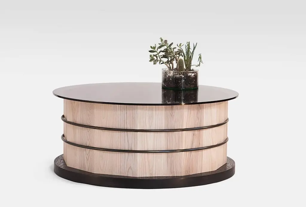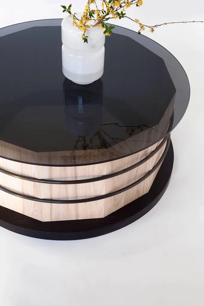 The table is highly customizable. Shown here is whitewashed Canadian white ash with a black dyed base, blackened steel hoops and a smoked glass top. This unique contemporary table has floating steel hoops let into a 12-sided stave base, and holds up a glass top which references the vintage craft of the cooper. Peering through the top, you’re able to see the detailed solid Canadian white ash joinery within the base as well as the layers of stacked geometry that make this table special. The base of this coffee table is 36" wide by 16" high with a 38" glass top. 'Hoop and Stave' is also available as a 29" high dining table with a 60" wide glass top that seats 6 comfortably. Please see Hinterland Design's 1stdibs listing LU314439082273 for dining table version of this table.