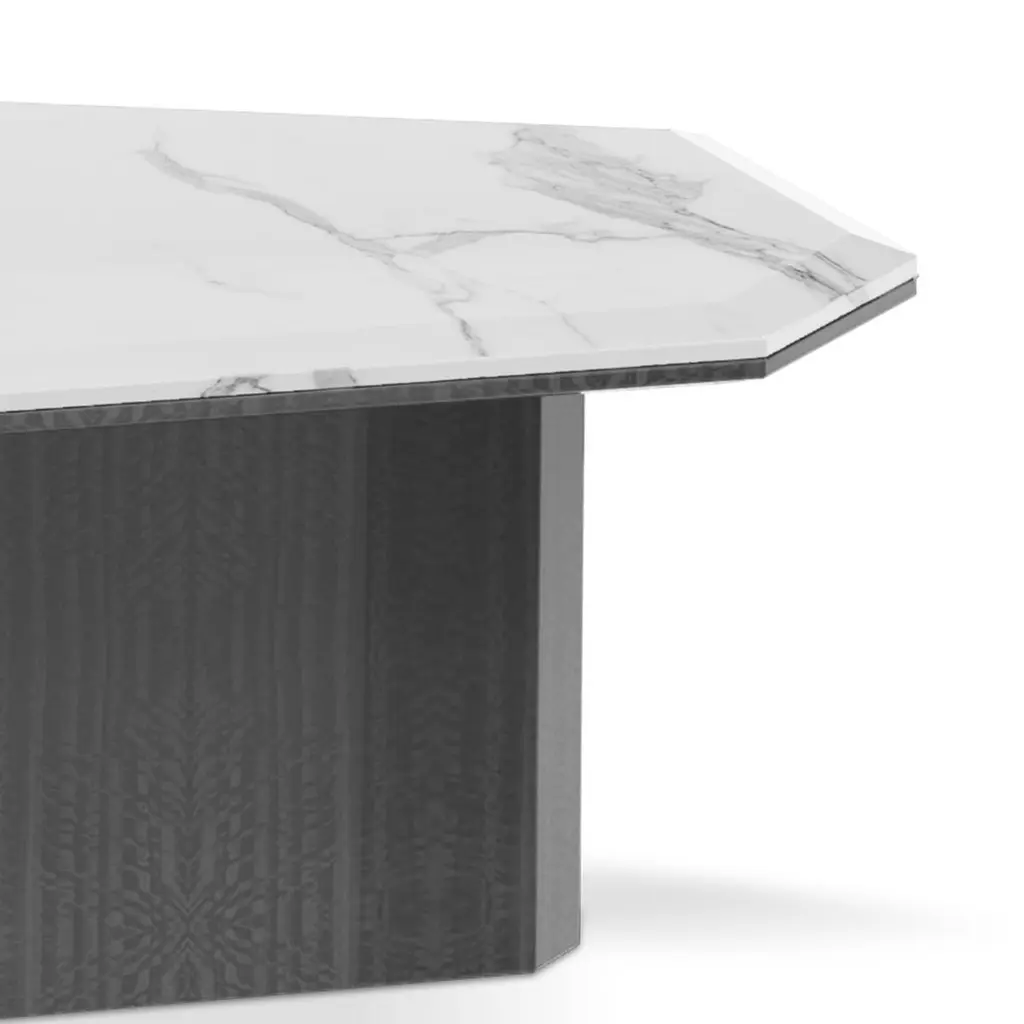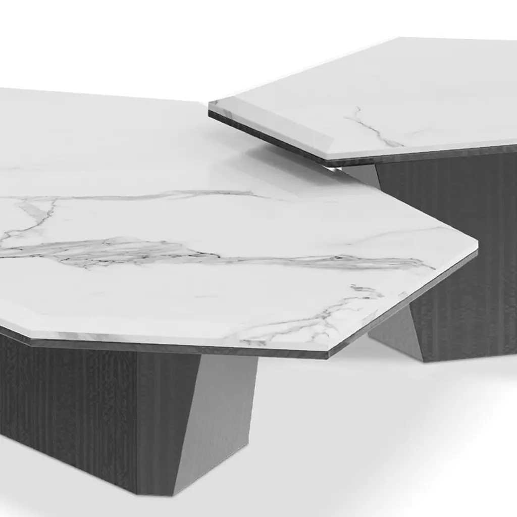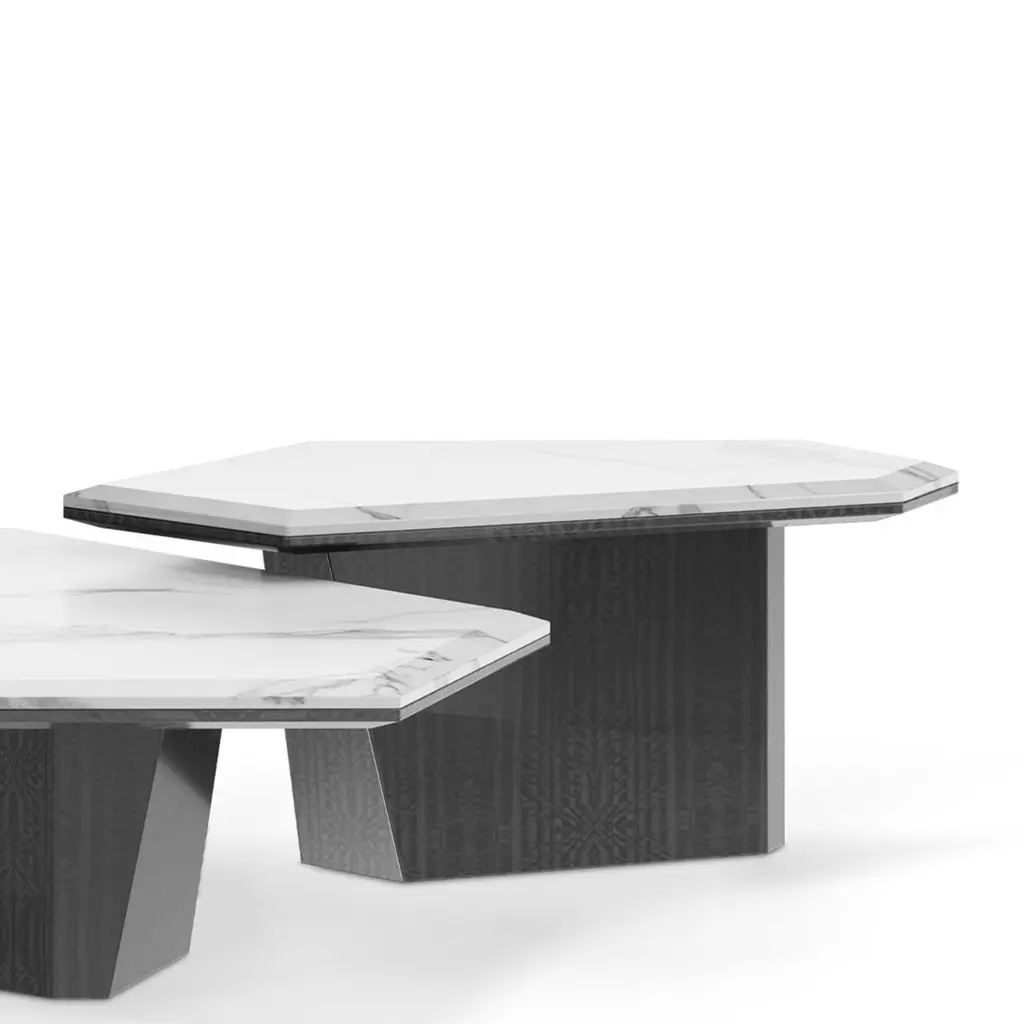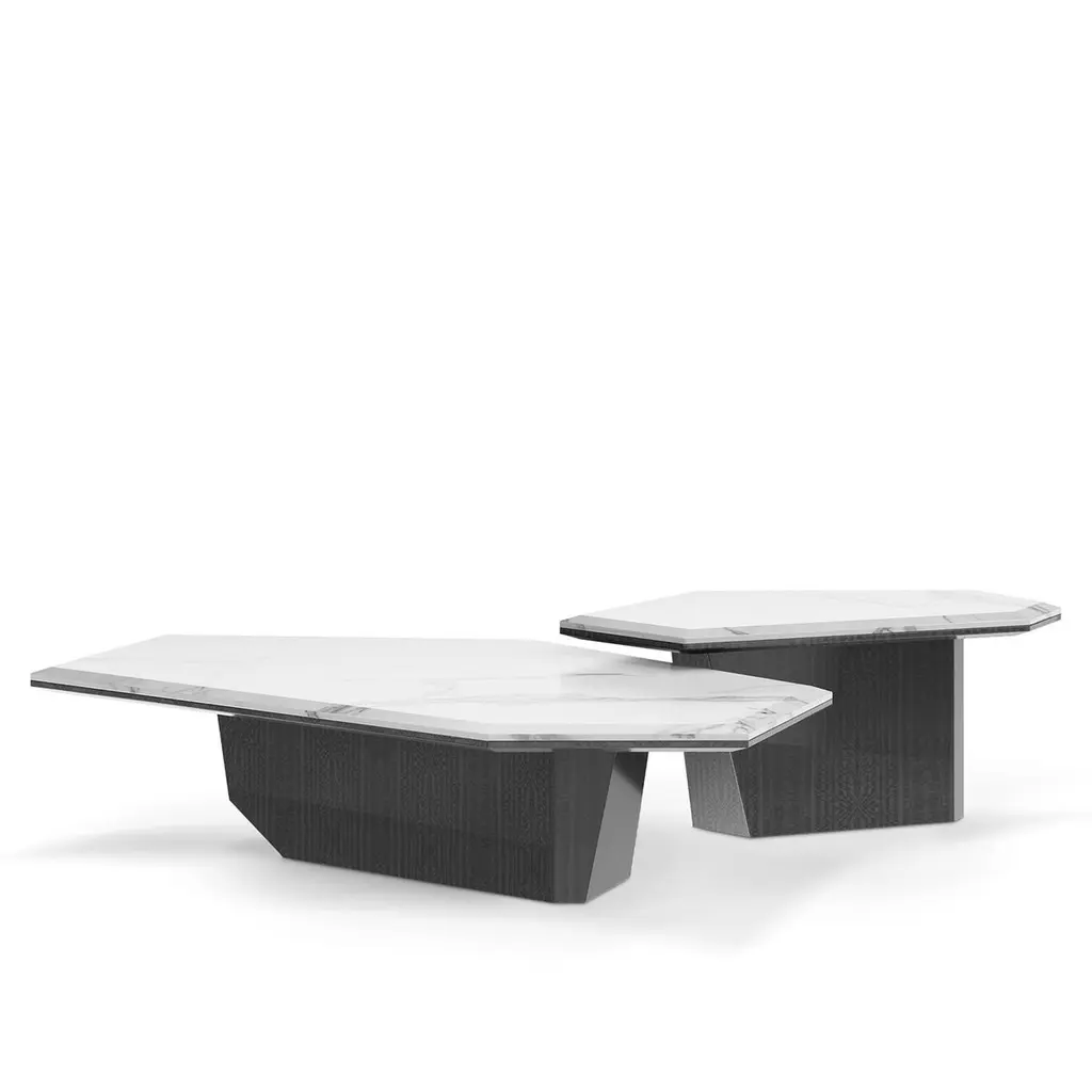 Coffee Table Asheiti Set of 2 with each table top in solid marble statuario in polished glossy finish. Each table base with wooden structure in eucalyptus frisé veneered in grey finish. A/L148xD85xH30cm.B/L86xD56xH36,5cm.