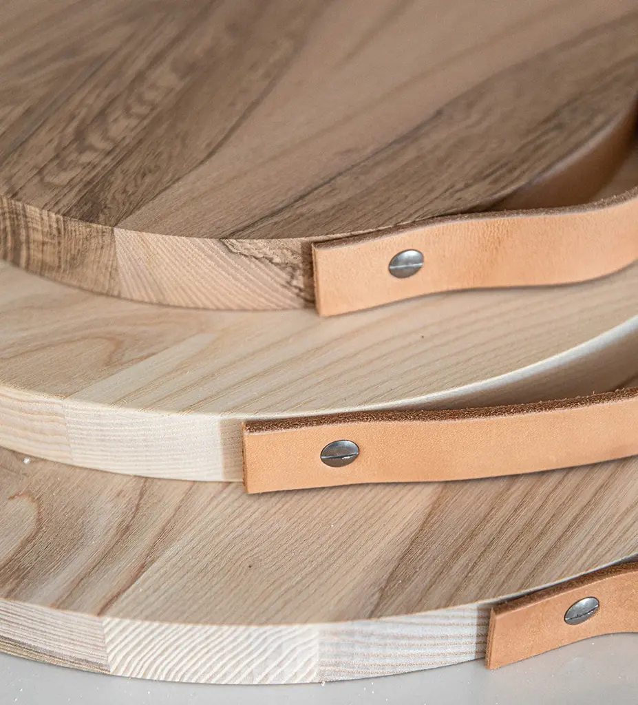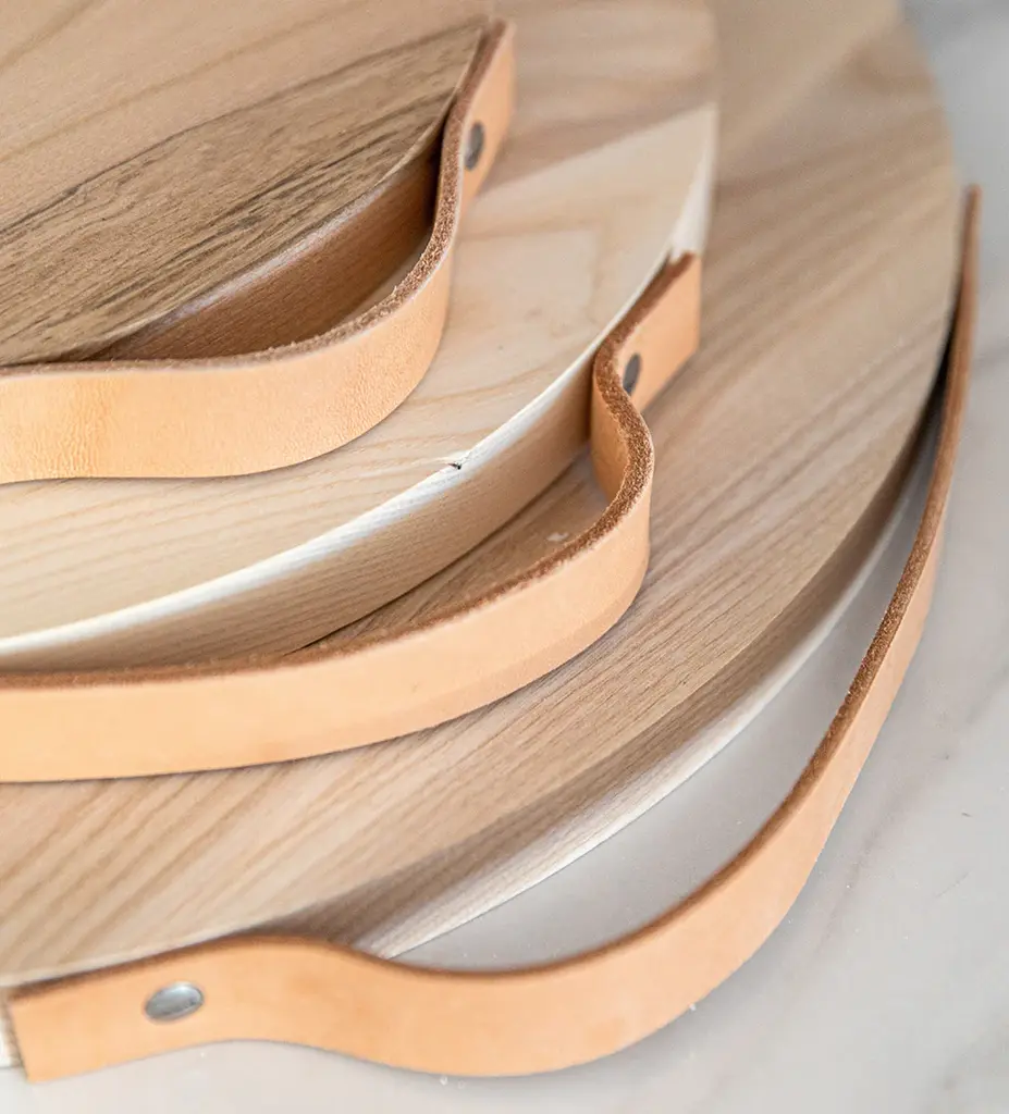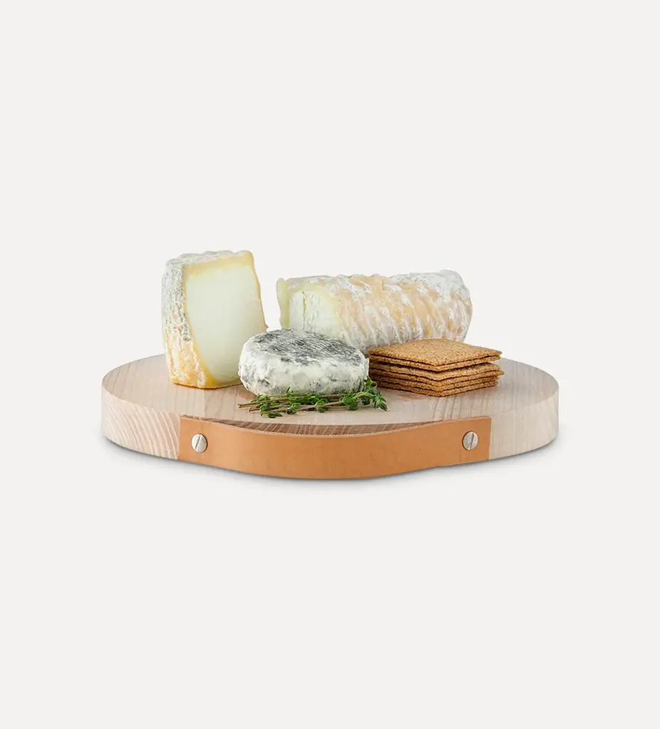 Step up your charcutterie board game with the Asher Board. This board is equipped with a beautiful leather handle, making it the perfect centerpiece to any coffee table. Fully equipped to hold a select choice of your favorite cheeses and meats, this board will become your new go-to. Crafted from solid FSC-certified ash wood + natural leather Dimensions: Small: 9.75" Dia. x 1" H Medium: 13.75" Dia. x 1" H Large: 17.75" Dia. x 1" H