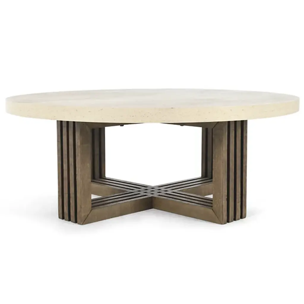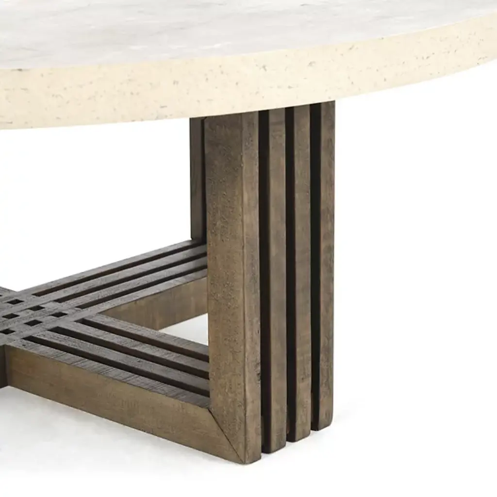 The Aspen Coffee Table from Classic Home introduces a modern interpretation of sustainable design through its unique cross-shaped base. Reclaimed pine wood supports a durable concrete laminate top, creating an interplay between raw and refined materials. The clearance underneath provides generous space for storage or leg room. Natural variations in the reclaimed wood tell stories of its past life, making each piece unique. This table represents thoughtful material choices and craftsmanship, offering both environmental consciousness and lasting usefulness.