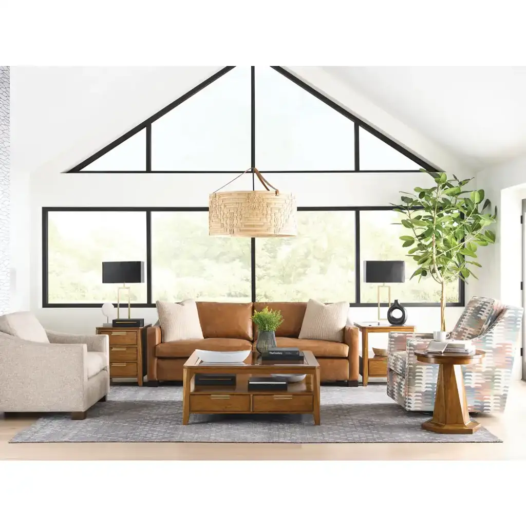 Elegance meets functionality in the Clarity Square Coffee Table from the Aspire Collection. Masterfully crafted from solid cherry, this sophisticated piece showcases the collection's signature post design, celebrating the wood's natural character and grace. Beneath its sleek beveled glass top lies a thoughtfully designed storage system featuring two full-depth drawers and a convenient shelf. The clean lines are beautifully complemented by framed solid wood end-panels, while custom inset hardware adds a refined touch. This transitional masterpiece strikes a perfect balance between classic craftsmanship and contemporary utility, creating a timeless centerpiece that elevates any living space.