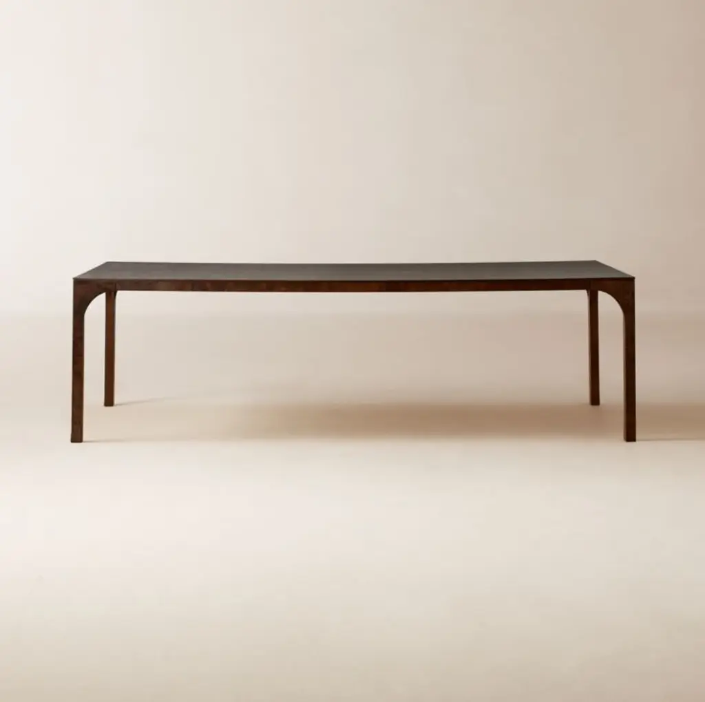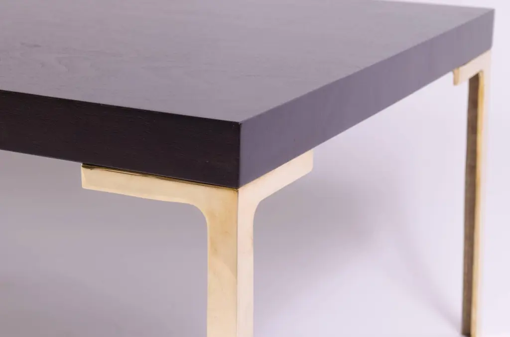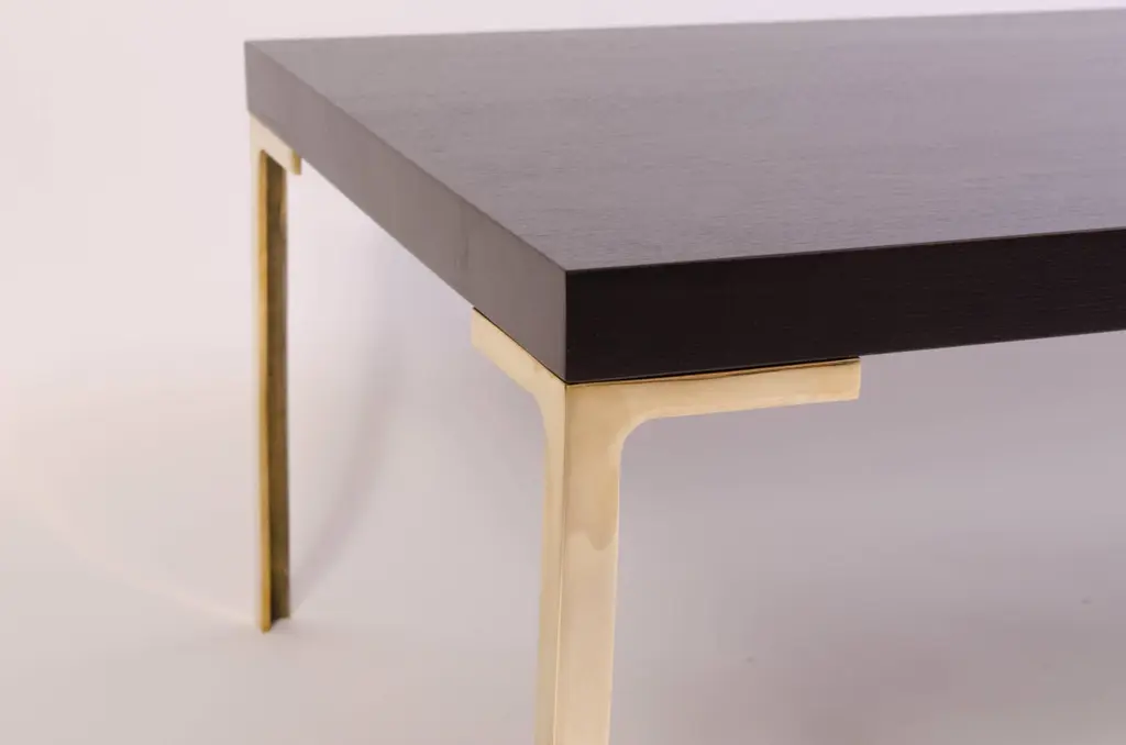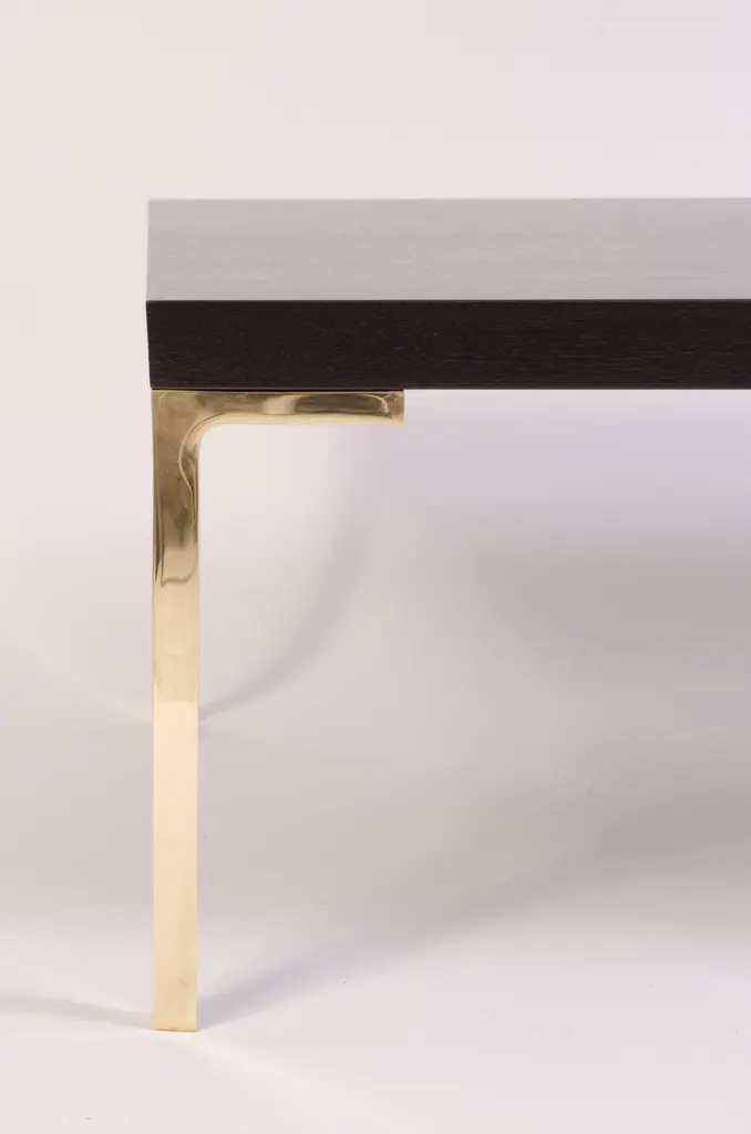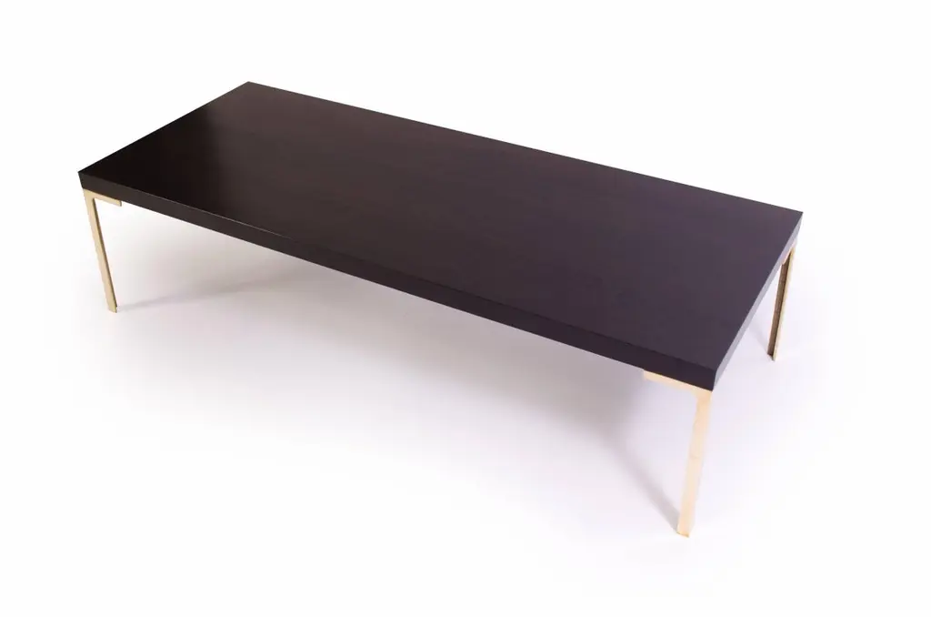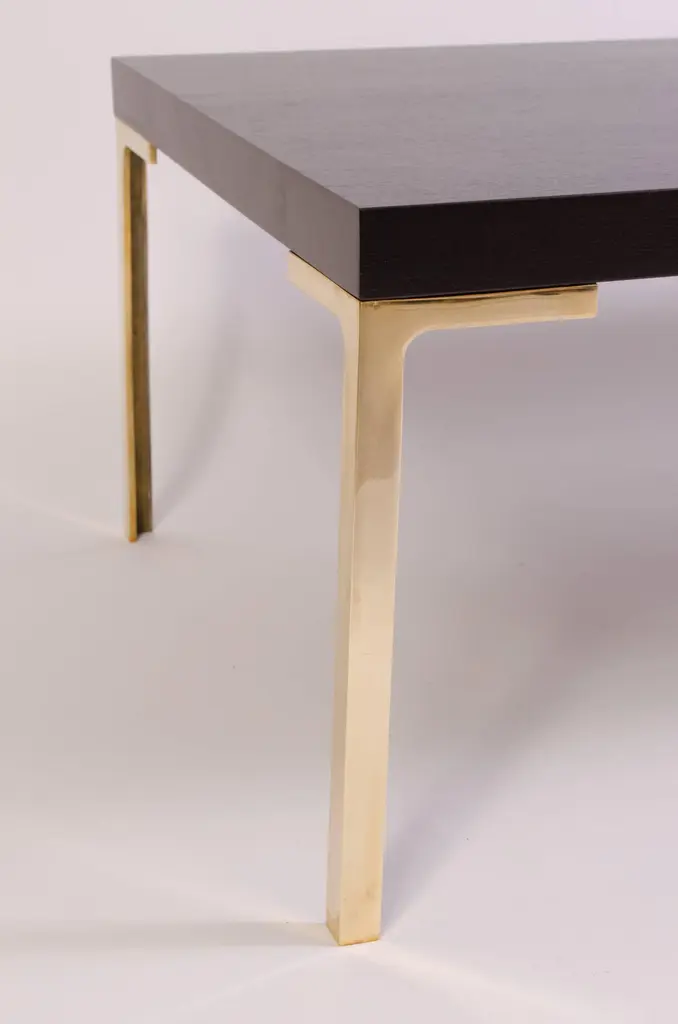 A stunning creation by Montage, the Astor cocktail table. This piece was designed with the Mid-Century in mind embodying delicate proportions and bold use of the highest quality materials. The table is topped with solid ebonized walnut, the stain is wonderfully executed to still allow the rich warm walnut grain to show through. The supports are hand-forged solid brass legs, angular in design, and pair wonderfully with the top creating a seamless Minimalist look. This item is made to order and the price listed represents the design as shown. We welcome custom orders and would be happy to provide a quote based on your specific dimensions. Please don't hesitate to contact us for more information. This piece is currently on view in our Stamford, CT showroom.