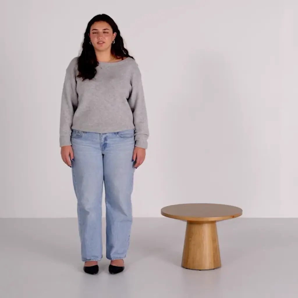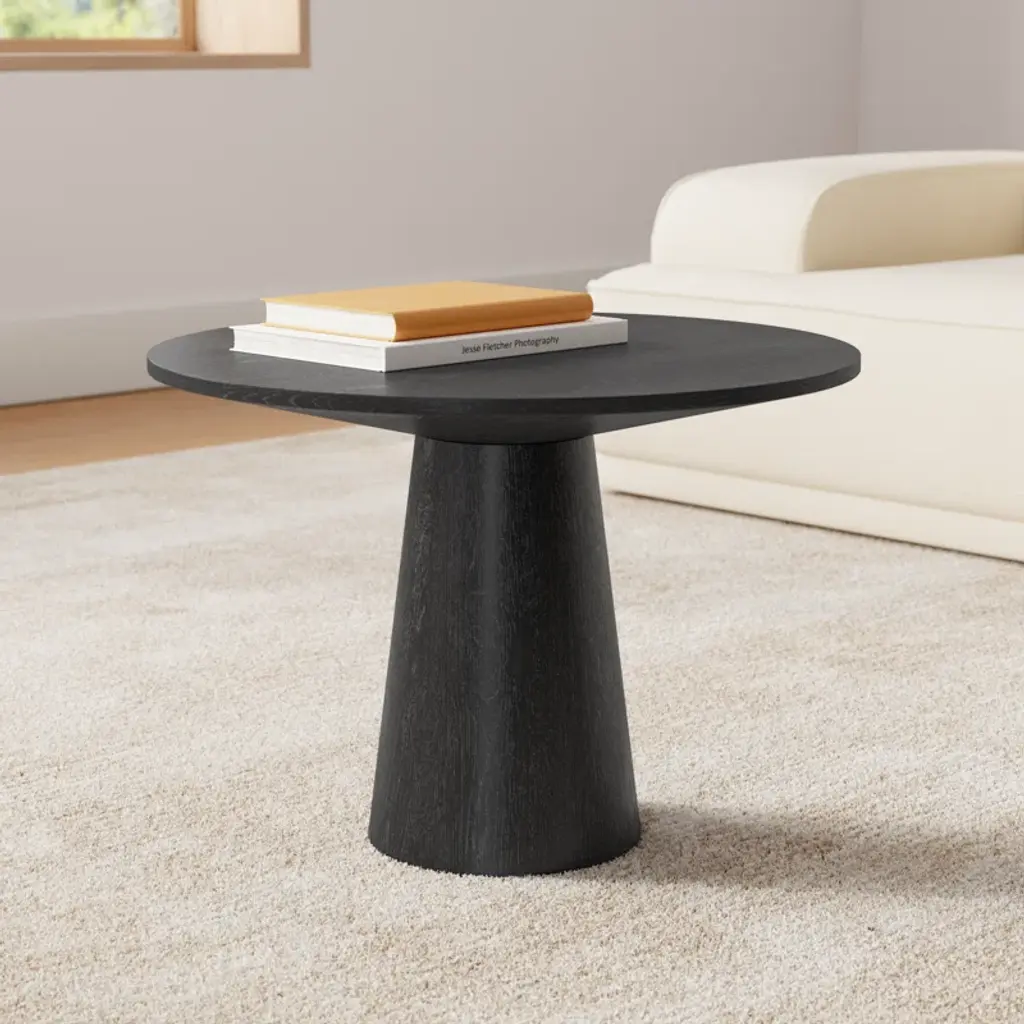 Form balance. Crafted from kiln-dried wood, this round coffee table features a circular top and tapered pedestal base for a minimalist aesthetic. The muted hue accentuates bold wood graining, while the scratch- and stain-resistant finish offers durability. Its fixed top provides ample space.