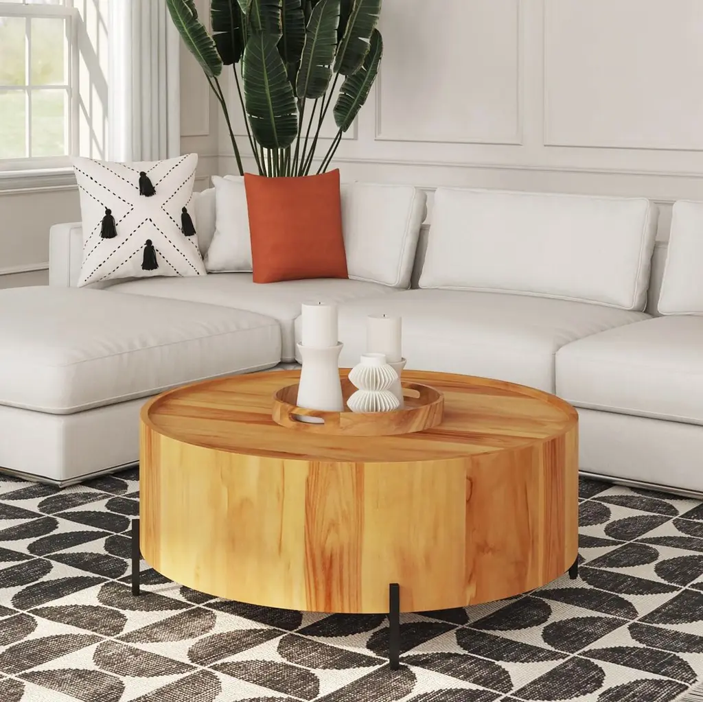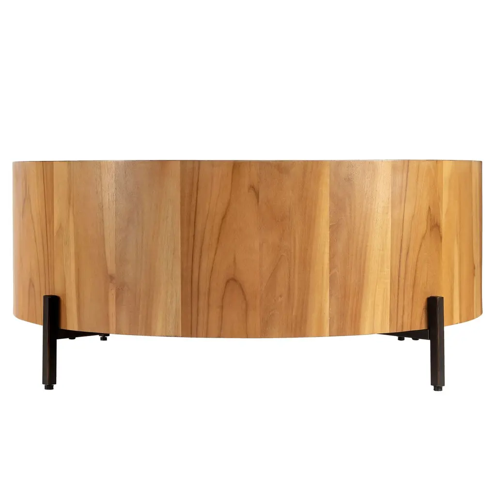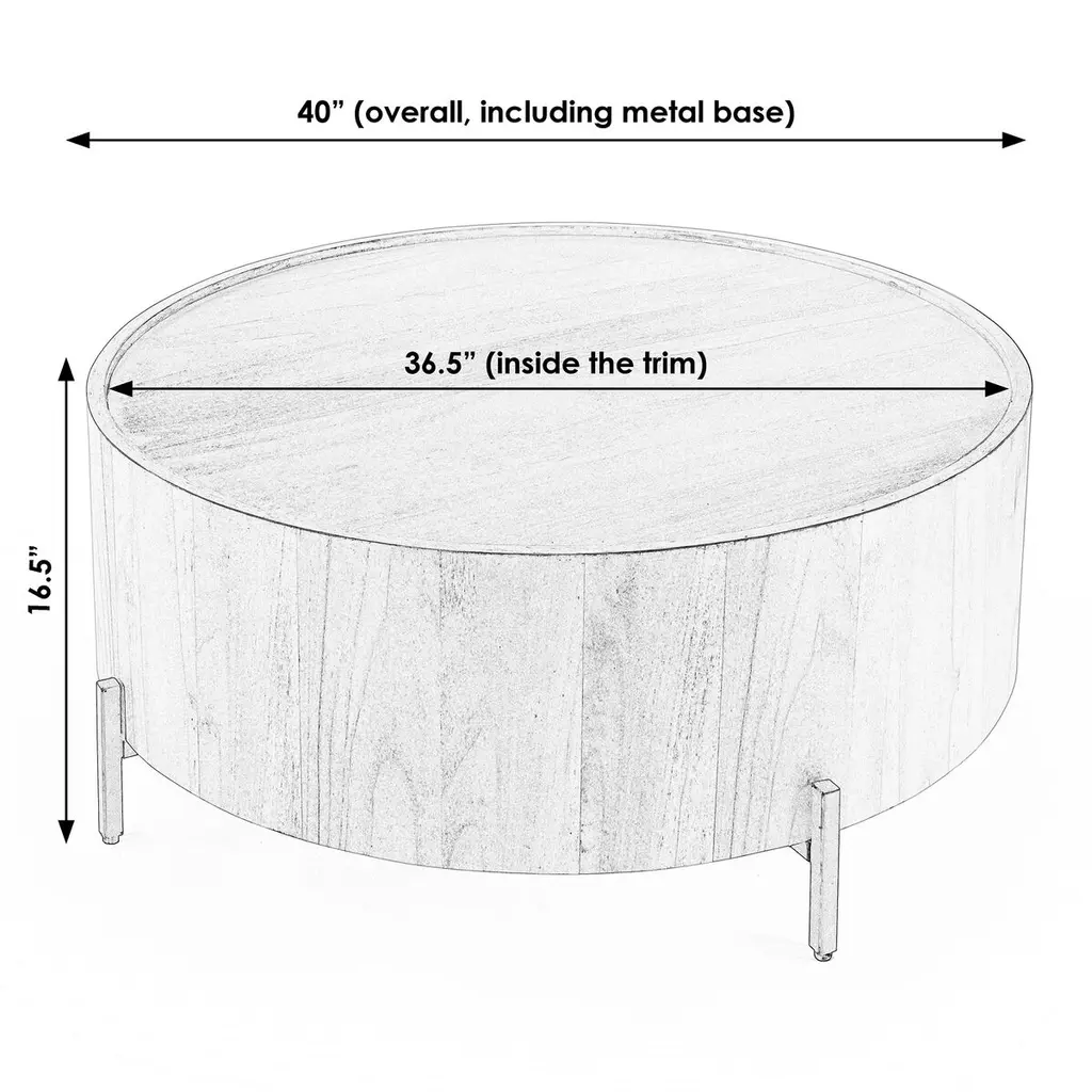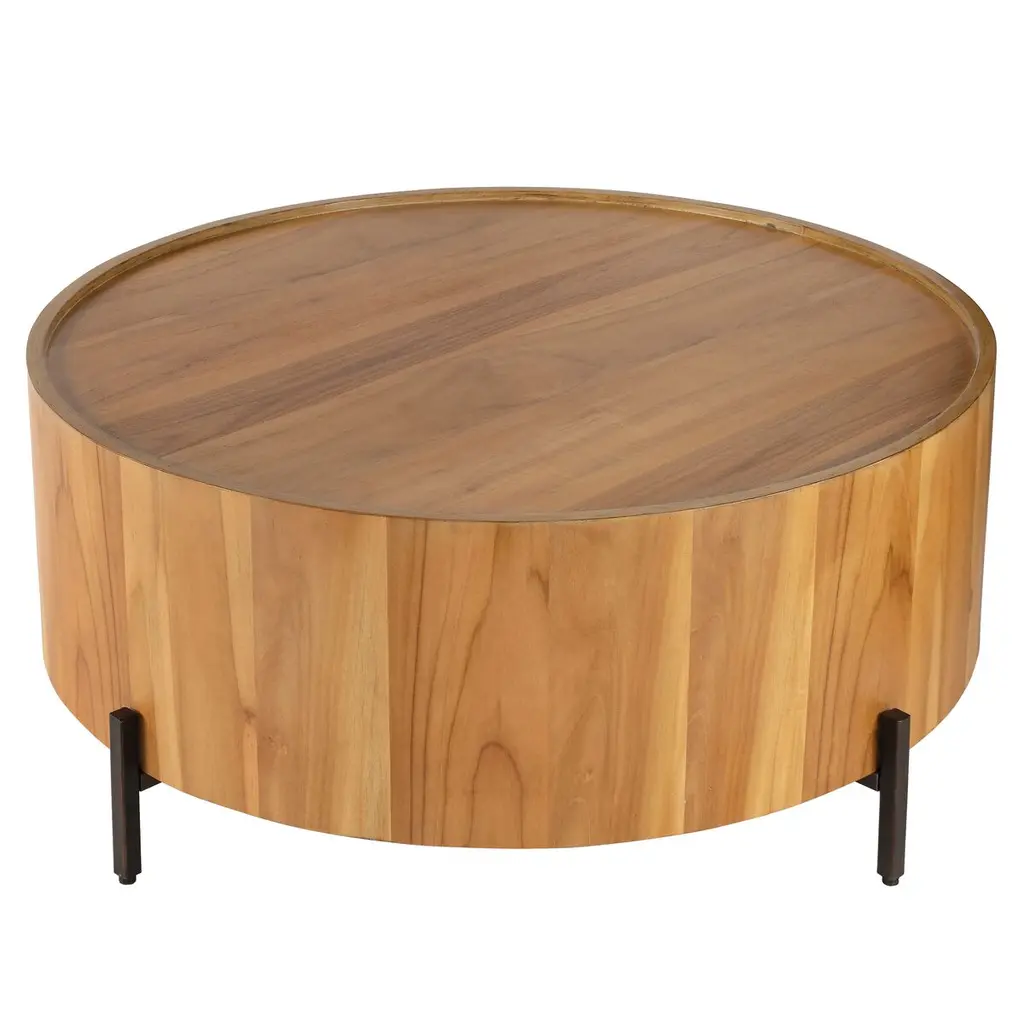 This magnificent modern industrial coffee table will be a statement piece in any living room or den. With its sturdy support from a distressed bronzed iron base and stake post legs, the round, drum-like top is a testament to expert craftsmanship. Its allure lies in the choice of finishes, each meticulously hand-crafted to perfection. This coffee table is not just a piece of furniture; it's a romantic centerpiece that invites conversation and admiration, blending seamlessly with your decor while standing out as a work of art.