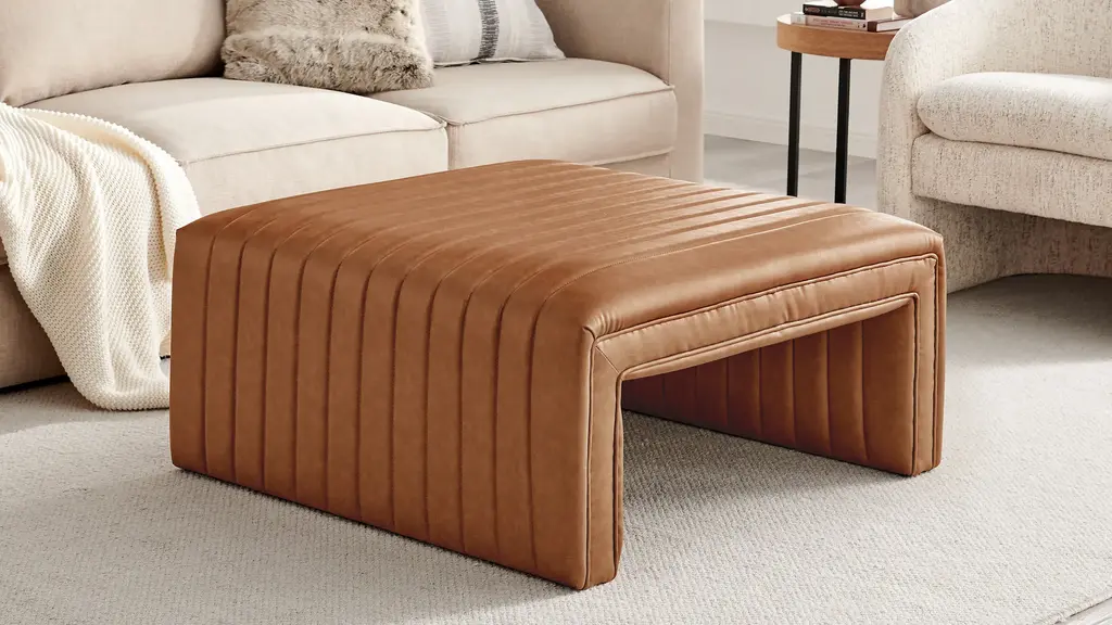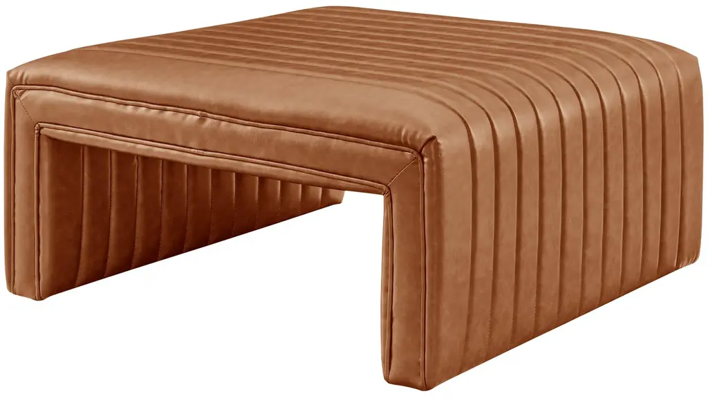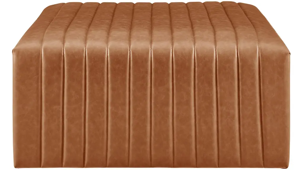 Atkinson Coffee Table for the living area is constructed of sleek, waterfall design featuring channel tufting, presenting a bold + modern aesthetic. In Vintage Cider tone faux leather, it also provides generously proportioned top that measures. Fully Assembled.