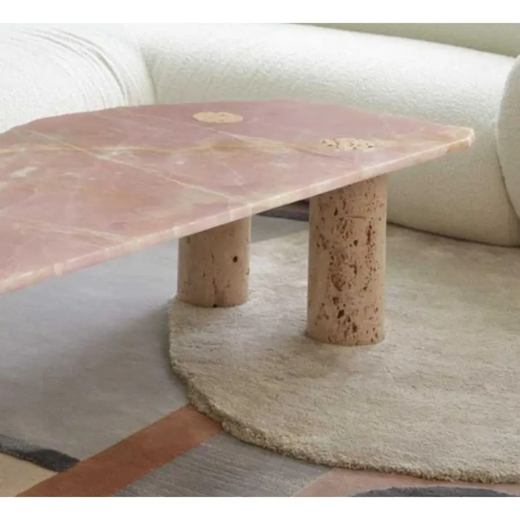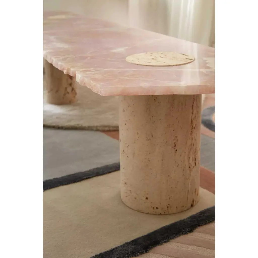 Atlas Coffee Table by Patricia Bustos de la TorreDimensions: D 68 x W 166 x H 40 cm.Materials: Polish onyx and Navona travertine marble.The Atlas Coffee table has been baptized after its resemblance with a map,showcasing irregular edges and an imperfect surface. It is a three legged low table with pure aesthetic ambivalence. Its tabletop, made of polished onix, coexist with the honed finish of its navona travertine legs, achieving the perfect balance between lightness and heaviness, translucent and opaque, smooth and rough. Adaptable to any interior/exterior space.Atlas is the piece of art capable of transforming any dull and uninspiring.Patricia Bustos is an internationally renowned Spanish artist known for her work designing utopian pieces and spaces. Her creative gaze becomes an act of rebellion and her projects are full of a disruptive narratives that evolves with social trends. Her work is imbued with deep meaning because of her endless curiosity for the human being and its concerns such philosophy, language, architecture, art and nature. Her objects are handcrafted and aim to become cult pieces. Her work seeks to evokeaesthetic emotion trough a unique story behind every design. That is why wonder is the cornerstone of her work. The indelible memory that inspires us eternally comes from wonder. Through a bold use of color and an unexpected combination of shapes and materials, she is looking for contrast. Her pieces are distinguished by translucent or reflective elements juxtaposed with handmade or raw materials. As a result, her proposal achieves an atypical and fascinating balance at the same time. In her own words: "The purest beauty lies at the boundary between craftsmanship and utopia".