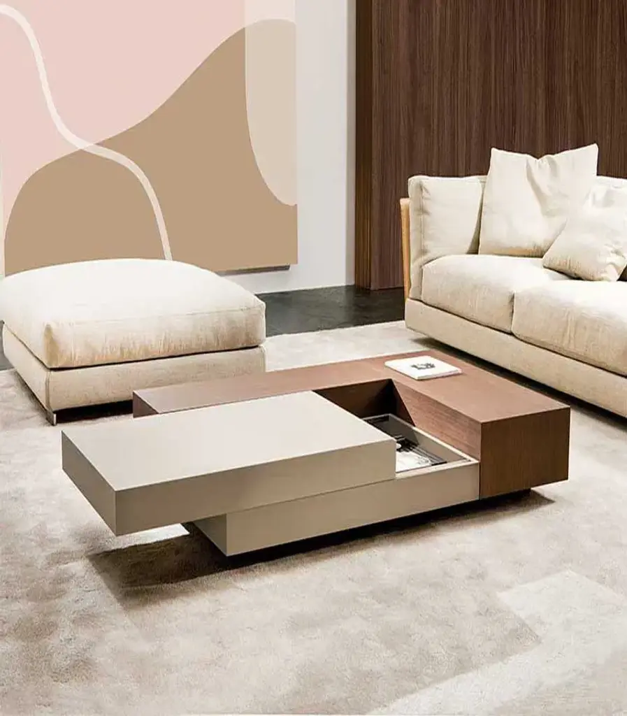 ATOLLO is a low coffee table with a storage compartment, featuring an elegant and functional design.In a modern living room, it’s essential to combine aesthetics with the functionality of furnishings.Atollo offers a versatile solution thanks to its sliding top, which opens to reveal a practical storage compartment.The combination of different wood finishes and colors allows you to give the living room either a more understated and elegant touch or a lively and modern look.Low table with ash wood veneer tops. Sliding top made of wood fiber over the storage compartment.