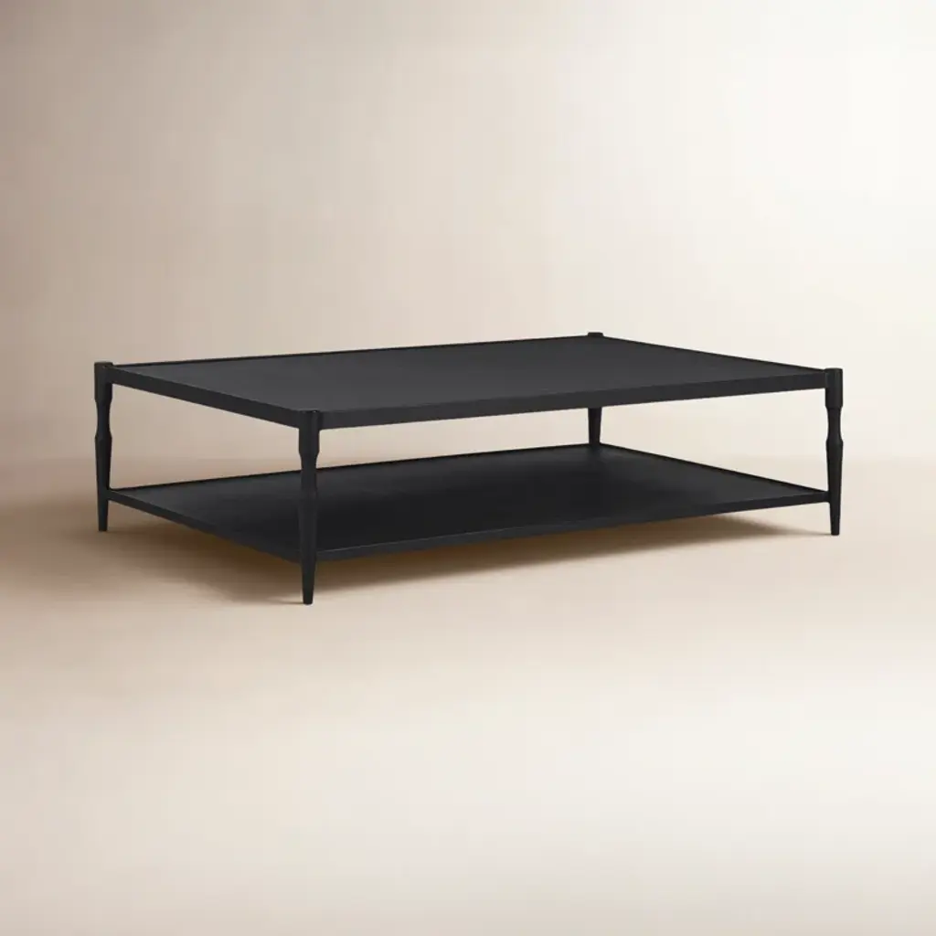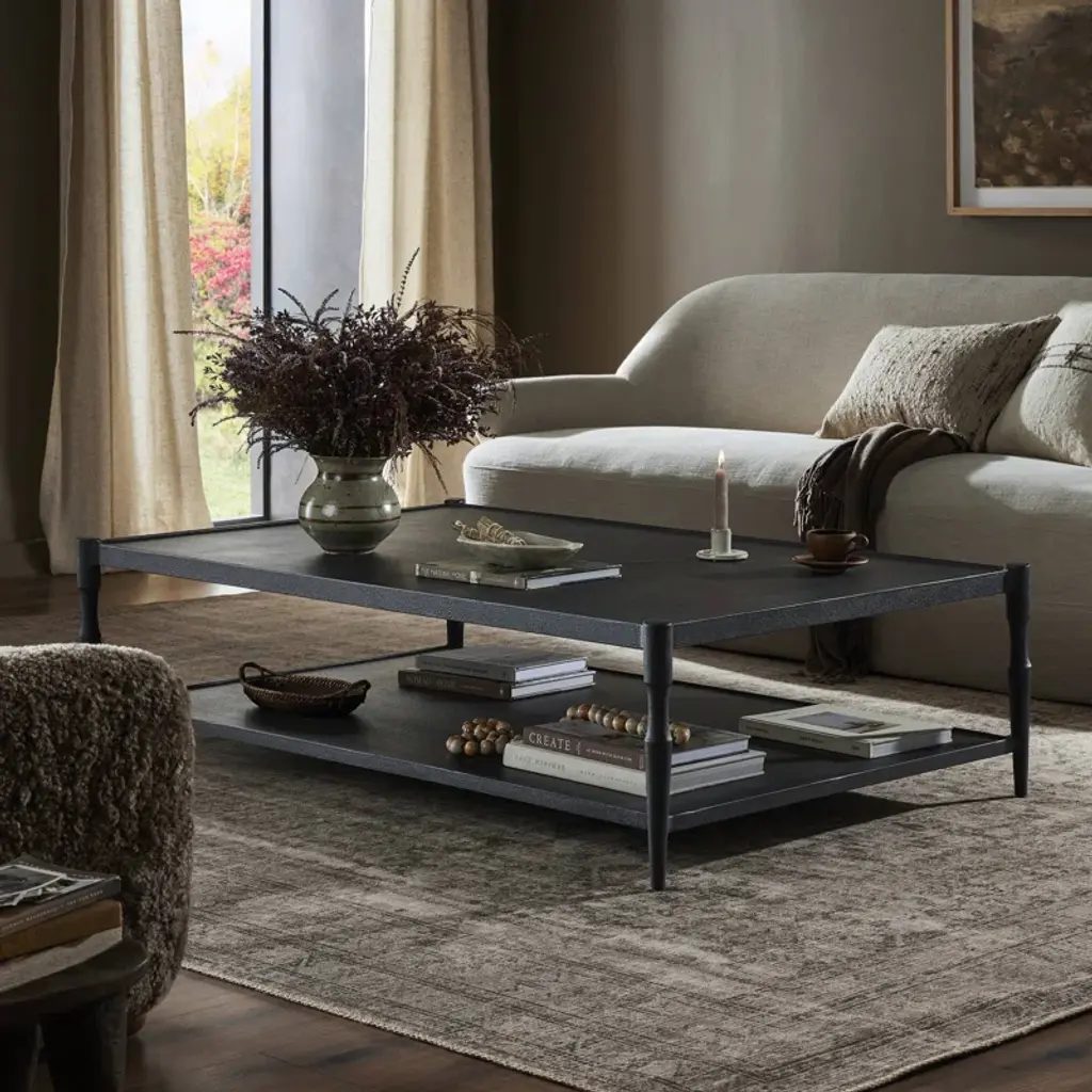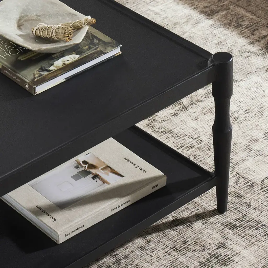 A design collaboration by Amber Lewis and Four Hands. Simple and turned, textured cast iron legs frame a tray-style top, with lower shelving for bonus storage and display. A classic black finish works this coffee table into any space or style with ease.