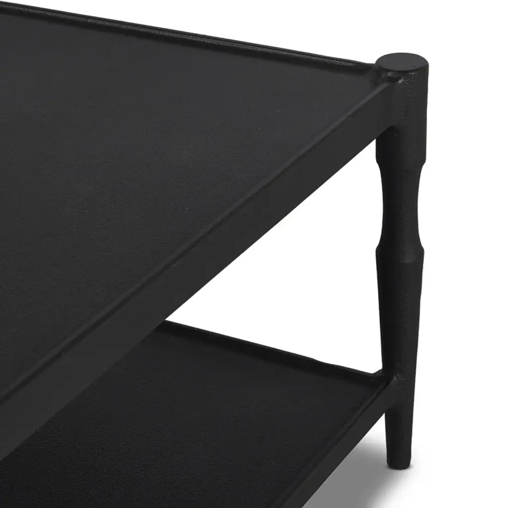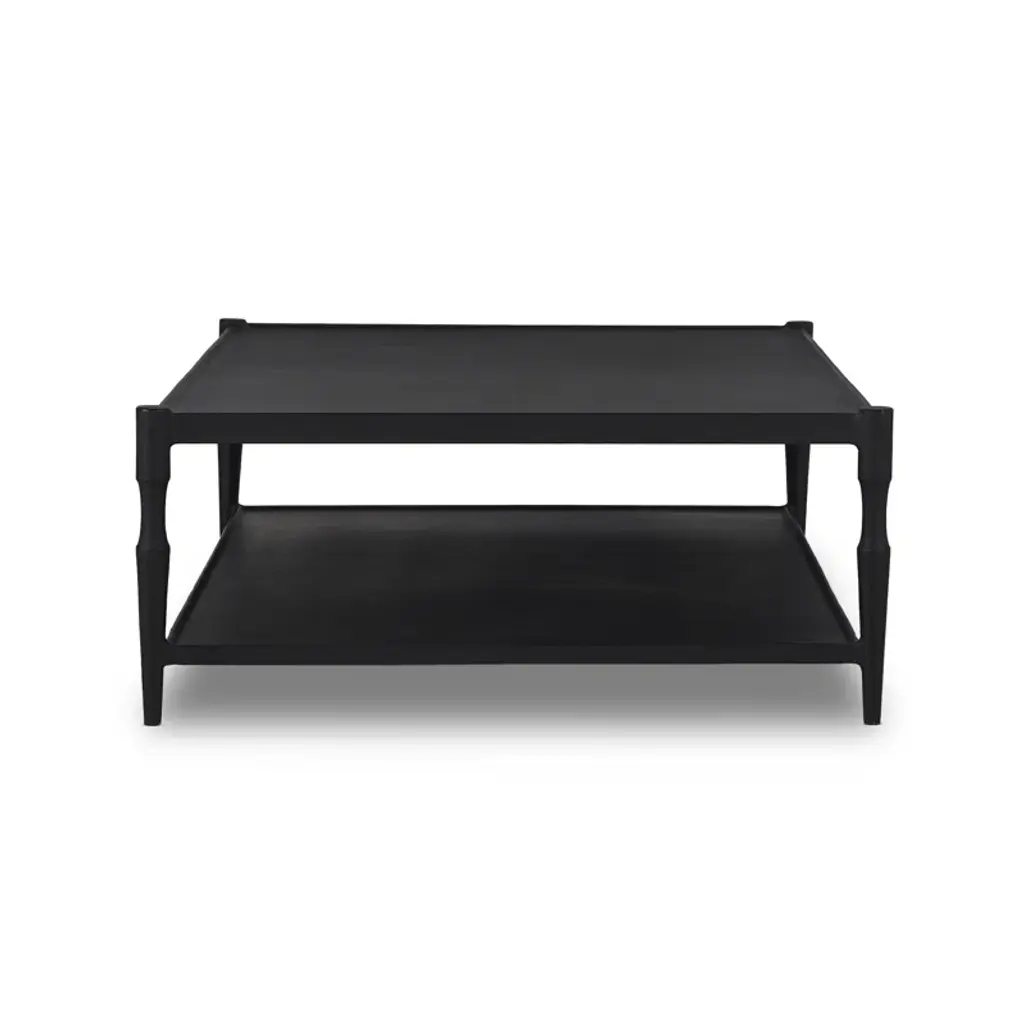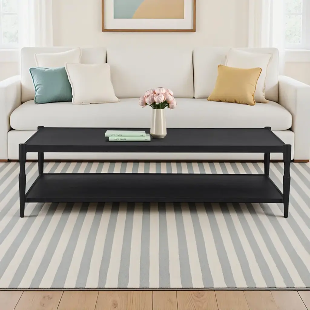 A design collaboration by Amber Lewis and Four Hands. Simple and turned, textured cast iron legs frame a tray-style top, with lower shelving for bonus storage and display. A classic black finish works this coffee table into any space or style with ease.