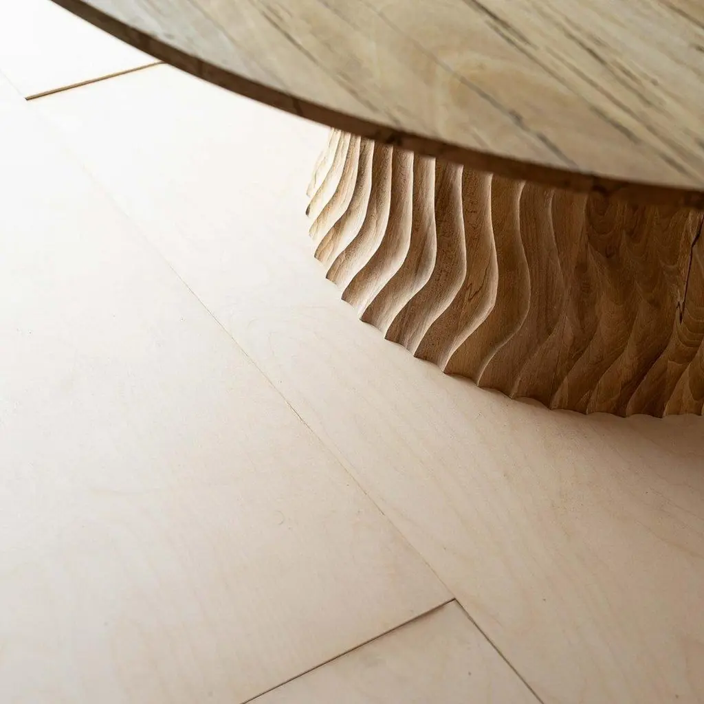 Aurora Coffee Table by MythologyDimensions: D 120 x H 40 cmMaterials: Beech.A sculptural centerpiece, the Aurora coffee table is made from solid English beech. The piece features a wavy hand-carved base, with visible chisel marks to reveal the hand of the maker. The construction of the hollow conical base draws on traditional coopering (barrel-making) techniques. The tabletop features a deep bevel, adding a sense of lightness, while maintaining its structural integrity.Mythology is a design and craft studio, founded by Sam Pearson and Anna Kidel, based in Bristol, UK.Celebrating natural materials, our designs combine bold, contemporary design with thoughtful craftsmanship.Blurring the lines between sculpture and function, we create furniture to define the space it lives in, while honouring the natural beauty of the materials we work with. We often incorporate organic carved textures into our work, inspired by the environment around us, creating an invitingly tactile surface.