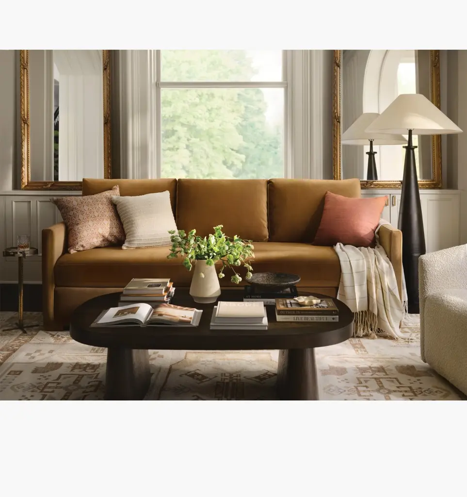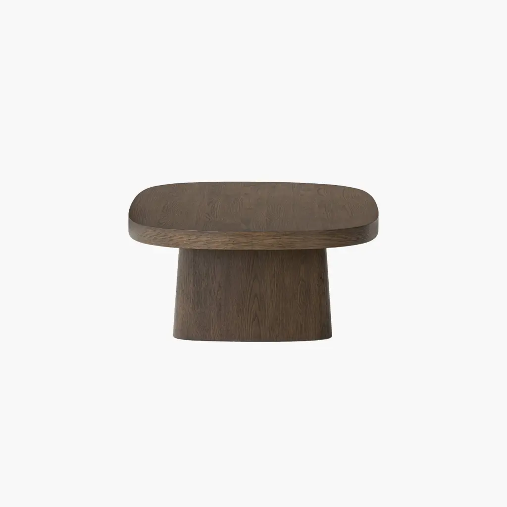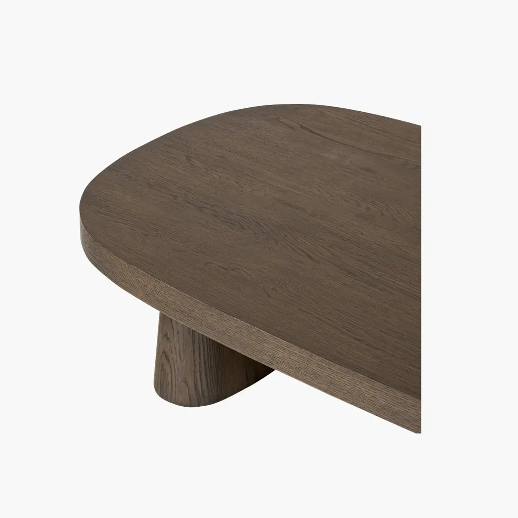 A coffee table crafted from rustic brown oak is streamlined while not short on presence, with its exaggerated cylinder legs and polished pill-shaped top. 55" W x 35" D x 16" H Shipping box: 60" W x 39" D x 17" H, 121lbs Assembly not required Receives Threshold delivery