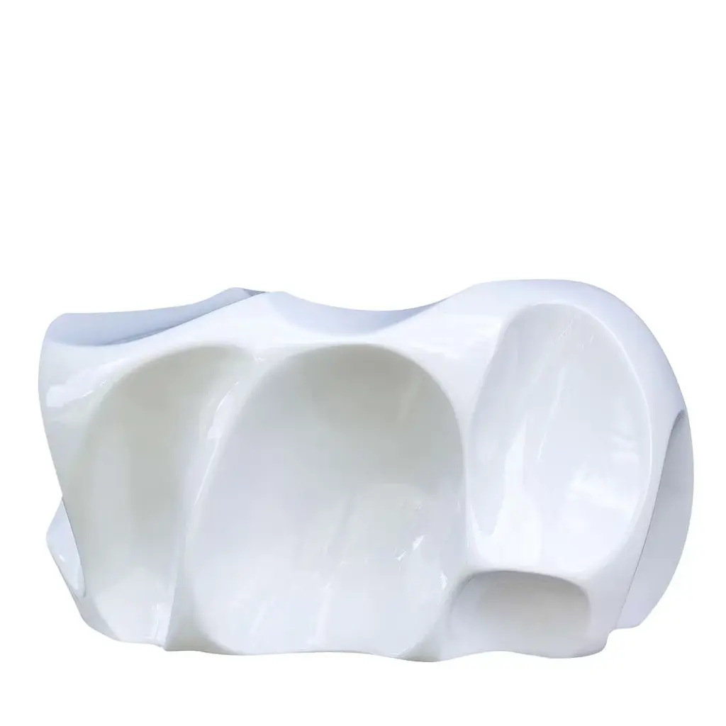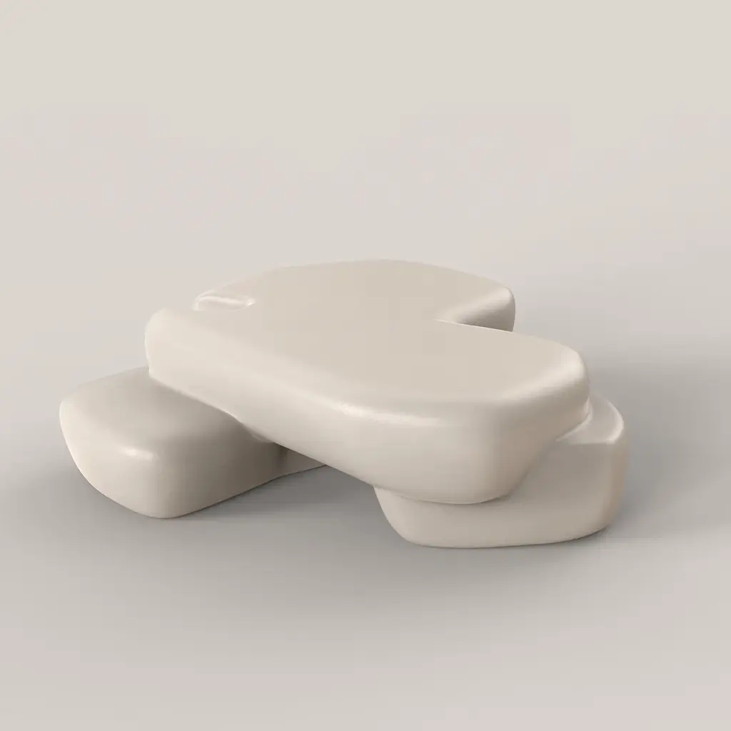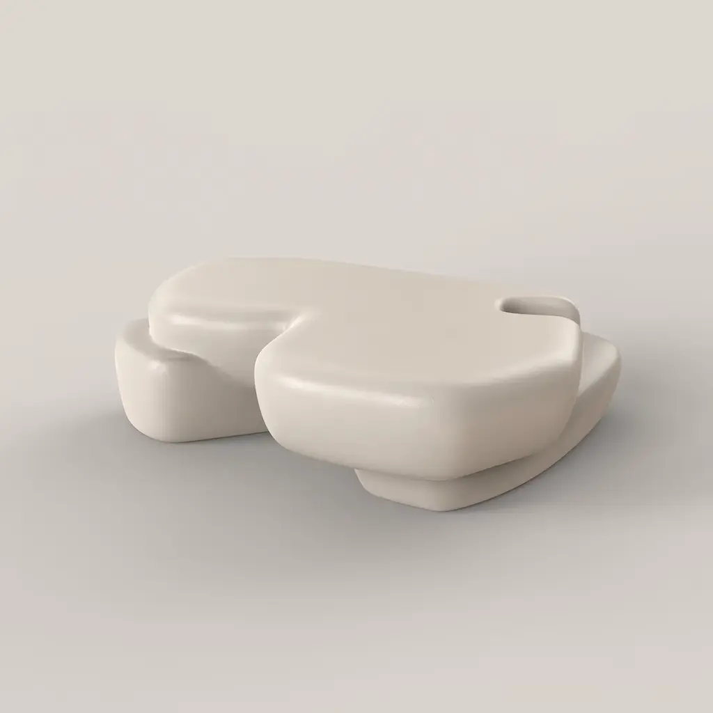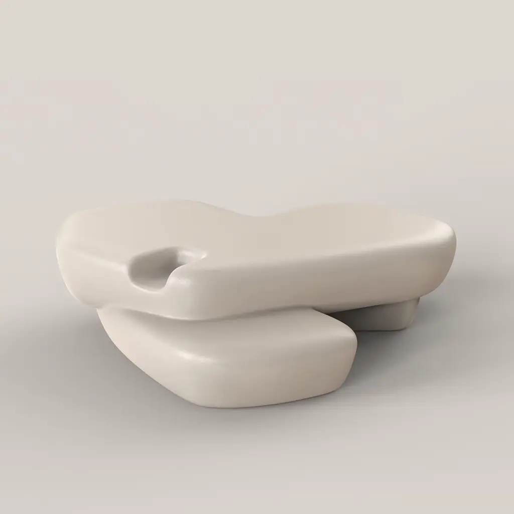 Ava low table, made of resin-coated polystyrene, consists of three large sculpted volumes stacked on top of each other. The design evokes a soft, light sculpture resembling stones eroded and shaped by time. Limited edition of 150, each piece includes a numbered metal plaque for authenticity. Customization options are available, please contact the concierge for more information.