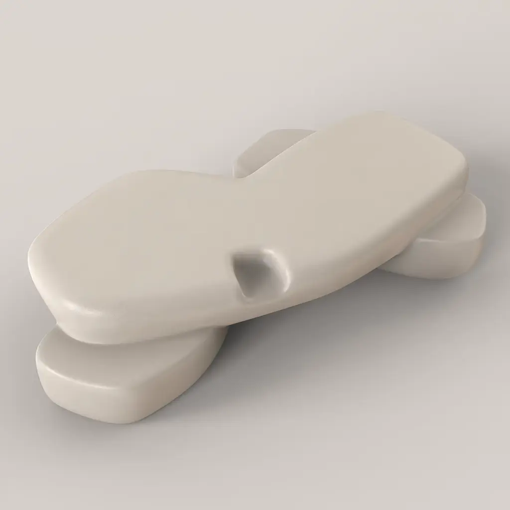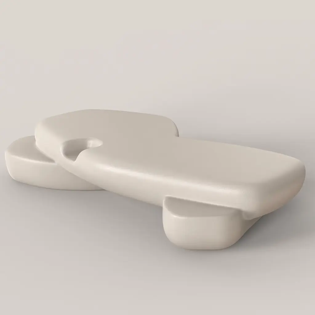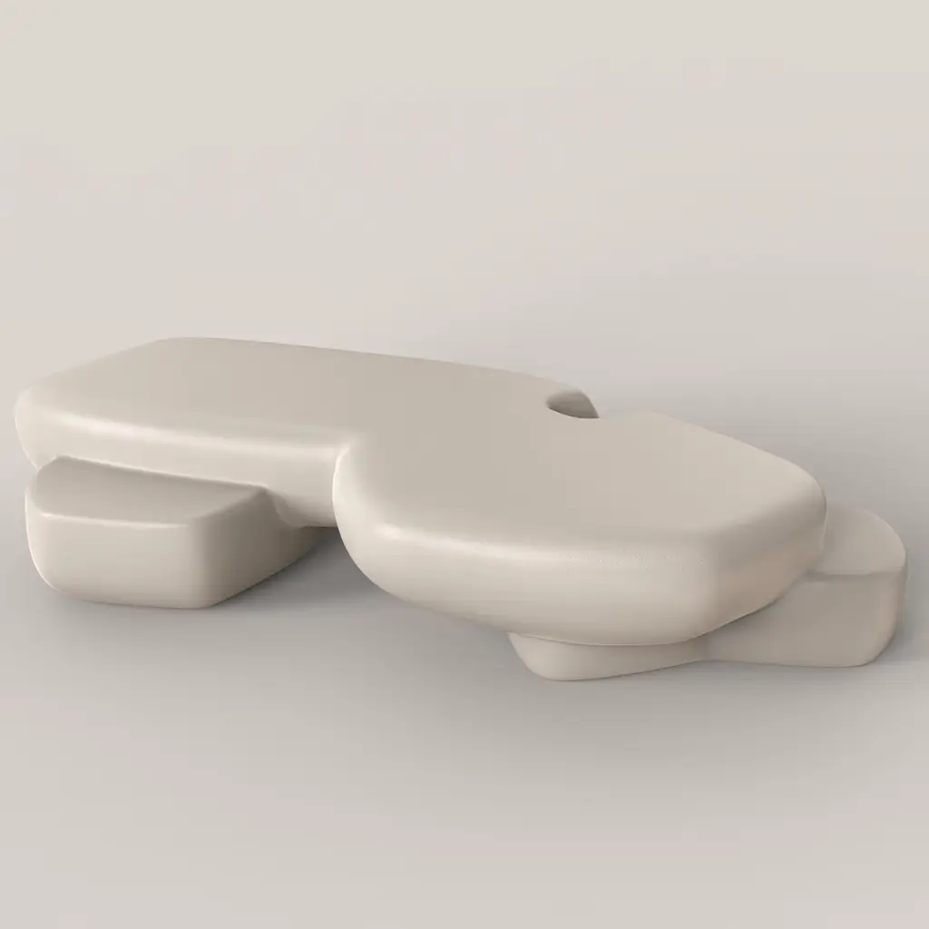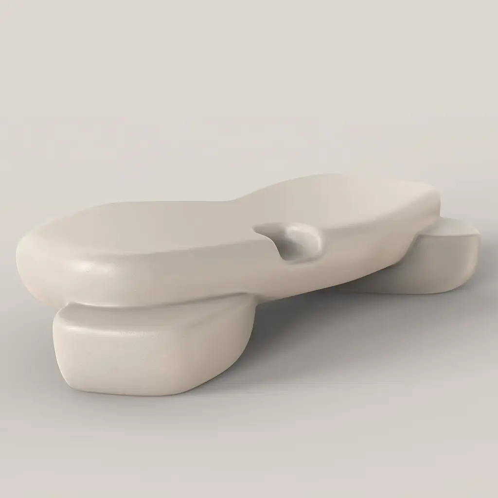 Ava low table, crafted from resin-coated polystyrene, features three sculpted volumes stacked atop each other. The piece is a soft, lightweight sculpture, resembling stones worn and melted by time. Limited edition of 150, each with a numbered metal plaque for authenticity. Customization options are available, please contact the concierge for more information.