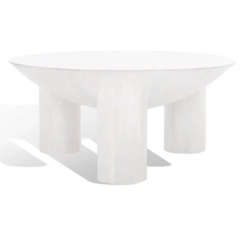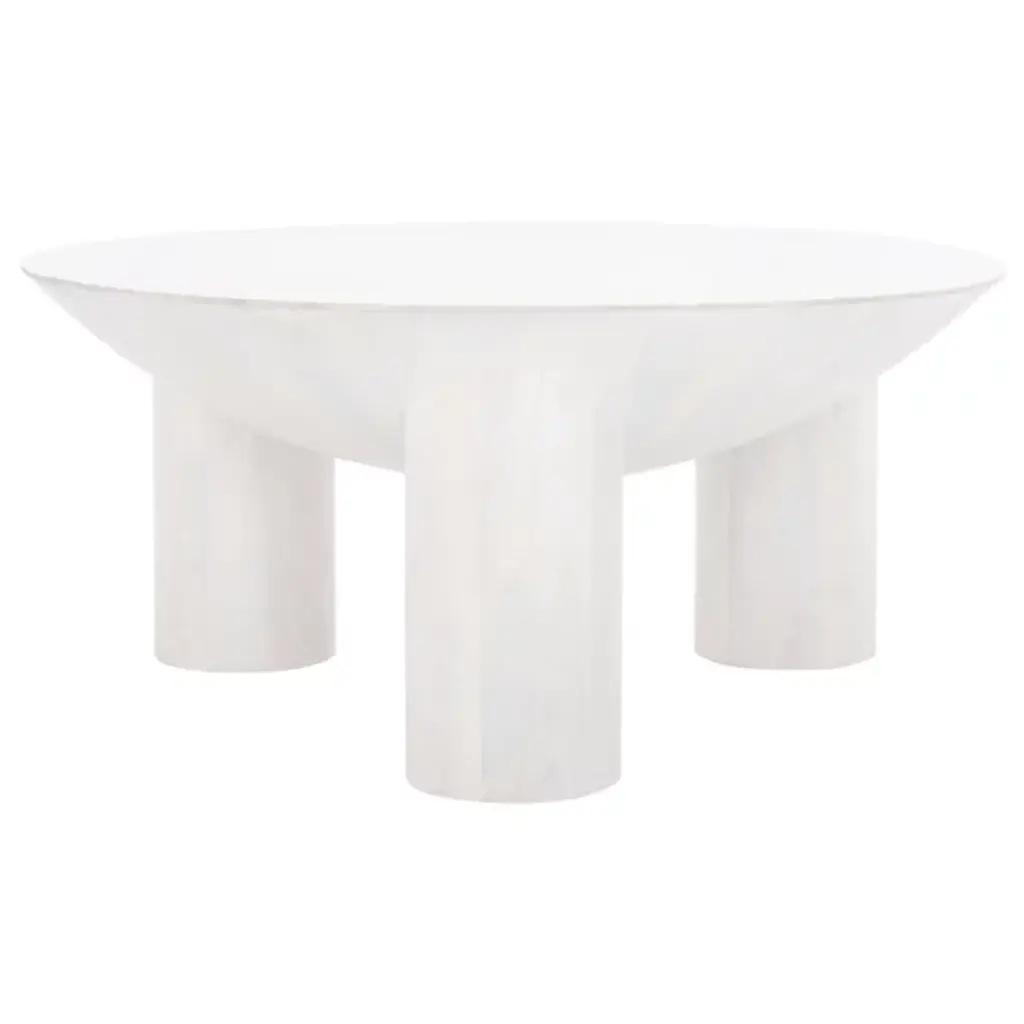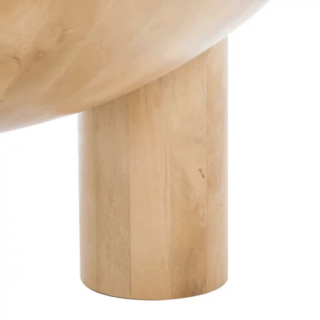 The Avely Wood Coffee Table is presented by Alder & Ore. It is a statement piece that combines a bold and playful design with a captivating sculptural silhouette. Its asymmetrical structure adds an element of intrigue and uniqueness to any living space. The table stands on three chunky cylindrical legs, further enhancing its distinctive aesthetic. Crafted with solid mango wood, the Avely Coffee Table boasts both strength and natural beauty.