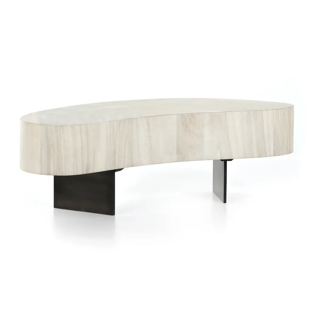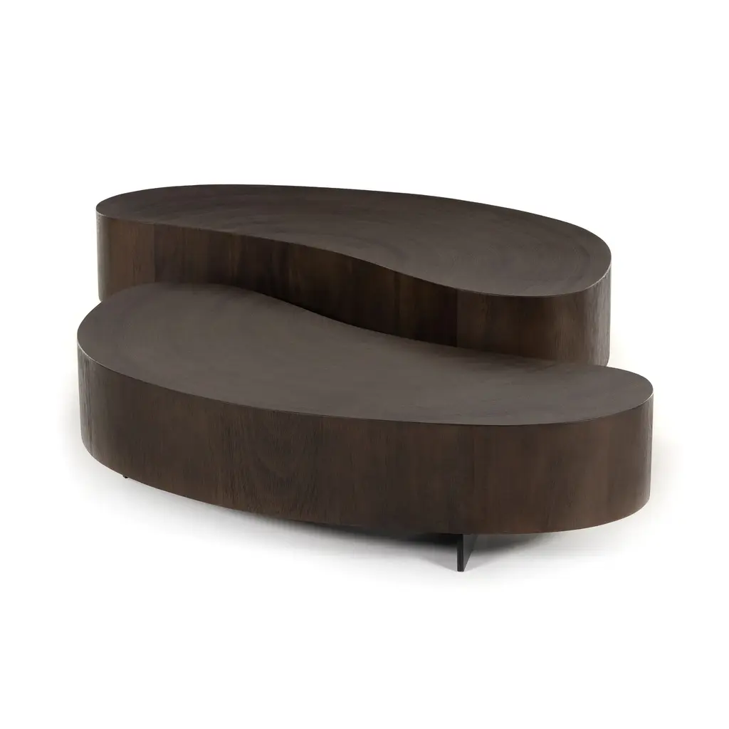 The Avett Coffee Table from Four Hands adds an elegant and sophisticated touch to any living space. Its captivating kidney-shaped design, crafted from oyster-cut Guanacaste wood with captivating visible rings, showcases natural graining. Its gunmetal-finished base adds a modern touch to the look, perfect for giving any room a touch of high-end luxury. Highlights