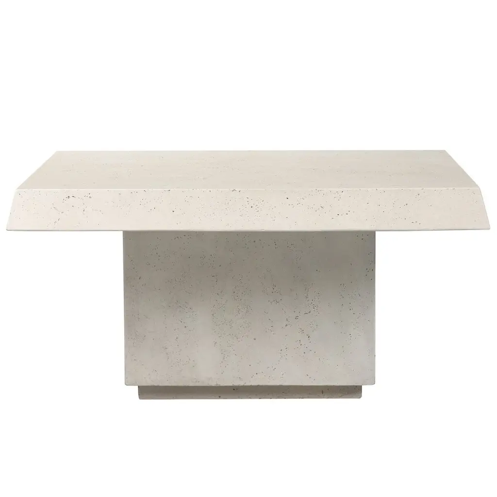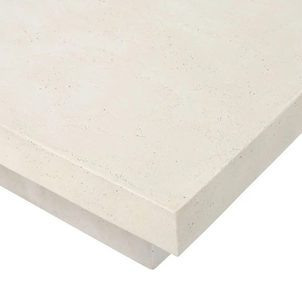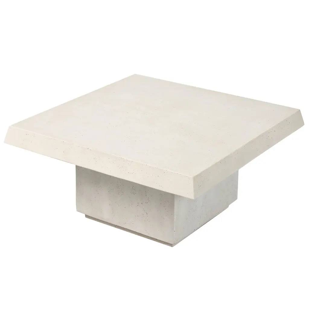 Simply shaped with a square pillar and subtle plinth base, this outdoor coffee table features a soft, parchment feel, complemented by a reverse bevel edge for visual intrigue. Cover or store indoors during inclement weather and when not in use.